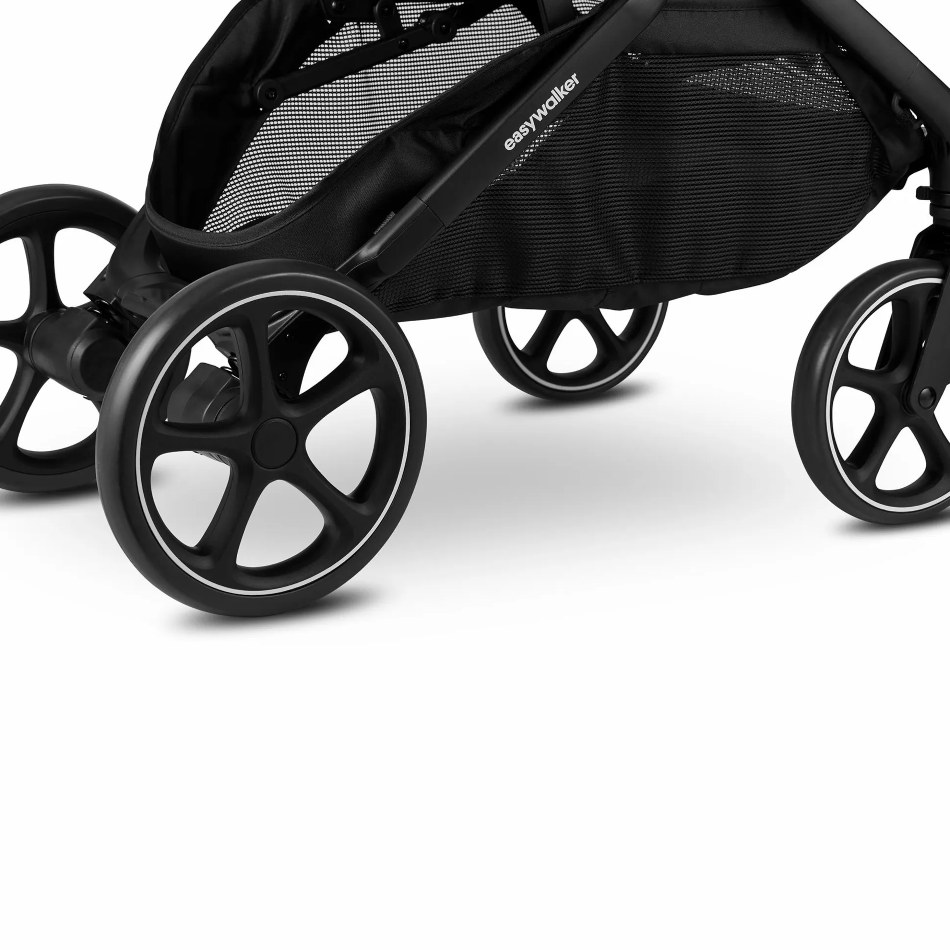 Für eine angenehme Fahrt sorgen die großen Räder: easywalker hat bei dem Rockey eine 4-Rad-Federung mit Bremssystem mit Anzeige für die Sicherheitsverriegelung integriert.