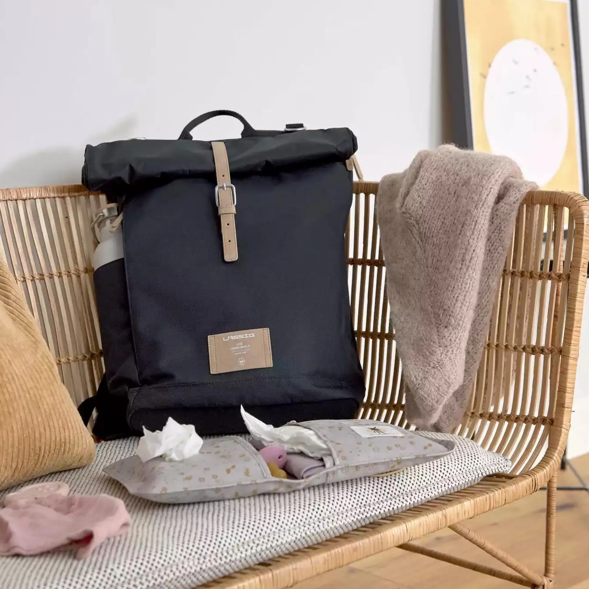 Ein Feuchtfach vorne, Reißverschlussfach am Rücken sowie praktisches Zubehör machen ihn zum perfekten Accessoire für Eltern.