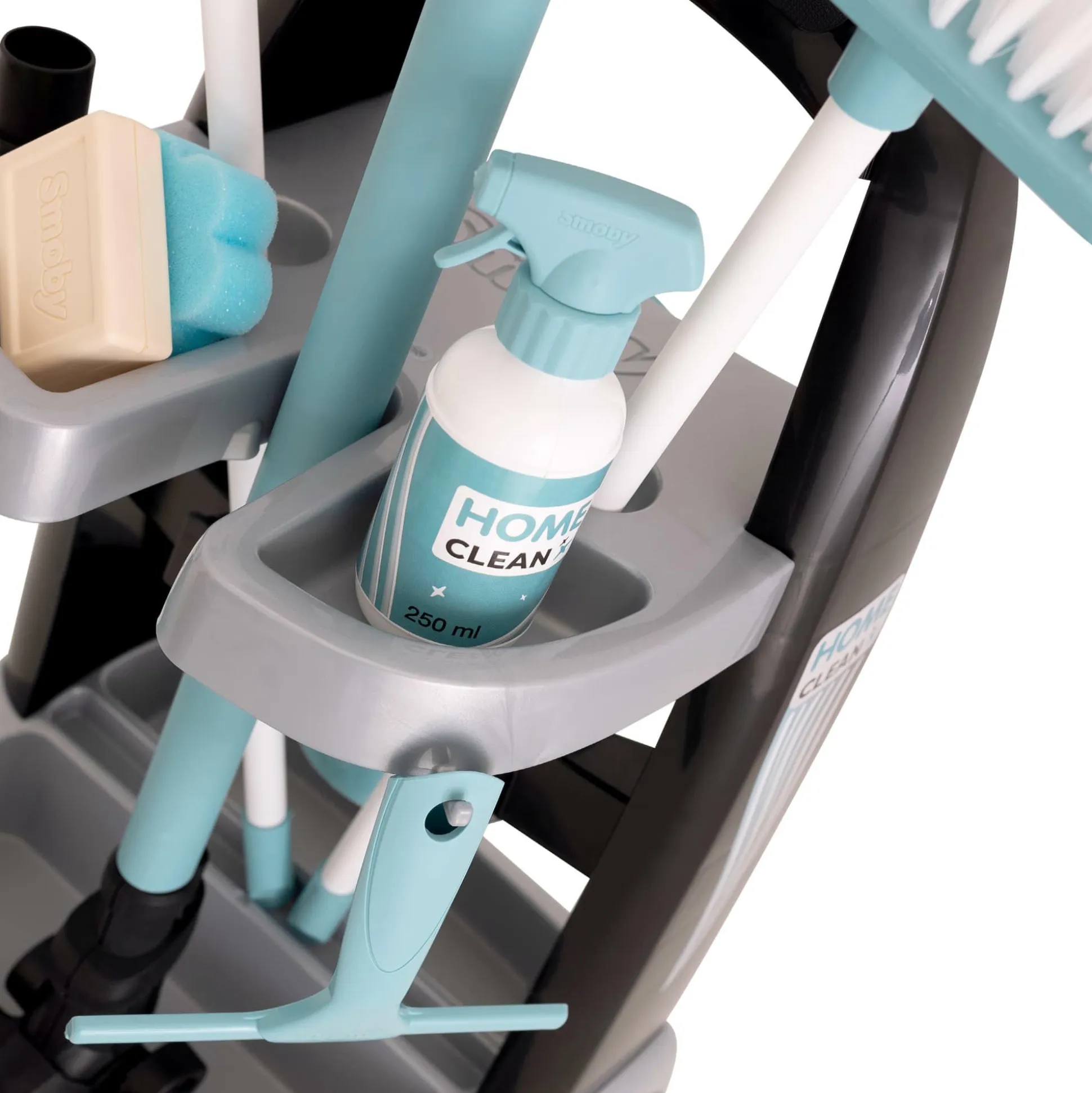 Mit dem Smoby Reinigungstrolley und dem originalgetreuen Rowenta Kinderstaubsauger wird dein Kind zum kleinen Putzprofi! Dein kleiner Schatz kann nun spielerisch Mama und Papa beim Saubermachen unterstützen. Der Reinigungswagen ist kinderleicht zu bewegen, perfekt dimensioniert und enthält alles, was dein Kind für die Haushaltsarbeit benötigt: einen Kinderbesen, ein Kehrset, einen Wischmopp, einen Fensterabzieher, einen Schwamm, Spielzeug-Putzmittel und das absolute Highlight des Trolleys – einen originalgetreuen Rowenta Kinderstaubsauger!