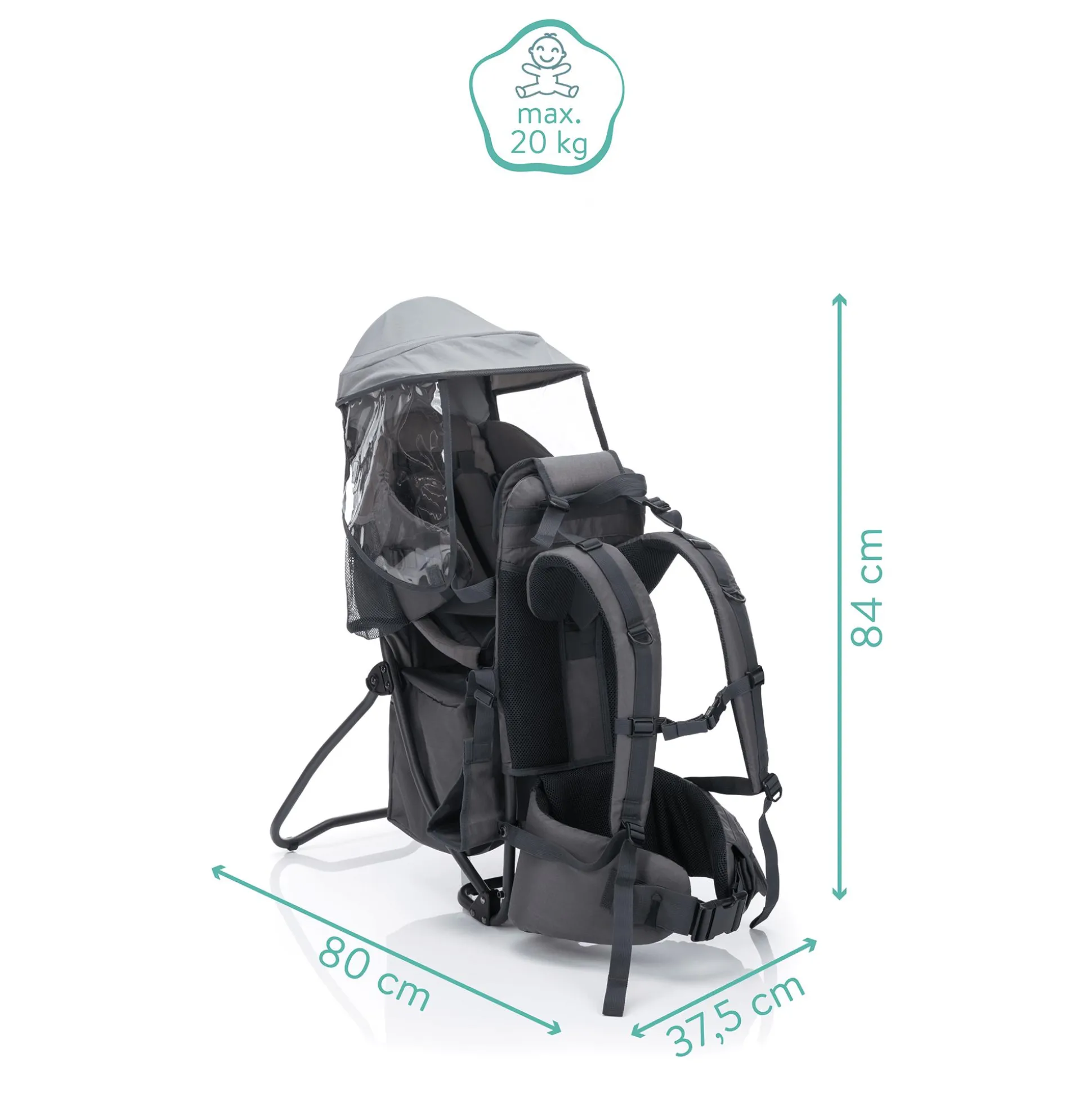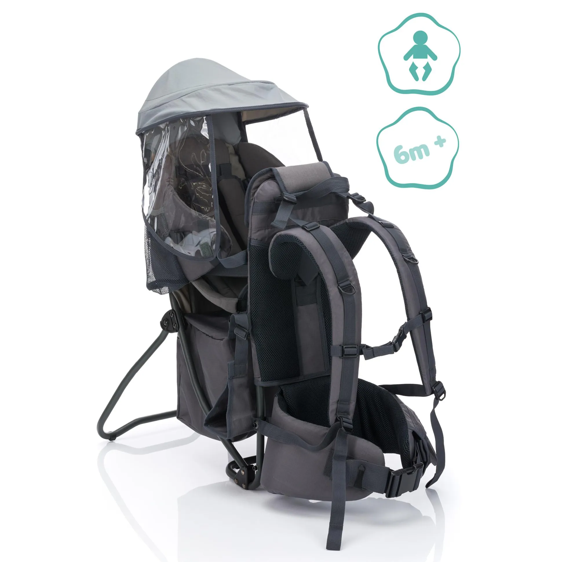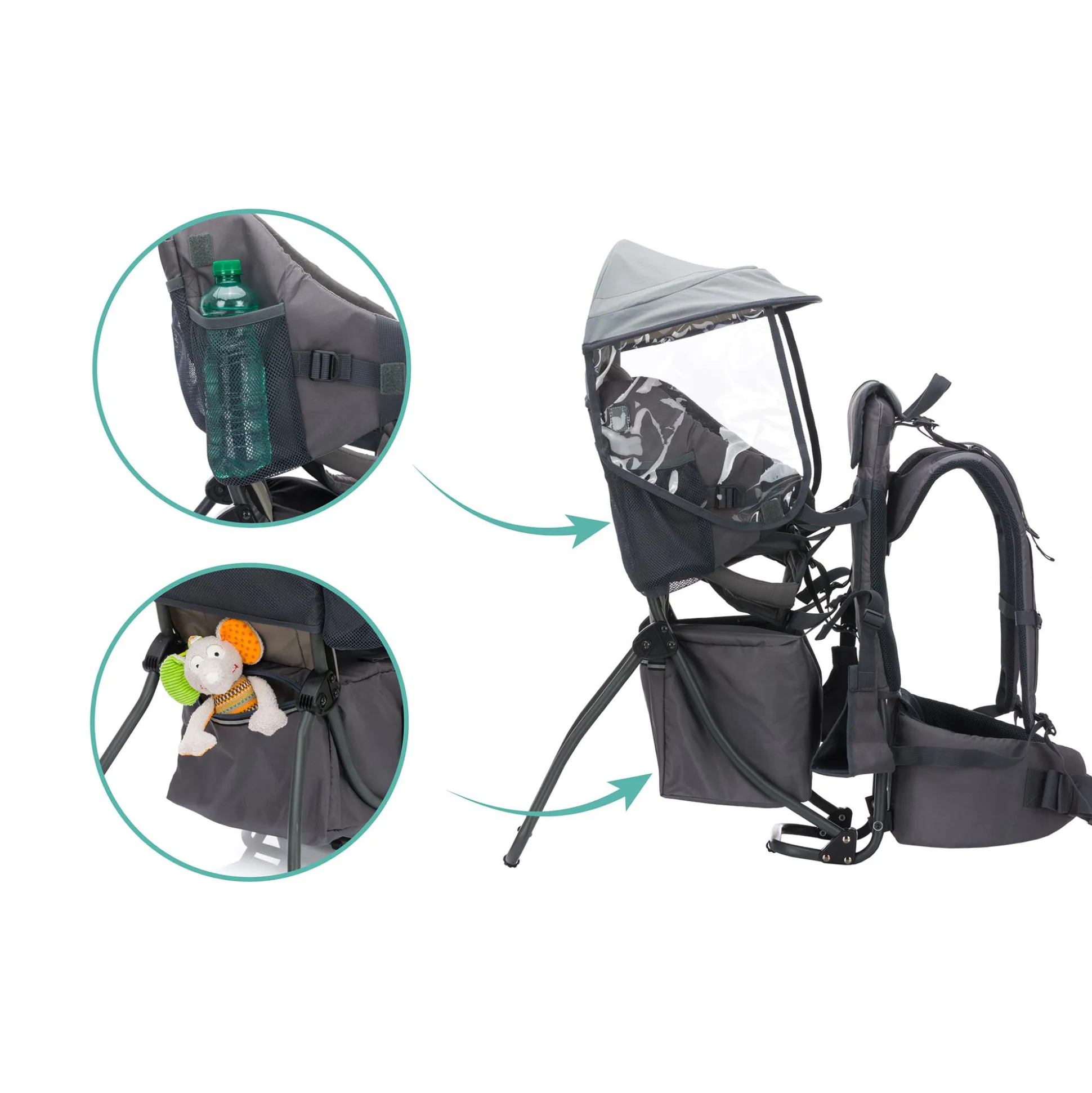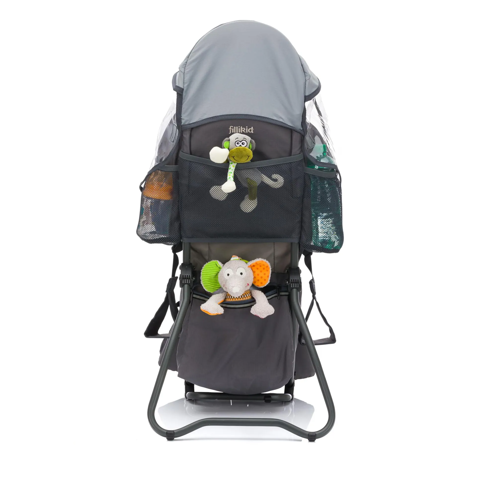 Genauso komfortabel präsentiert sich die Rückentrage für dein Kleines: Während die weiche Polsterung der Sitzfläche einen herrlich bequemen Sitzkomfort verspricht, sorgen die Fußschlaufen für eine optimale Entlastung der Beine. Gleichzeitig schützen spezielle Sicherheitsgurte vor dem Herausfallen – und das große Wetterschutzdach vor Sonne und Regen. Ebenso praktisch: Für Ersatzkleidung, Proviant & Co. verfügt die Rückentrage Elite über ein geräumiges Utensilienfach.