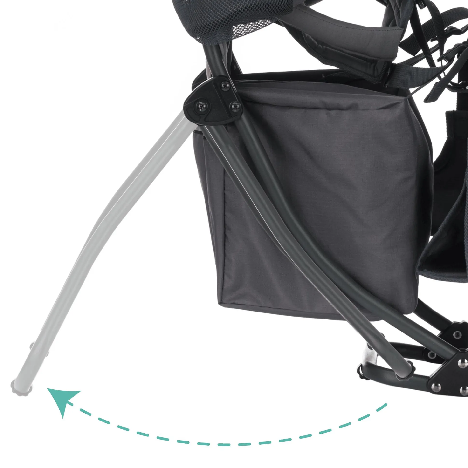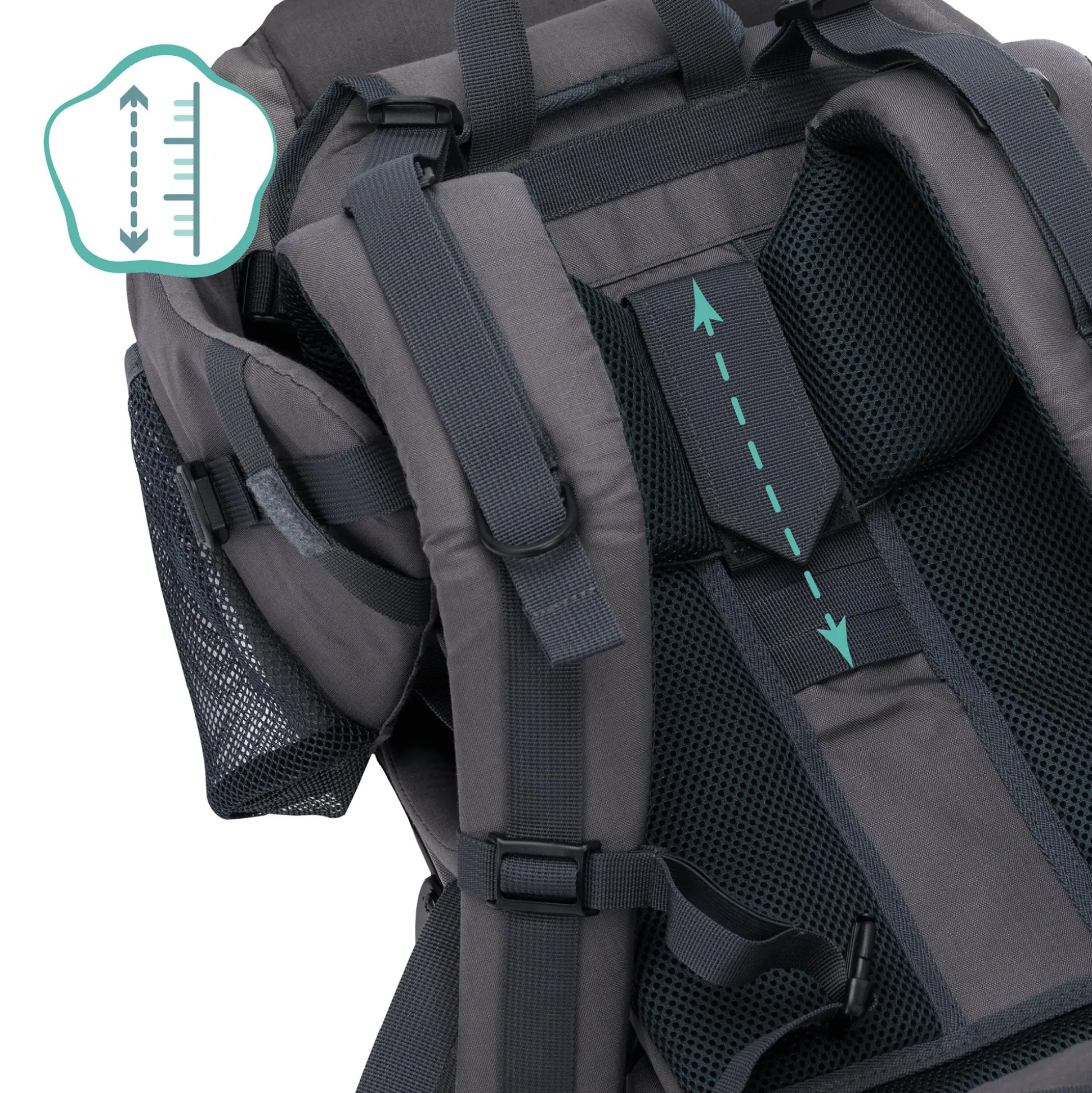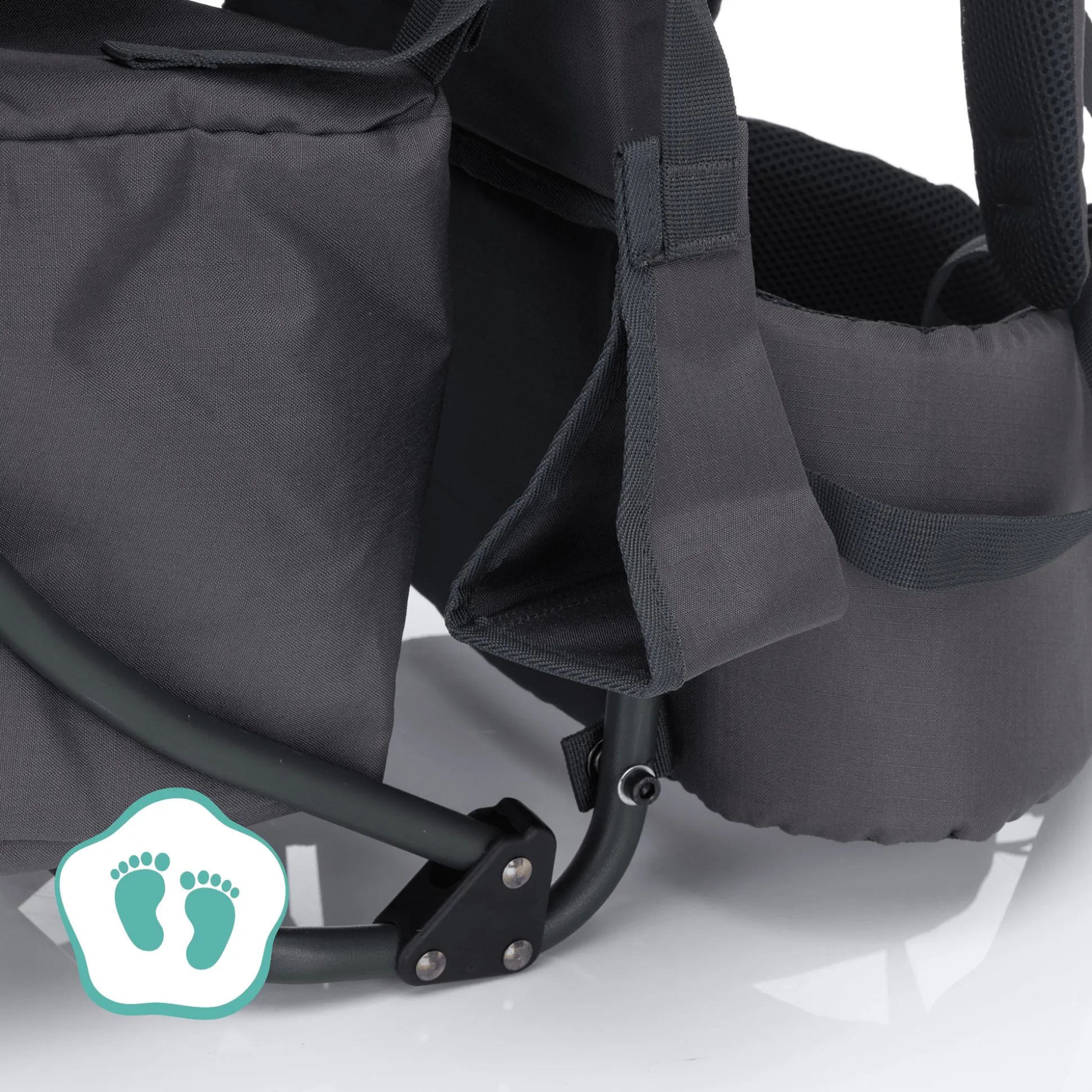 Genauso komfortabel präsentiert sich die Rückentrage für dein Kleines: Während die weiche Polsterung der Sitzfläche einen herrlich bequemen Sitzkomfort verspricht, sorgen die Fußschlaufen für eine optimale Entlastung der Beine. Gleichzeitig schützen spezielle Sicherheitsgurte vor dem Herausfallen – und das große Wetterschutzdach vor Sonne und Regen. Ebenso praktisch: Für Ersatzkleidung, Proviant & Co. verfügt die Rückentrage Elite über ein geräumiges Utensilienfach.