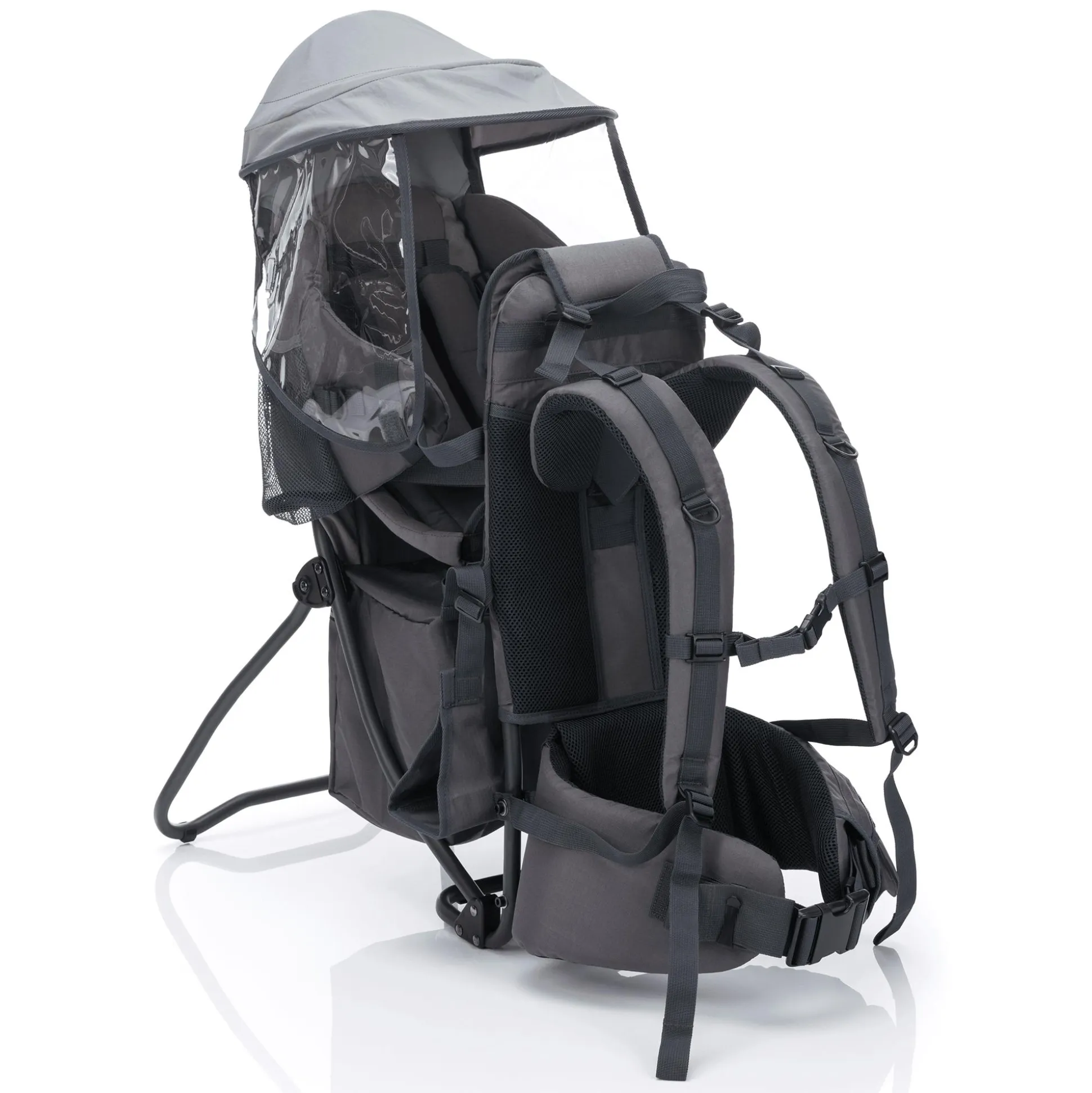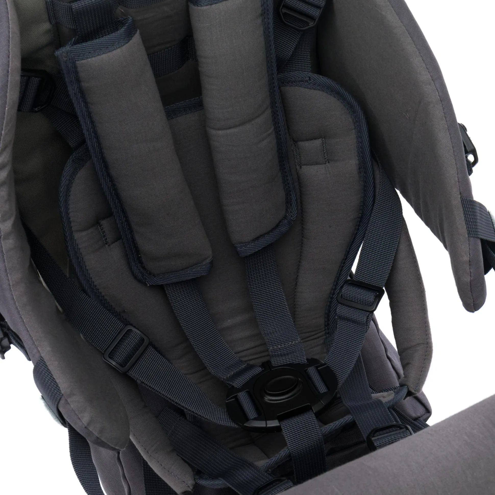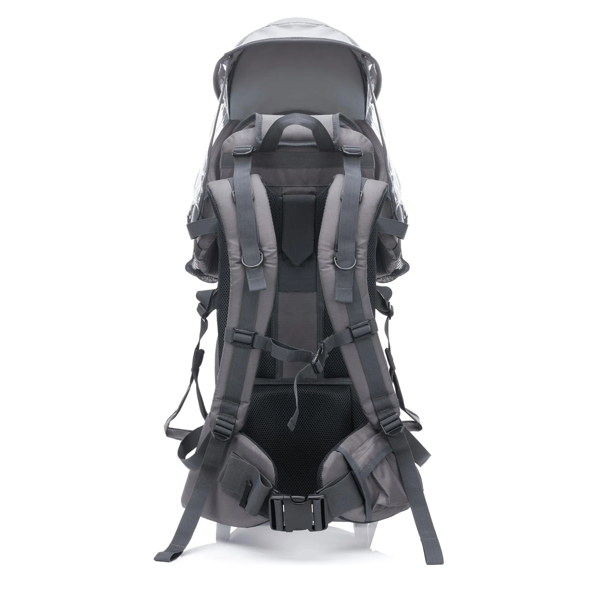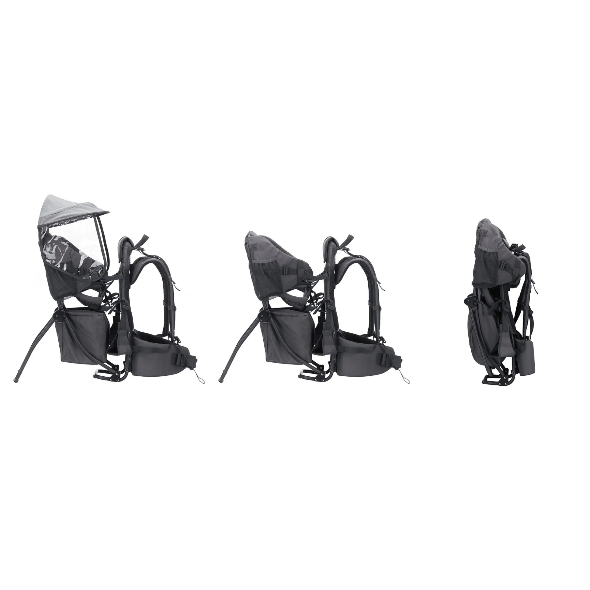 Genauso komfortabel präsentiert sich die Rückentrage für dein Kleines: Während die weiche Polsterung der Sitzfläche einen herrlich bequemen Sitzkomfort verspricht, sorgen die Fußschlaufen für eine optimale Entlastung der Beine. Gleichzeitig schützen spezielle Sicherheitsgurte vor dem Herausfallen – und das große Wetterschutzdach vor Sonne und Regen. Ebenso praktisch: Für Ersatzkleidung, Proviant & Co. verfügt die Rückentrage Elite über ein geräumiges Utensilienfach.