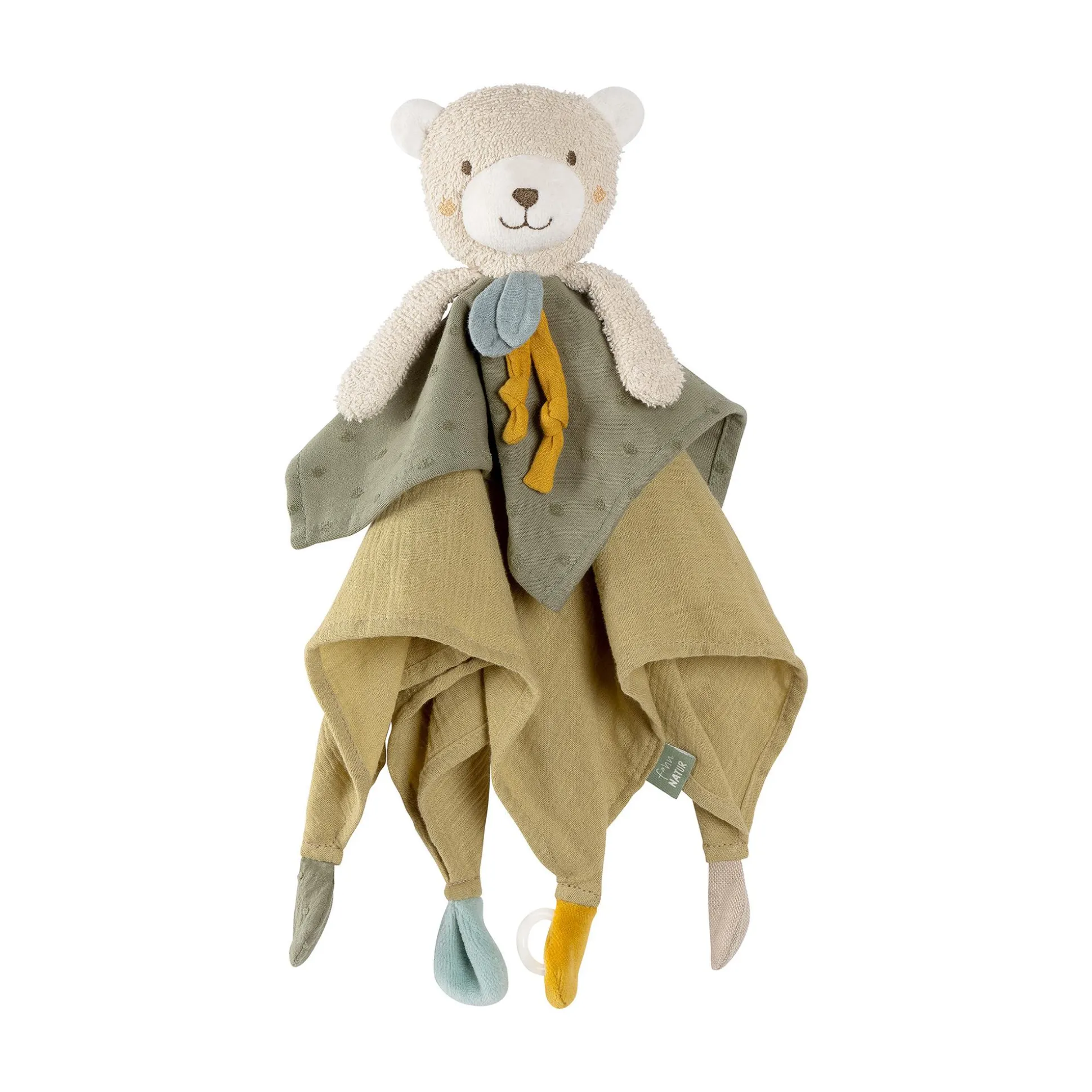 Beim Einschlafen spendet der grüne Kuschel-Bär Geborgenheit. Tagsüber laden die weichen Materialien im Lagen-Look zum Greifen, Fühlen und Knuddeln ein. Die Obermaterialien Frottee, Jersey, Musselin, Nicki und die Füllung des Schnuffeltuchs sind aus Bio-Baumwolle aus kontrolliertem Anbau (kbA).