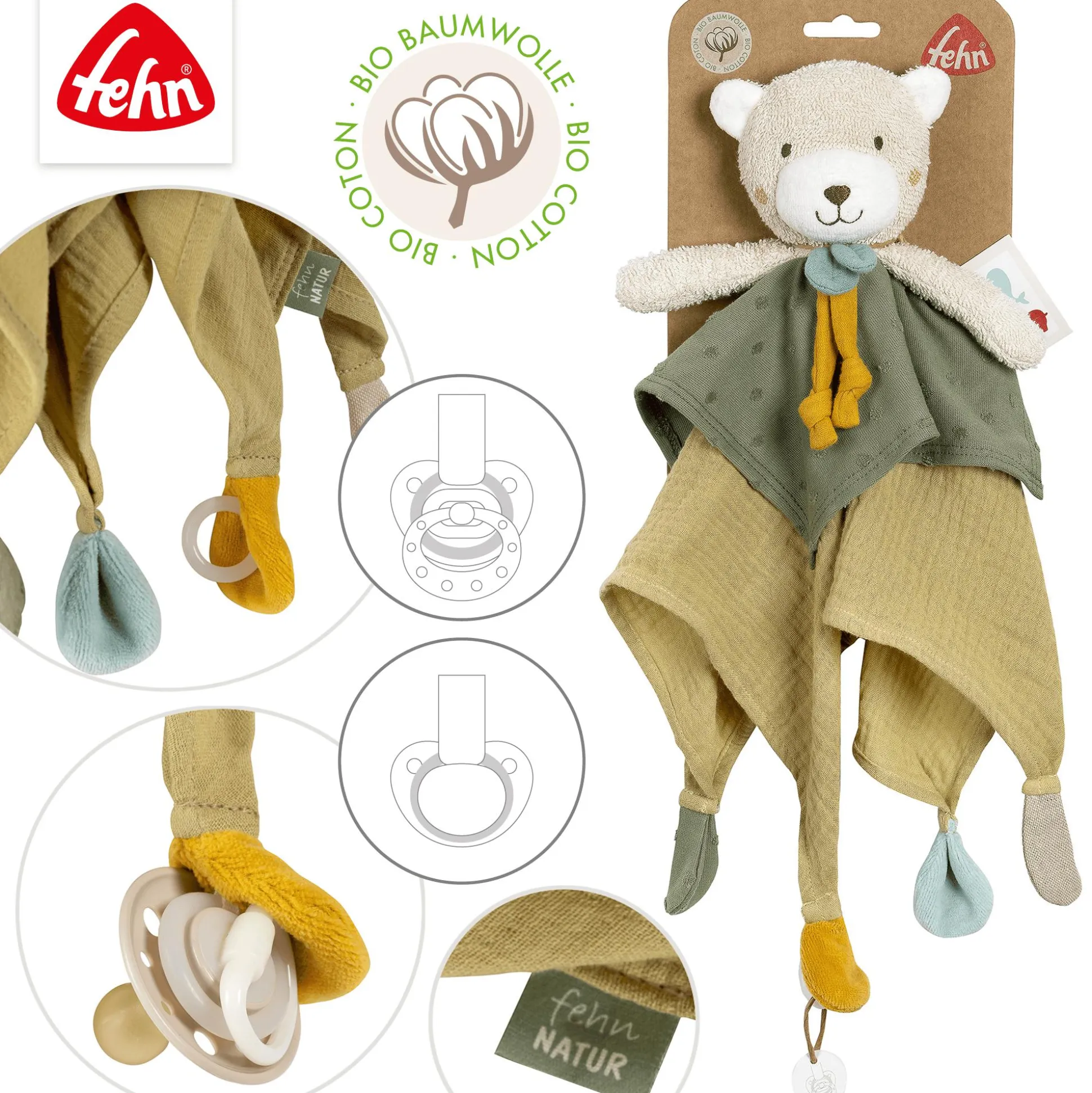 Dieses niedliche Schmusetuch Bär aus der fehnNATUR® Kollektion ist Spielkamerad und Stofftier-Schnuffeltuch in einem. Dient aber auch wunderbar als Tröster, Einschlafhelfer sowie Kuschelfreund und ist dabei Babys treuer Begleiter zuhause oder auf Reisen. Der praktische Schnullerring am Stofftier-Bär sorgt zudem dafür, dass Babys Schnuller nicht verloren geht.
