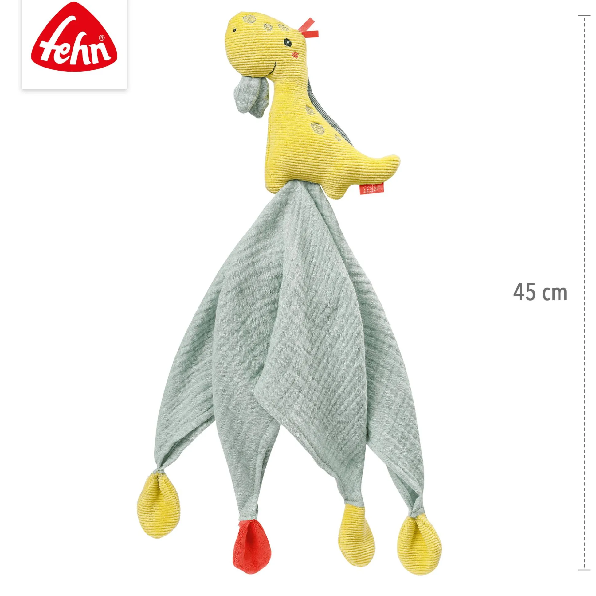 Dieser niedliche Dinosaurier namens Diego von fehn ist nicht nur ein kuschelweiches Schmusetuch, sondern auch ein treuer Einschlafhelfer. Mit seinem Baumwoll-Musselin-Stoff schenkt er deinem Baby ein Gefühl von Geborgenheit, das es beim Einschlafen begleitet.Die kuscheligen Materialien, der süße kleine Dino und die liebevoll abgenähten Enden laden dein Kleines zum Entdecken, Fühlen und Umarmen ein. Egal ob zu Hause oder unterwegs, Diego ist immer dabei, um deinem Kind Gesellschaft zu leisten. Mit einer Größe von ca. 44 Zentimetern ist dieses Schmusetuch einfach perfekt zum Kuscheln und Liebhaben.