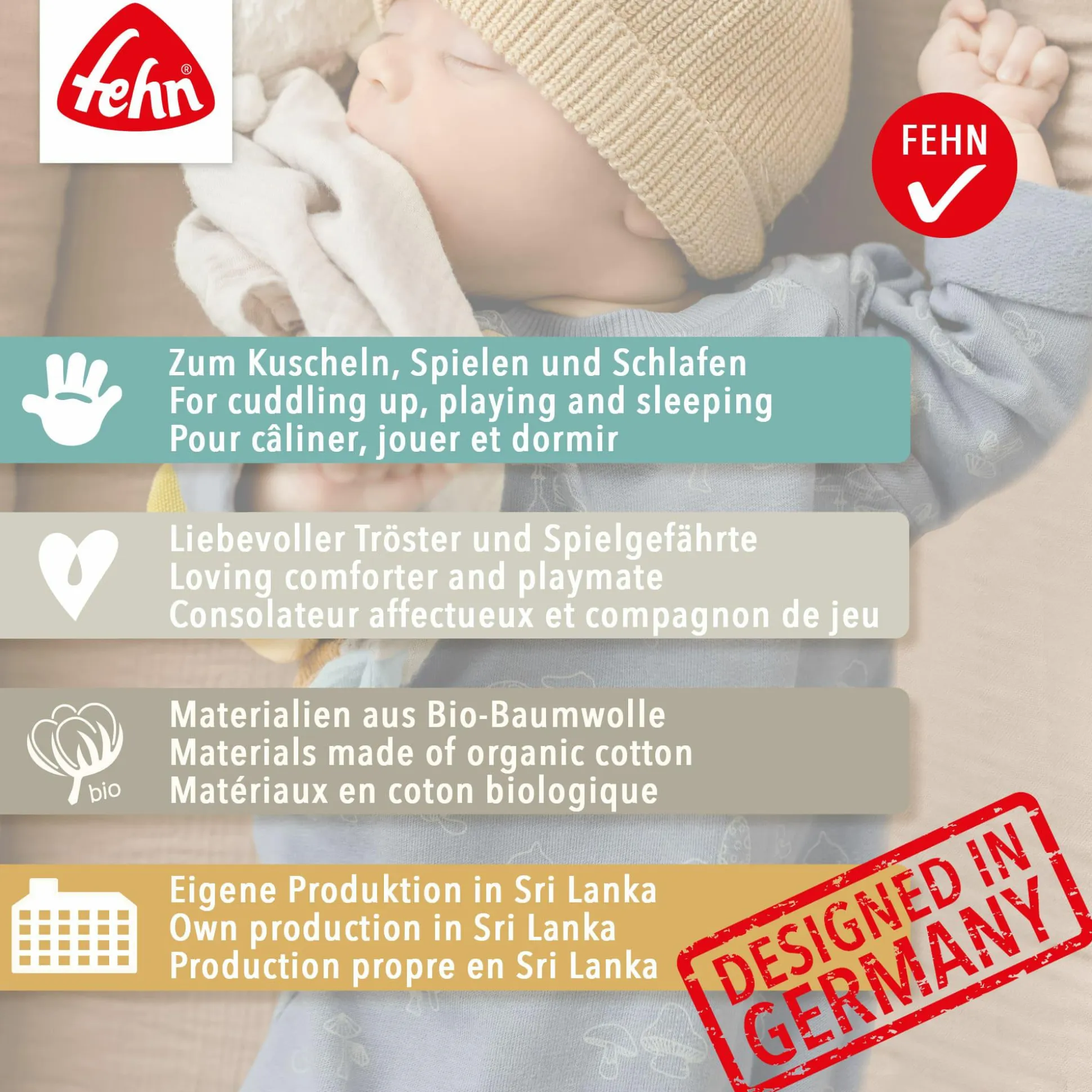 Gefertigt aus weicher Bio-Baumwolle, schmiegt sich das Schmusetuch sanft an die zarte Babyhaut und lädt zum ausgiebigen Schmusen ein. Es ist nicht nur ein treuer Freund zum Kuscheln, sondern unterstützt auch die ersten kleinen Lernmomente, indem es Geborgenheit und Trost spendet.