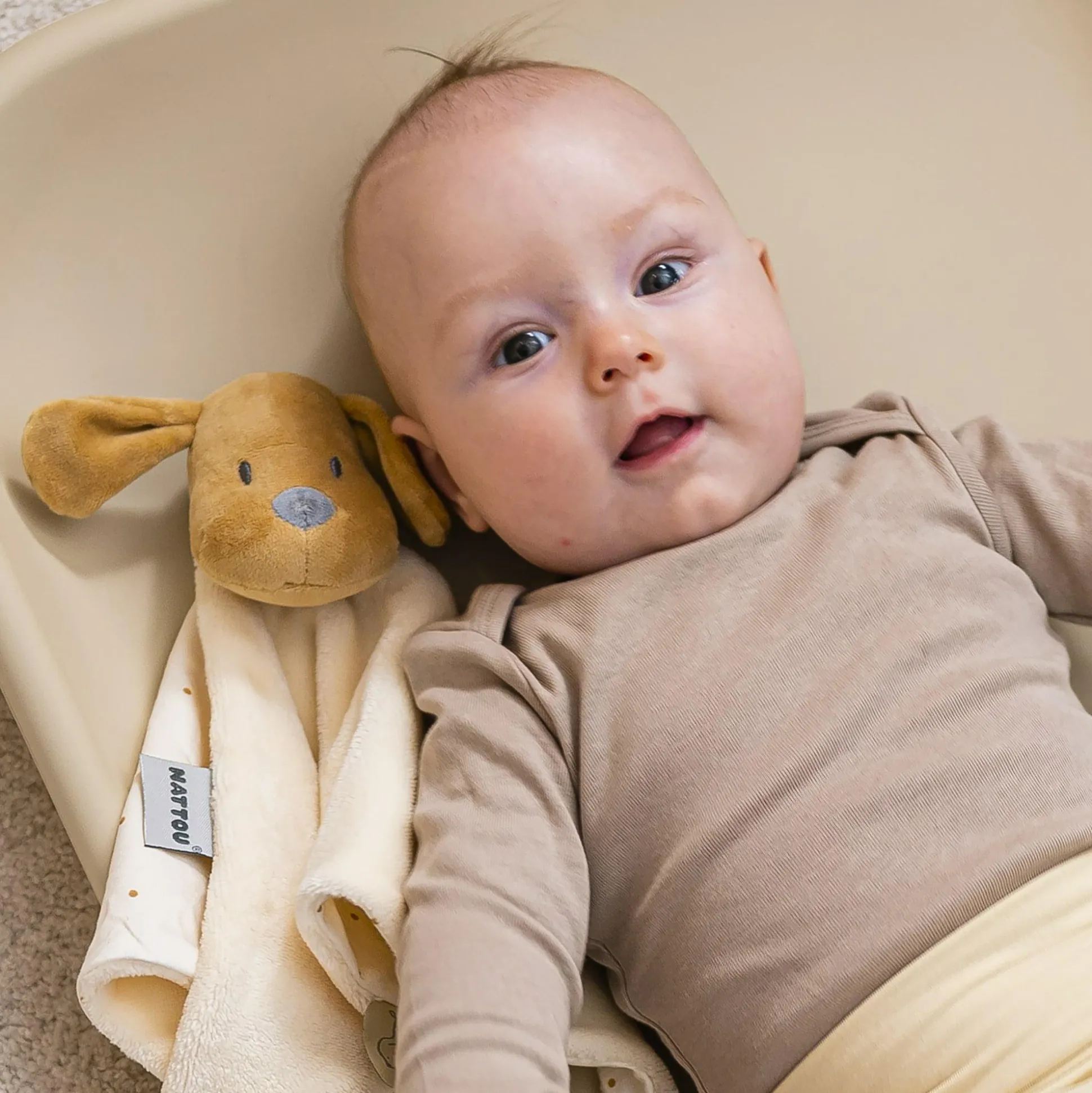 Das 40 x 40 cm große Nattou Schnuffeltuch Doudou Hund Charlie ist Babys erster Kuschelfreund, unzertrennlicher Begleiter und Tröster von Geburt an – zuhause sowie unterwegs. Zudem bietet das angenehm weiche Schmusetuch verschiedene Greifmöglichkeiten für die kleinen Händchen und Fingerchen deines Babys, wie zum Beispiel das Köpfchen, die Ohren und verschiedene Schildchen. Eine praktische Befestigungsmöglichkeit für den Schnuller bietet das Schnuffeltuch ebenfalls. Beim Einschlafen spendet Hund Charlie Geborgenheit und ist eine echte Hilfe.