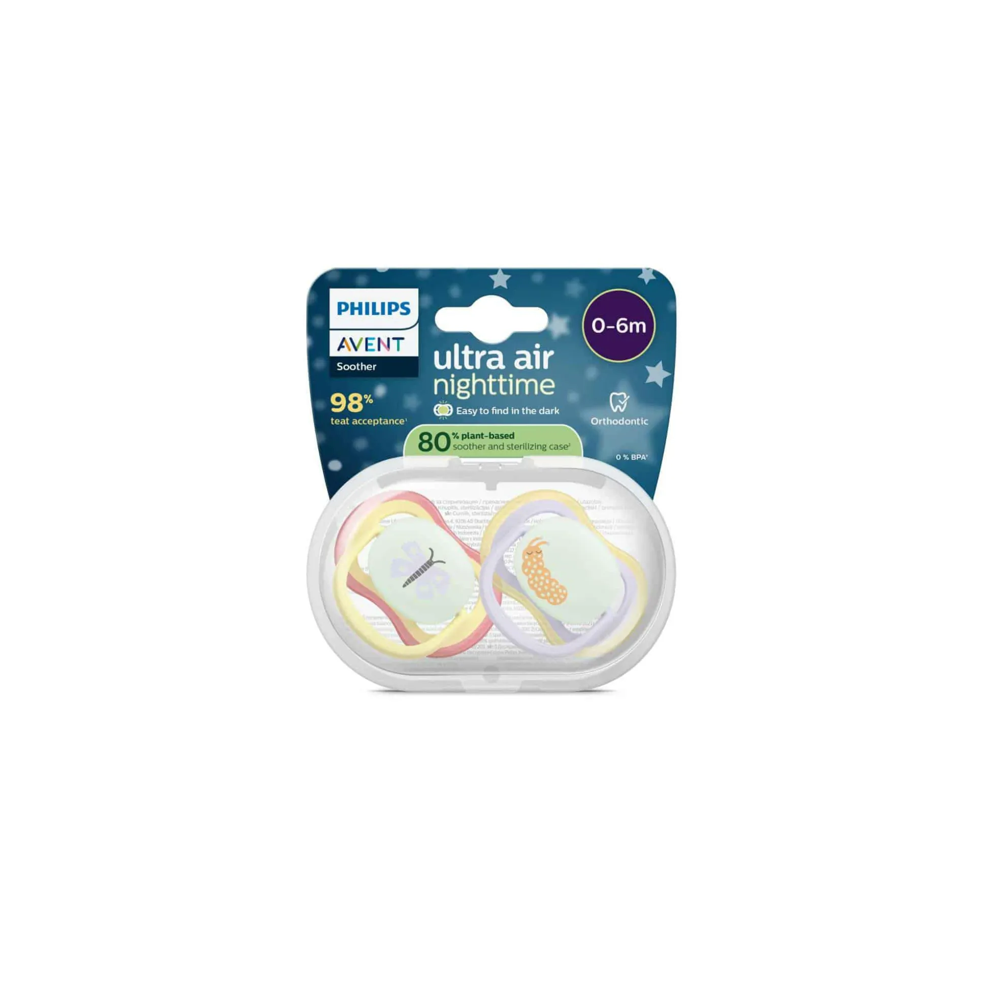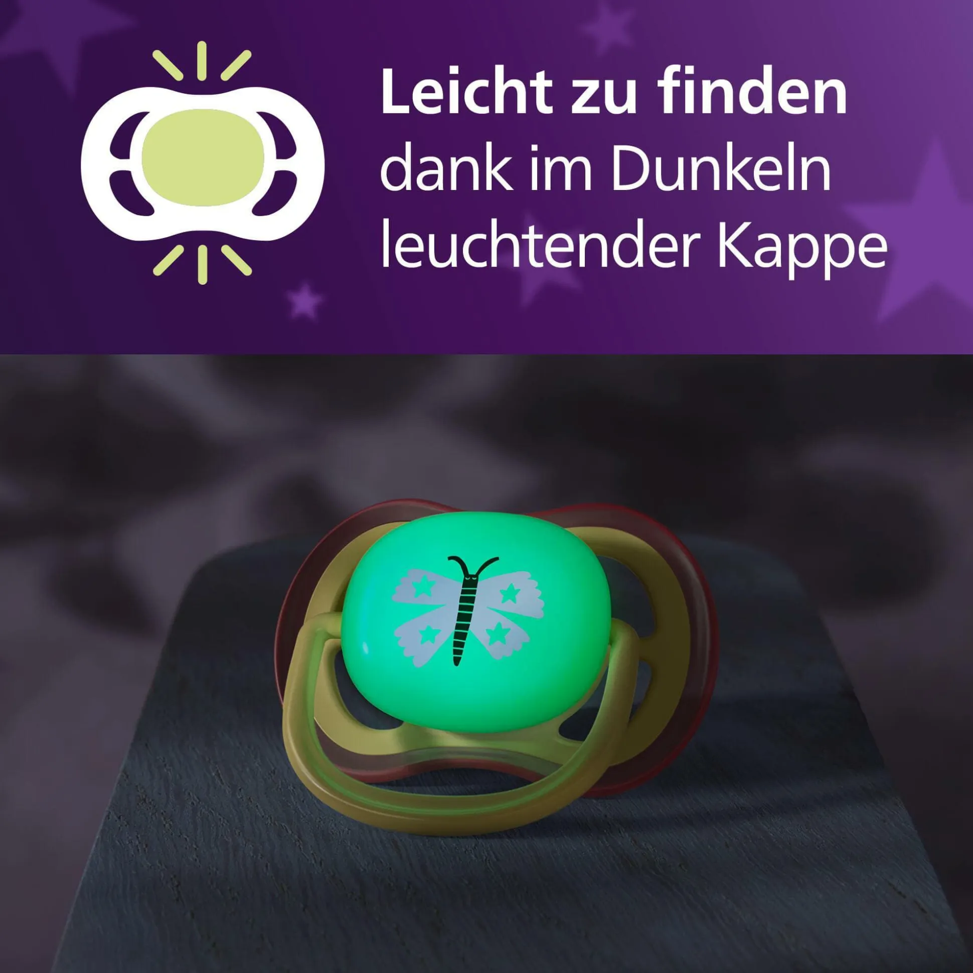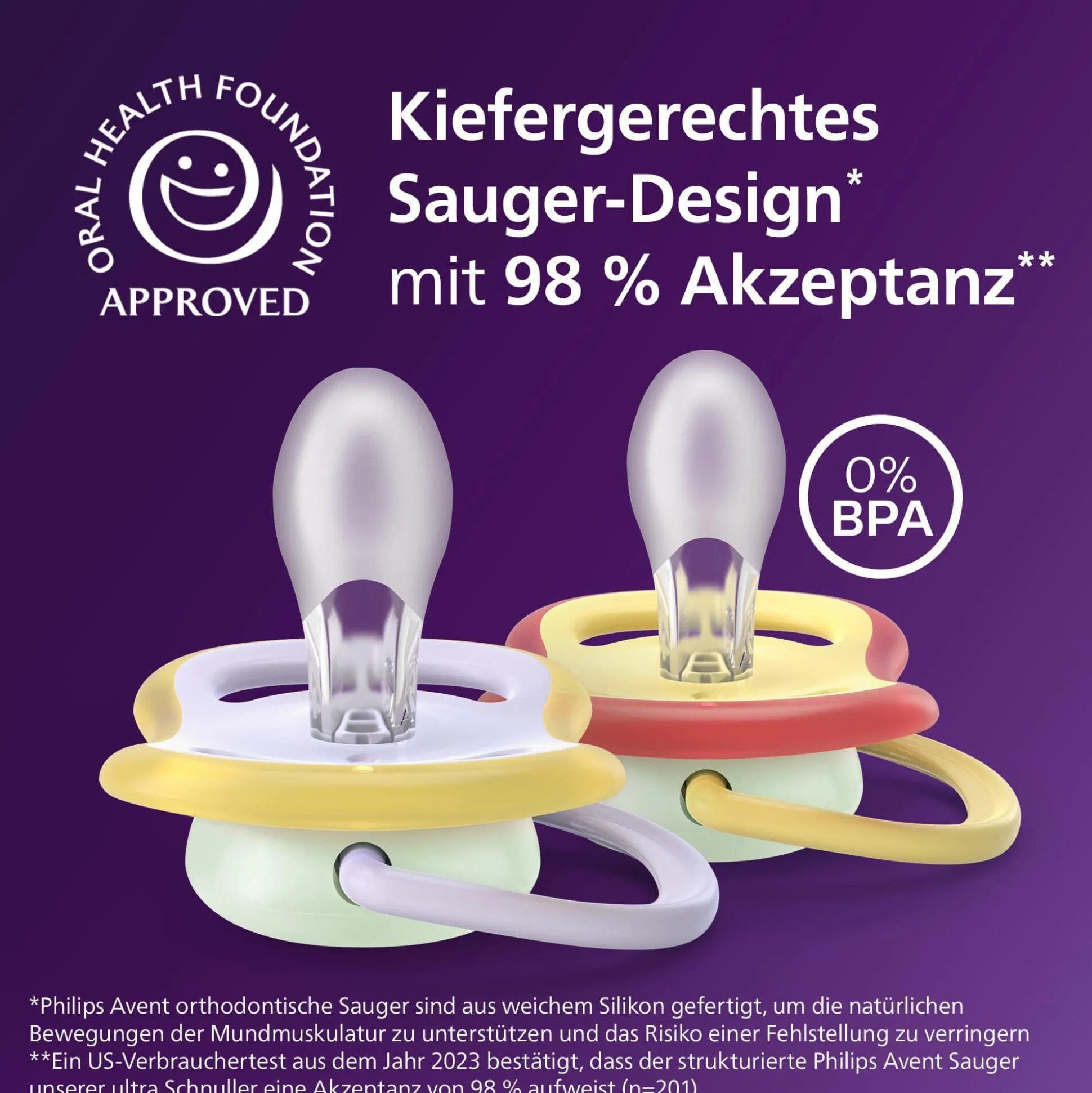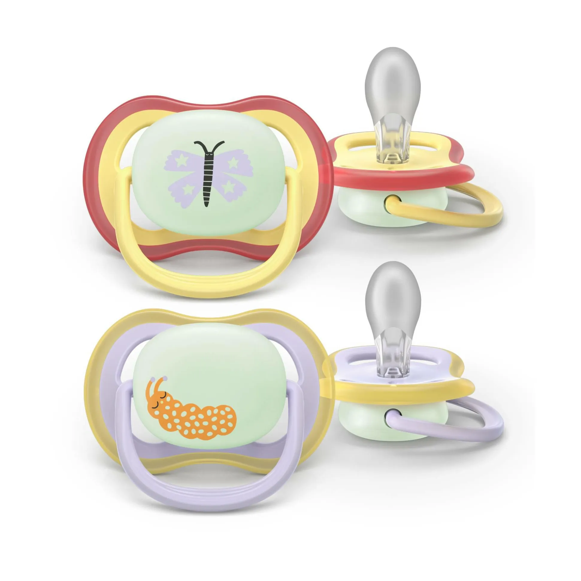 Damit dein kleiner Schatz auch nachts sanft ins Land der Träume segelt, sind die Philips Avent Ultra Air Schnuller im praktischen Doppelpack die perfekten Nachtwächter für die ersten sechs Lebensmonate.