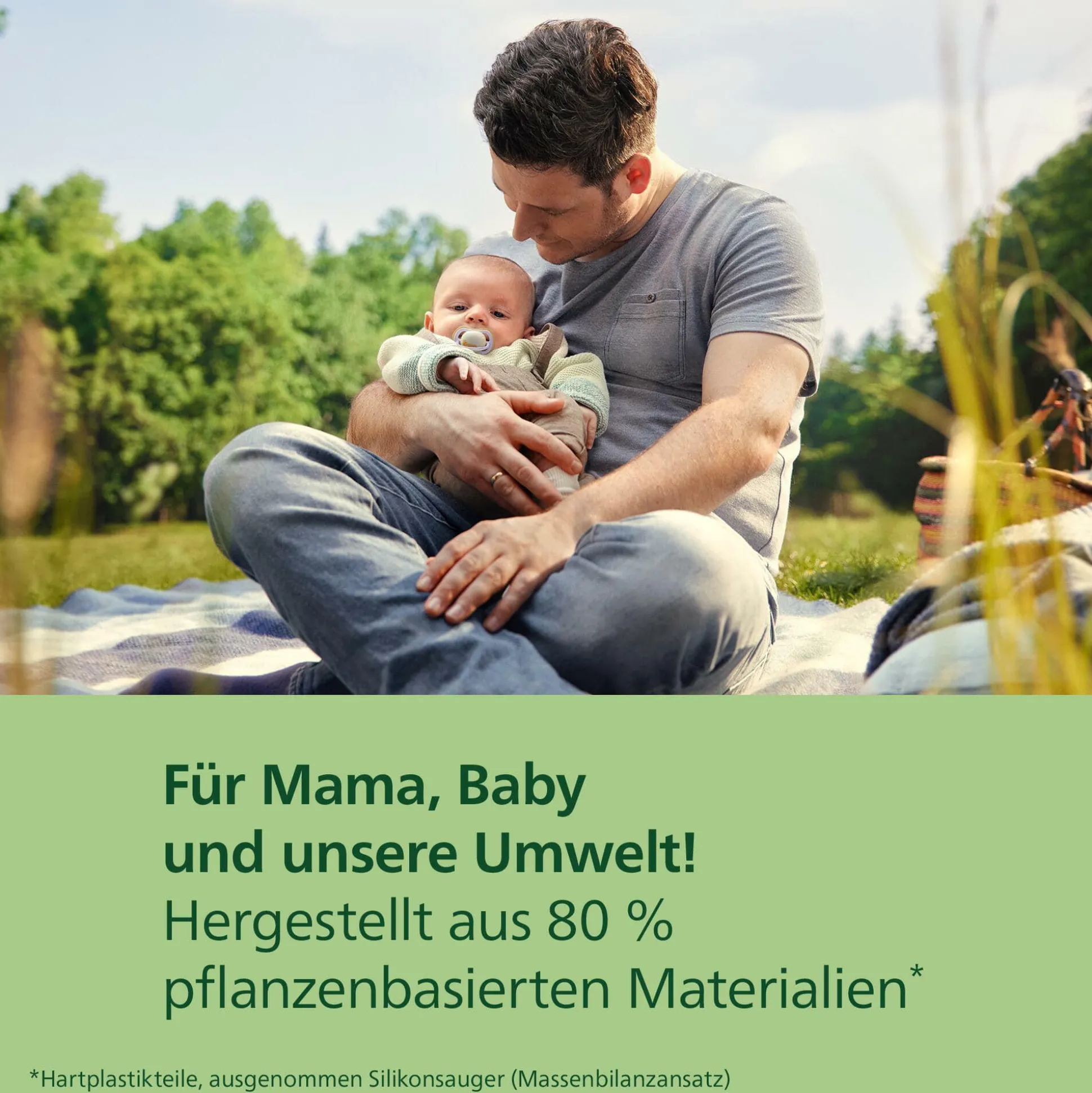 - Schnuller und Transportbox bestehen zu 80% aus pflanzenbasierten Materialien