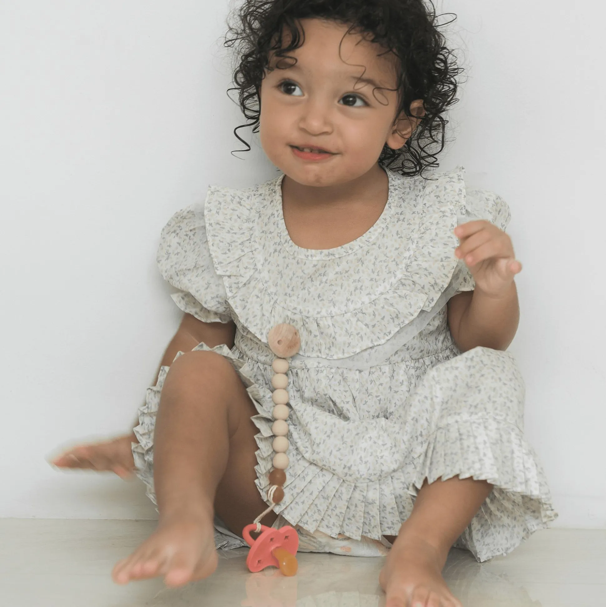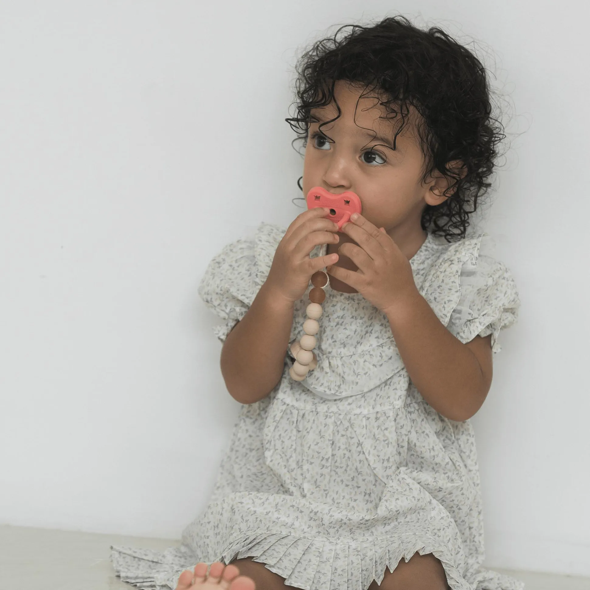 Diese schöne HEVEA ist handgefertigt und vegan. Sie besteht aus 9 weichen Naturkautschukperlen und wird mit einem starken, nickelfreien Holzclip befestigt. So geht der Schnuller deines Babys nicht mehr verloren und ist immer griffbereit. Dank der weichen und flexiblen Perlen aus Naturkautschuk ist sie sicher und fühlt sich auch für Babys kleine Händchen wunderbar an. Der nickelfreie Clip wird in Deutschland hergestellt und ermöglicht eine leichte Befestigung an der Kleidung deines Kindes. Der Schnullerhalter passt dank der sanften Farbe perfekt zu den Schnullern und Outfits der Saison! Dieses schöne Produkt von HEVEA ist ideal für dich, wenn du Plastik vermeiden und dich für nachhaltige Produkte entscheiden möchtest.