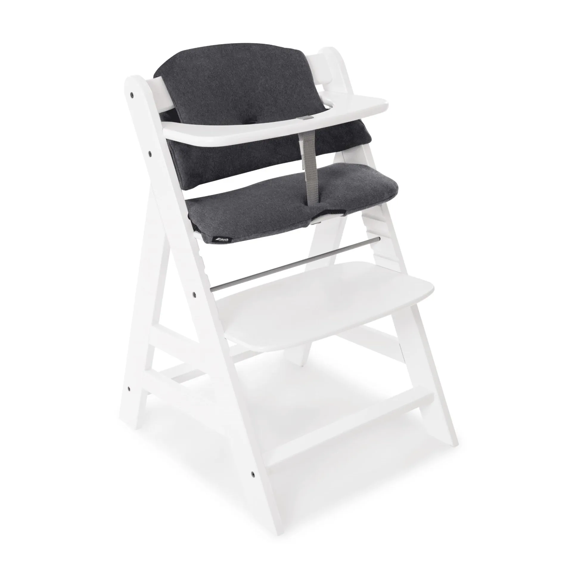 Dieses praktische Set besteht aus dem Hochstuhl Alpha Plus in Creme und dem Sitzverkleinerer Alpha Select in Jersey Charcoal von Hauck.