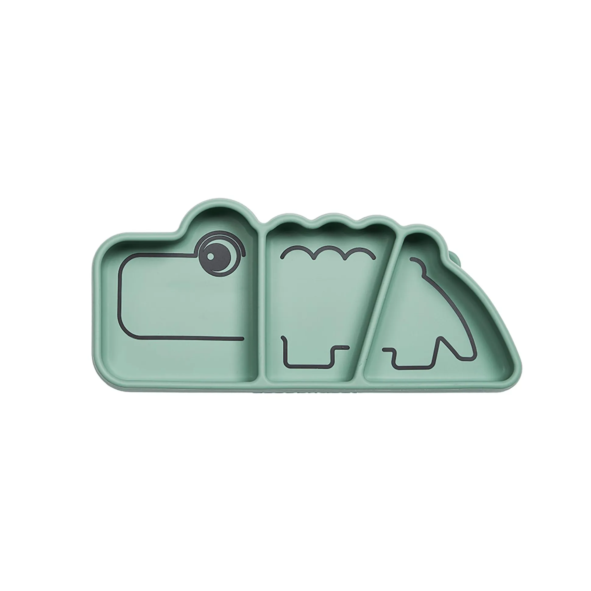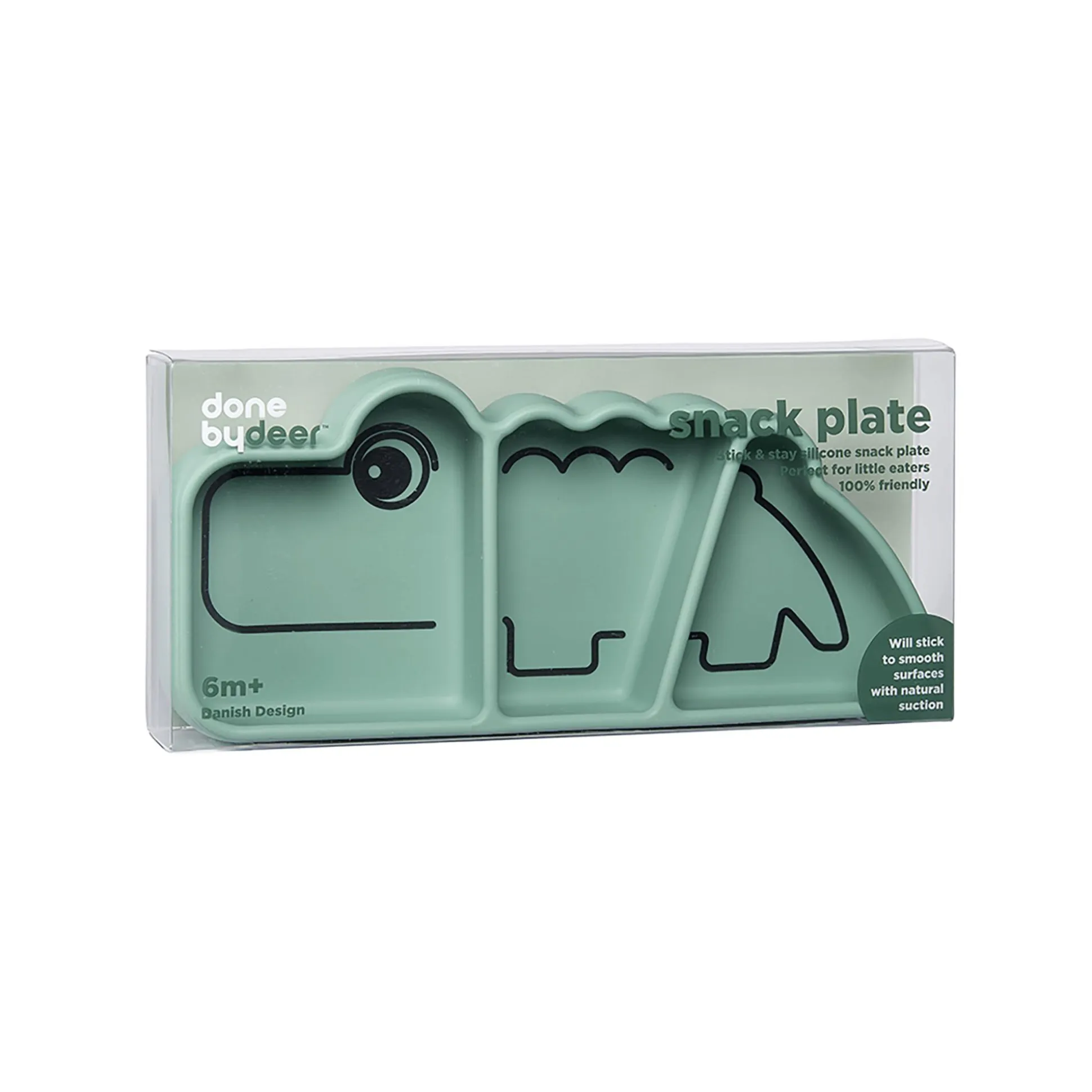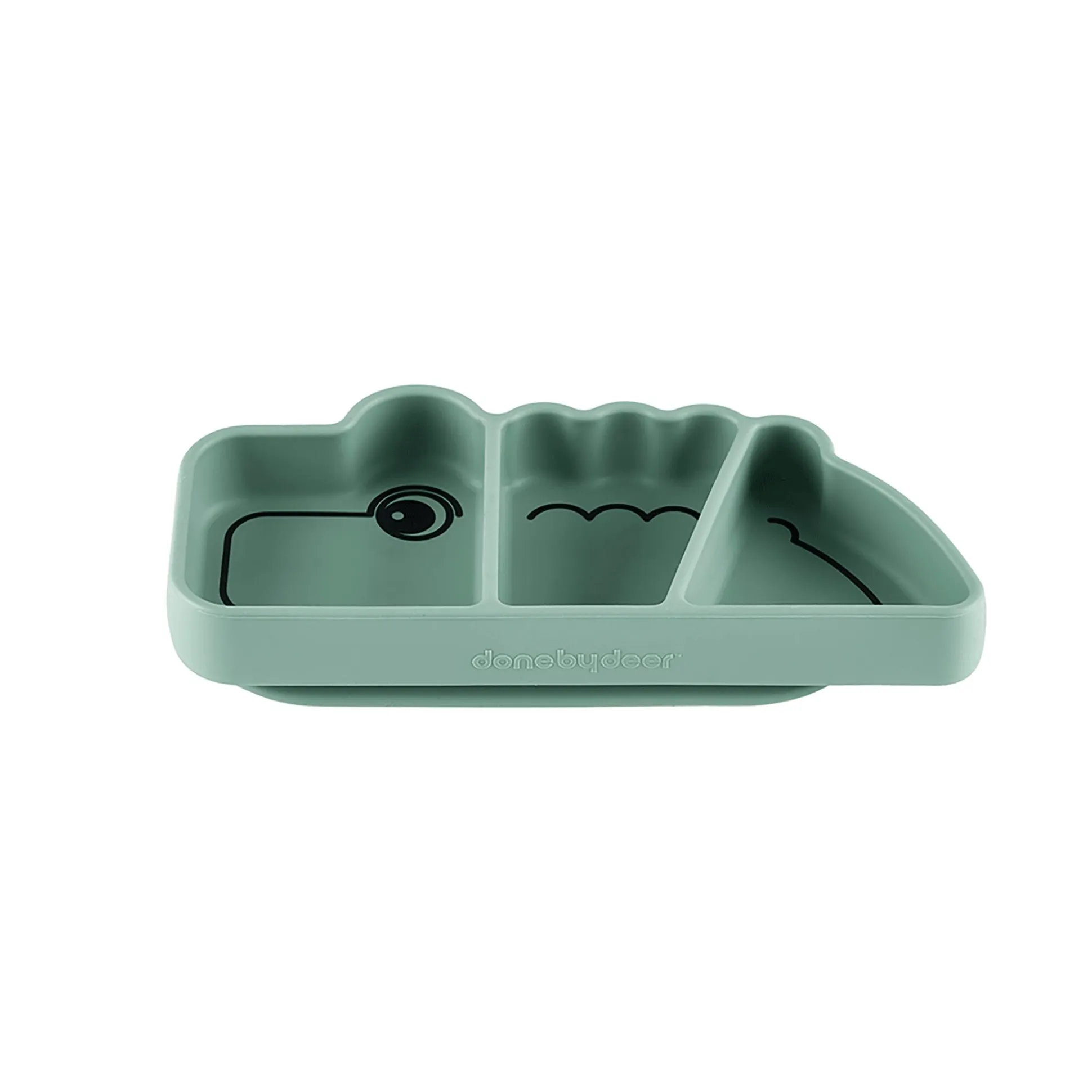 Mit dem Silikonteller Stick & Stay von done by deer macht das Essenlernen mit Croco richtig Spaß! Dank des praktischen Saugnapfes an der Unterseite kannst du den Teller kinderleicht auf einer glatten Oberfläche befestigen, sodass er beim Essen nicht verrutscht. Hinter Crocos Schwanz befindet sich eine kleine Lasche, die dir hilft, den Teller bequem wieder vom Tisch zu lösen. Mit den drei verschiedenen Fächern kannst du zudem das Essen einfach voneinander trennen.