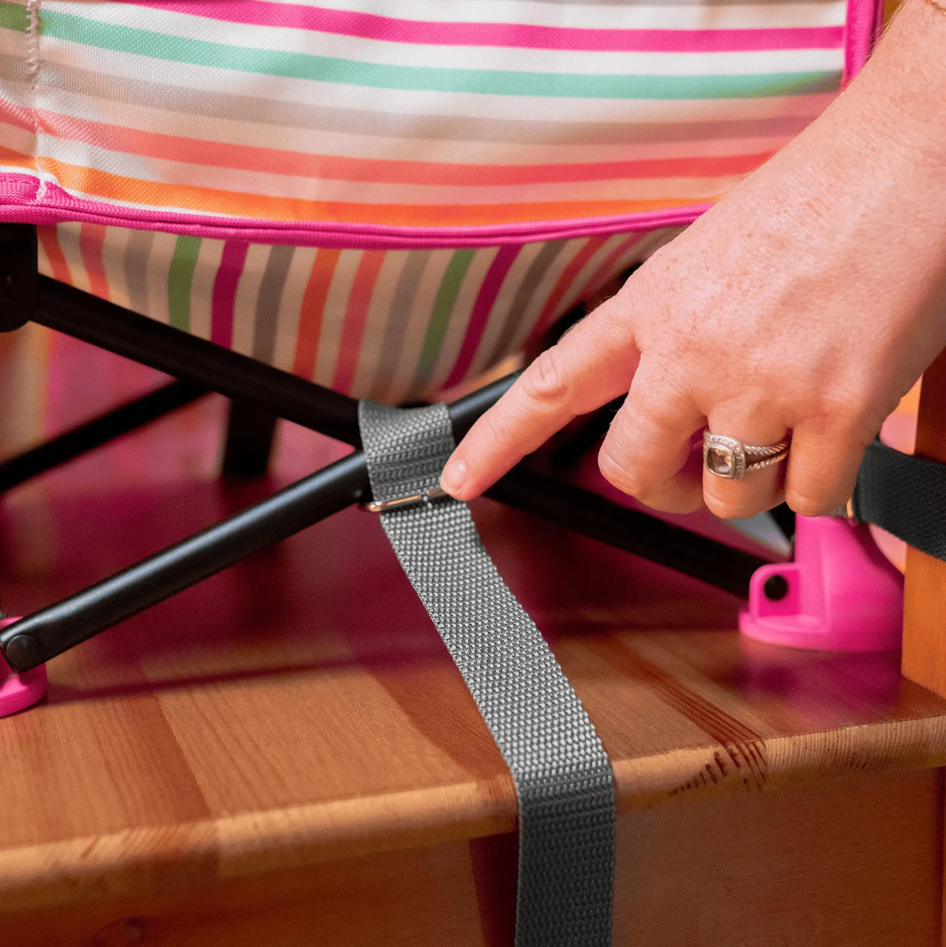 - sicherer Halt durch Befestigungsgurte an Erwachsenenstühlen