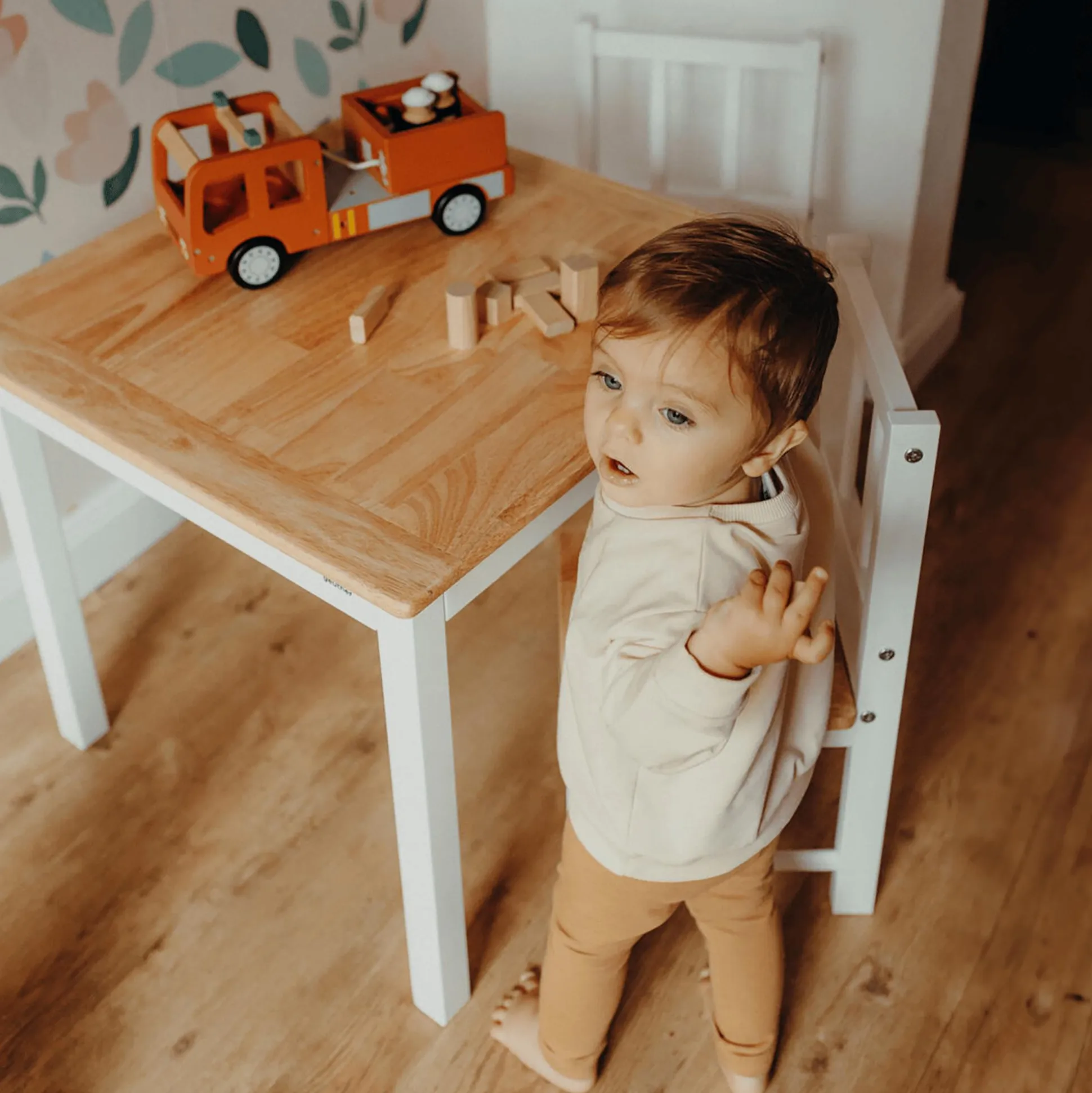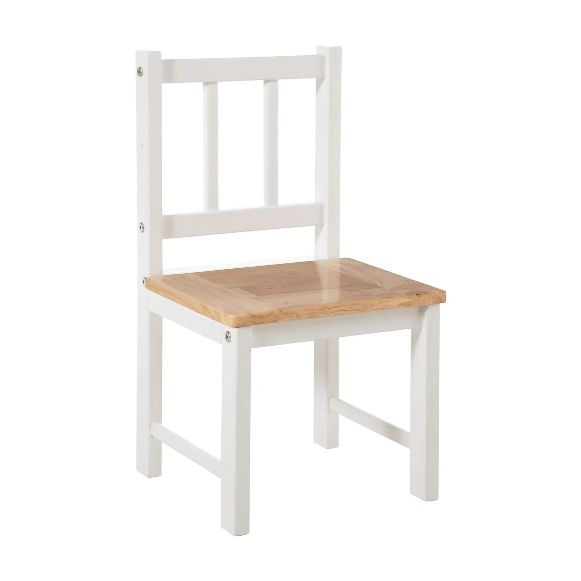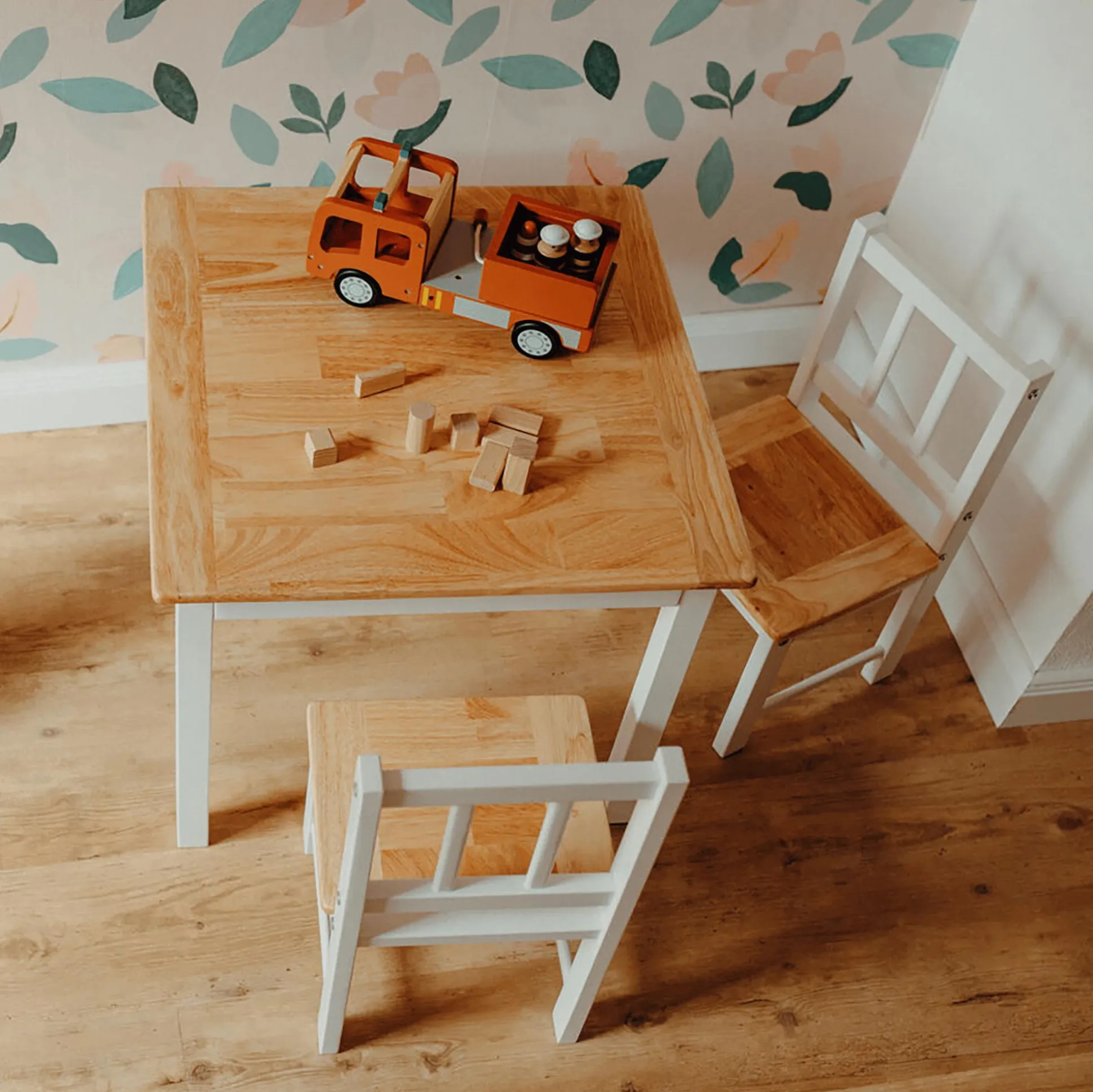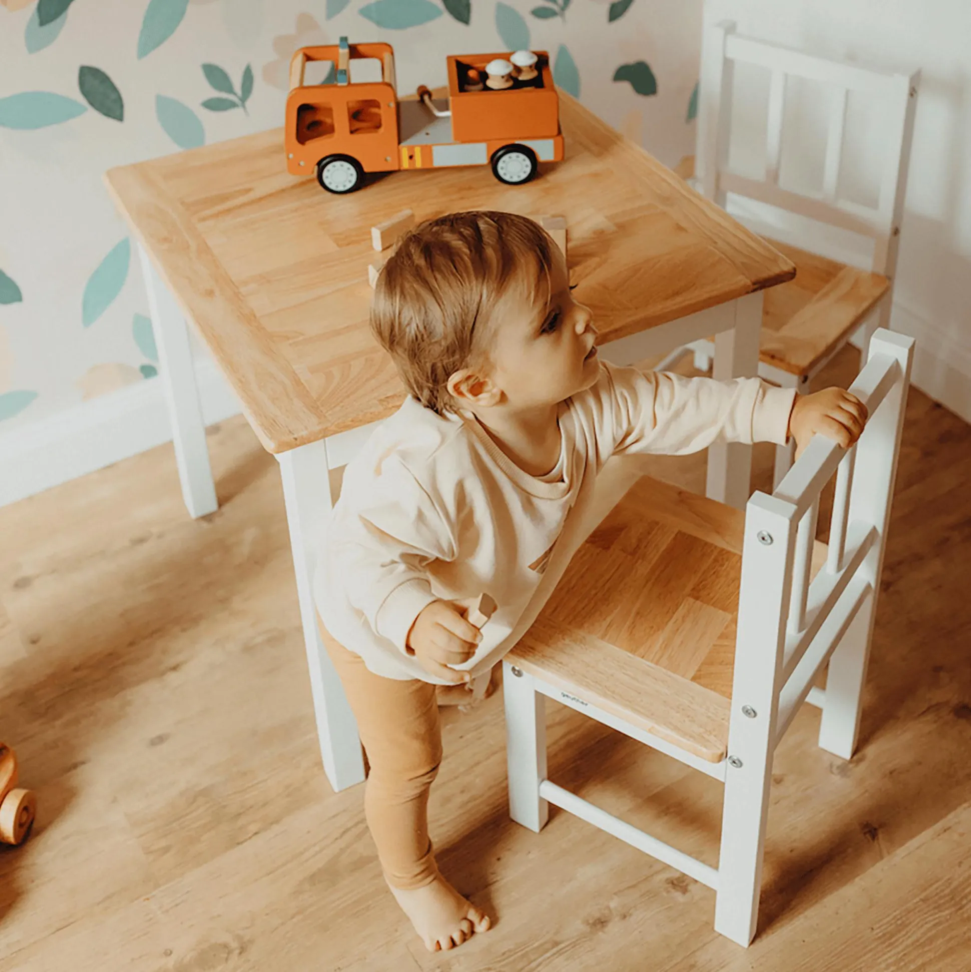 Die Tisch- sowie die Sitzflächen der Stühle sind aus Holz gefertigt und haben eine naturbelassene Oberfläche, was ihnen eine warme, helle Optik verleiht. Die Tischbeine und die Stuhlgestelle sind weiß lackiert und überzeugen durch einen schlichten, stilvollen Look. Die harmonische Kombination von warmem Holzdekor und weiß lackiertem Rahmen verleiht dieser Kindersitzgruppe eine zeitlose Eleganz und passt optimal in helle, moderne Kinderzimmer oder Spielbereiche.