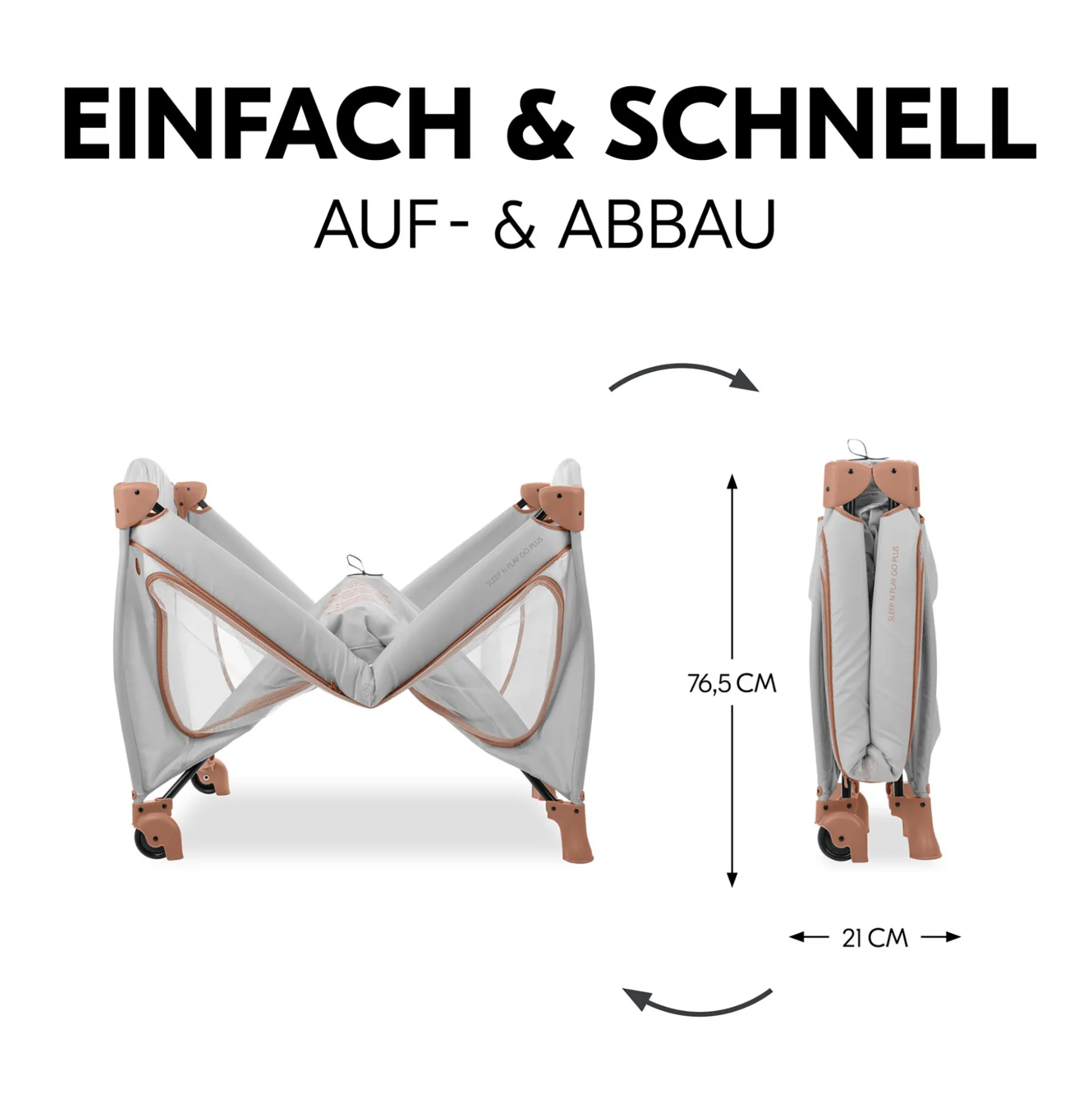 Mit Hilfe der Rollen lässt sich das Sleep N Play Go Plus mühelos verschieben. Es ist im Handumdrehen aufgebaut bzw. zusammengelegt, lässt sich einfach überall mit hinnehmen und kann platzsparend in der Transporttasche aufbewahrt werden. Das gefaltete Bettchen kannst du zudem wahlweise tragen oder bequem wie einen Koffer hinter dir herziehen.