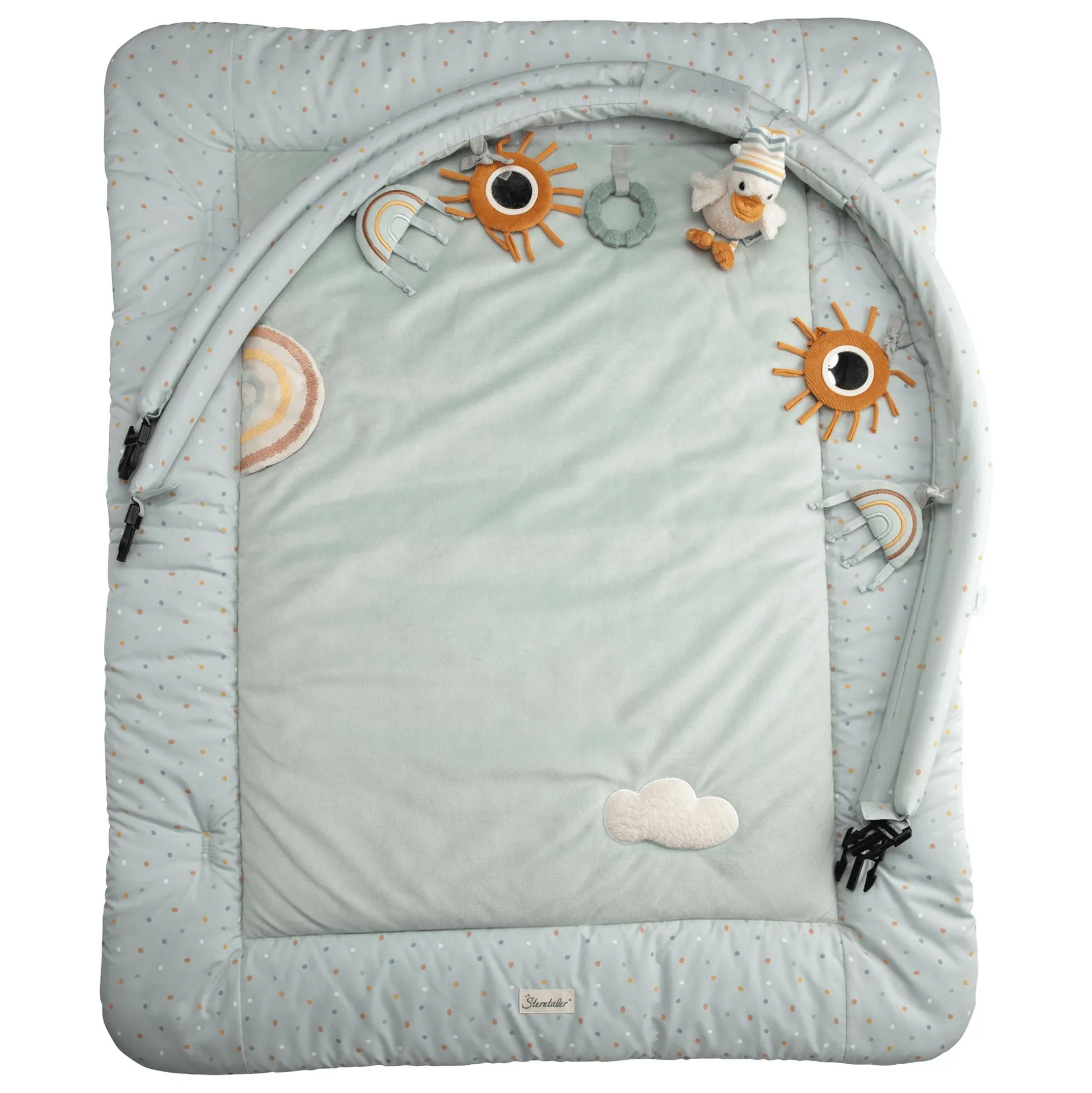 Der Spielbogen Edda von Sterntaler ist eine tolle Entdeckungsreise für deinen kleinen Schatz. Das vielseitige Spielzeug aus samtigem Softvelour und liebevoll bedrucktem Baumwoll-Mischgewebe entführt deinen Nachwuchs in eine Welt voller sensorischer Reize.In Bauch- und Rückenlage wird dein kleiner Liebling von einem fröhlichen Spiegel, einem lustigen Quietschelement, einem beruhigenden Silikonbeißring und dem geheimnisvollen Knisterpapier in seinen Bann gezogen. Das mittlere Spieltier mit einem bezaubernden sternförmigen Befestigungsring kannst du bei Bedarf mühelos an einem anderen Spielplatz befestigen.