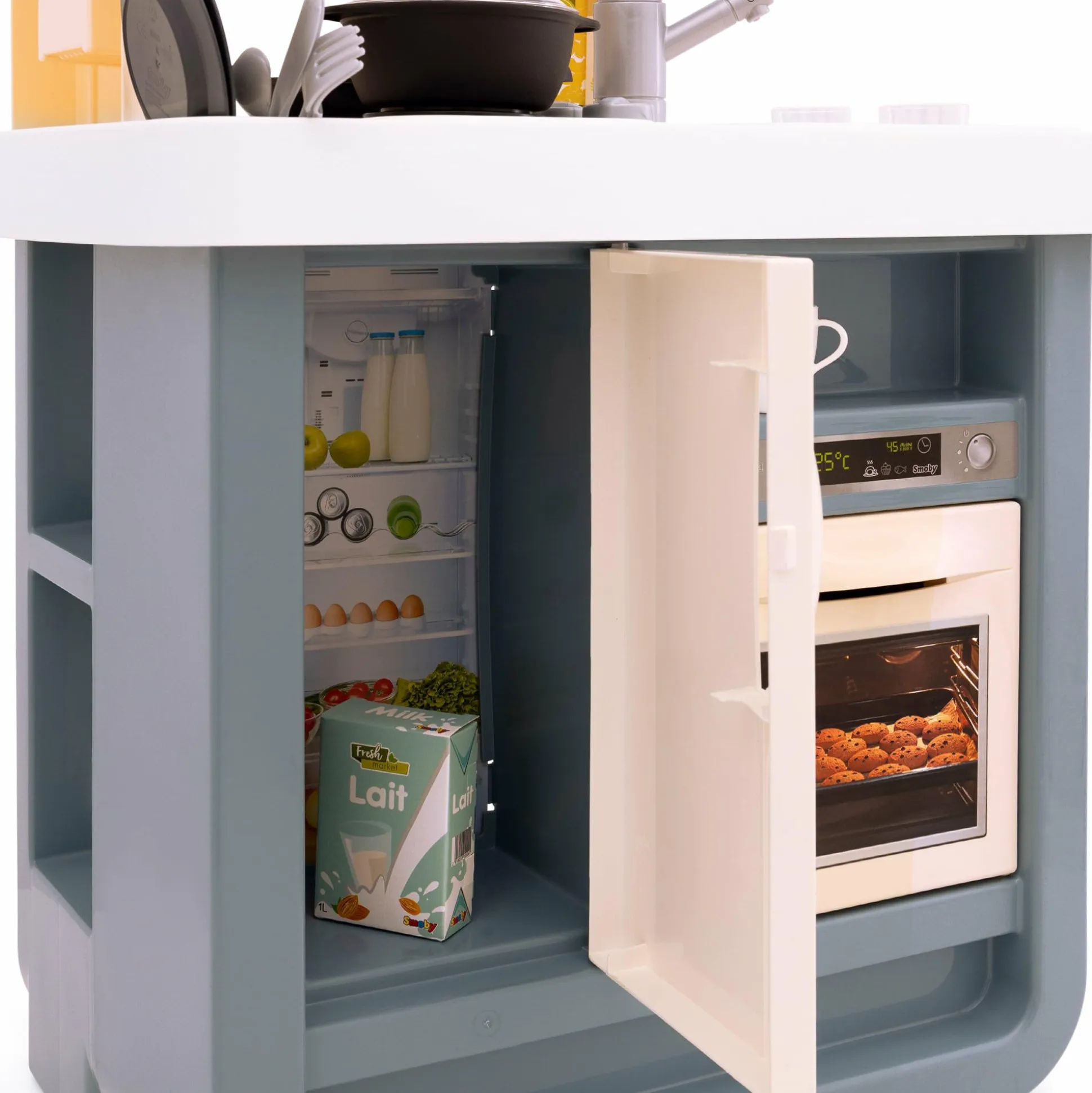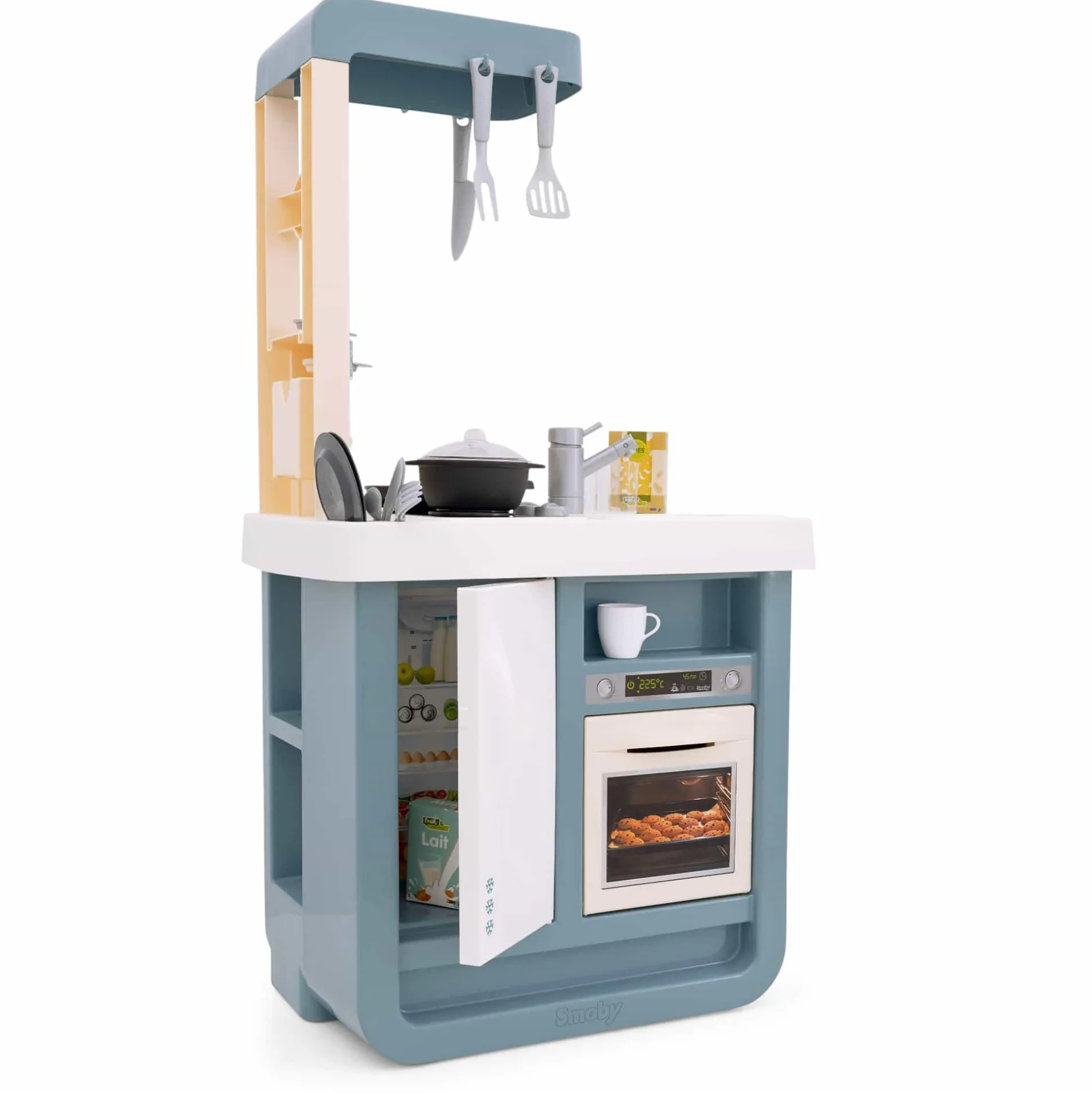 Mit der Smoby Küche Bon Appetit taucht dein kleiner Schatz in die faszinierende Welt des Kochens ein! Diese kompakte Kinderküche im modernen Design birgt stundenlangen Spielspaß und lehrreiche Momente.Sie verfügt über einen Herd mit zwei Herdplatten, einen Backofen und sogar eine Abzugshaube – so kann dein kleiner Küchenchef oder deine kleine Köchin ihre kulinarischen Fähigkeiten perfektionieren. Ein elektronisches Sound-Modul in einer der Herdplatten sorgt für realistische Kochgeräusche, die dein Kind begeistern und die Fantasie anregen werden. Diese Spielküche ist auch mit einem Kühlschrank, einem Spülbecken mit Wasserhahn und sogar einer Espressomaschine ausgestattet, die verschiedene Pads für Tee und Kaffee bietet. Das umfangreiche Zubehör – von Töpfen und Pfannen bis hin zu Tellern und Besteck – findet seinen Platz in den zahlreichen Regalen, so bleibt alles ordentlich und griffbereit für die nächste kulinarische Entdeckungstour.
