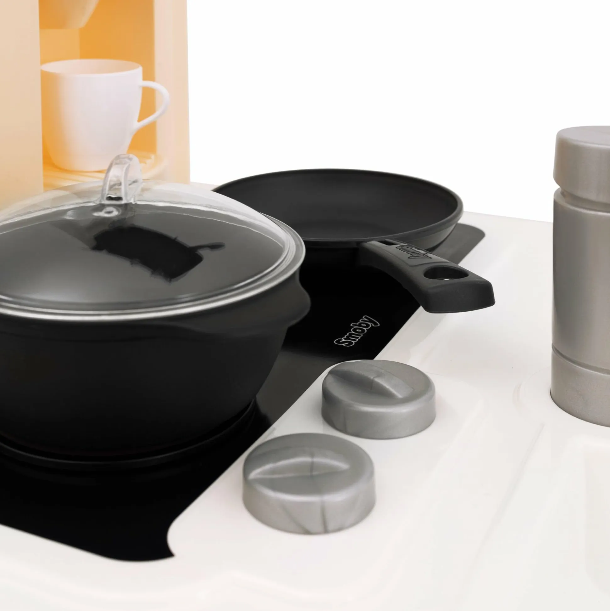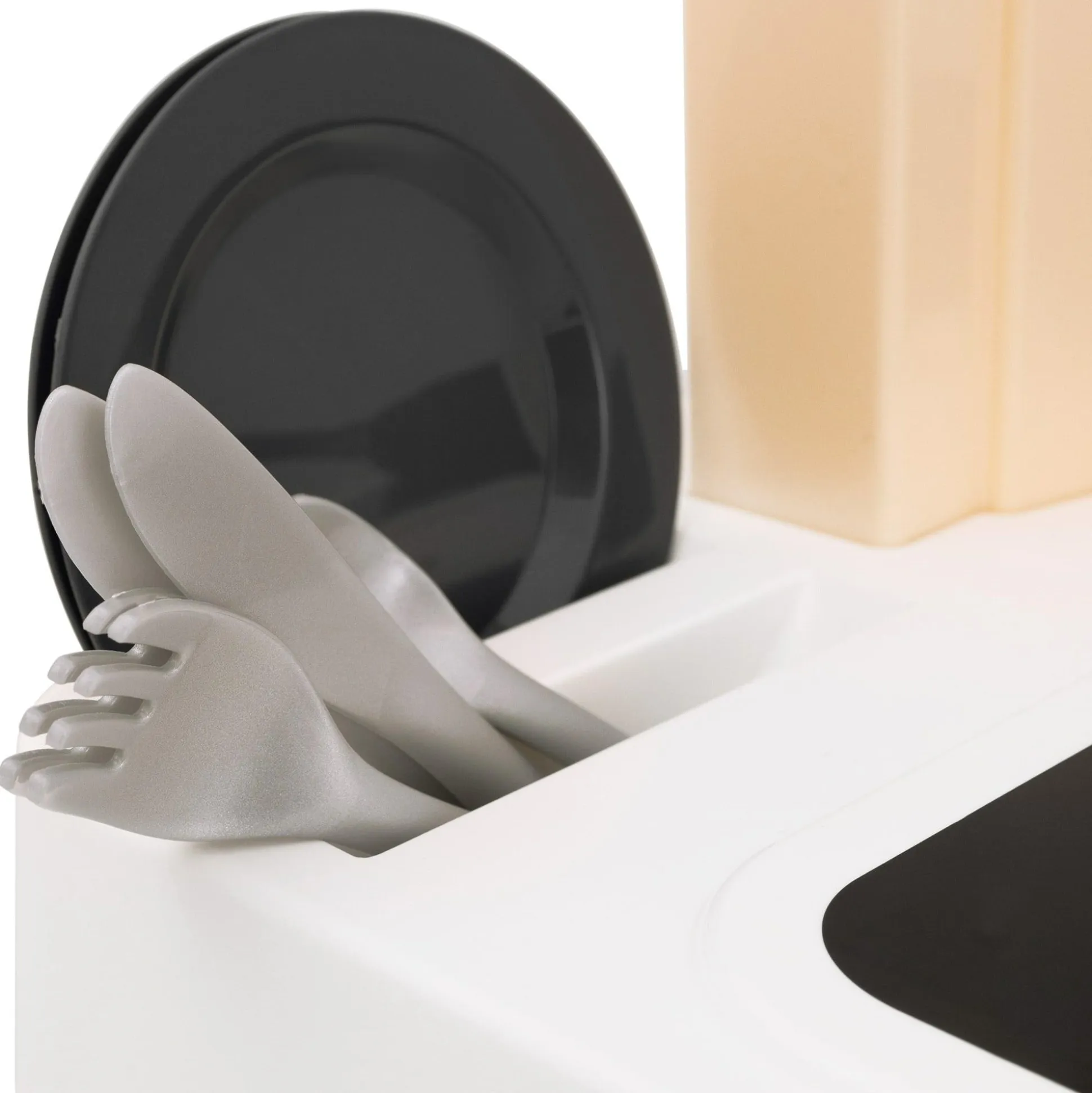 - umfangreiches Zubehör (Kochtopf mit Deckel, Teller, Besteck, Kochgeschirr, Lebensmittel-Leerpackungen, Becher, Tasse, Pfanne)