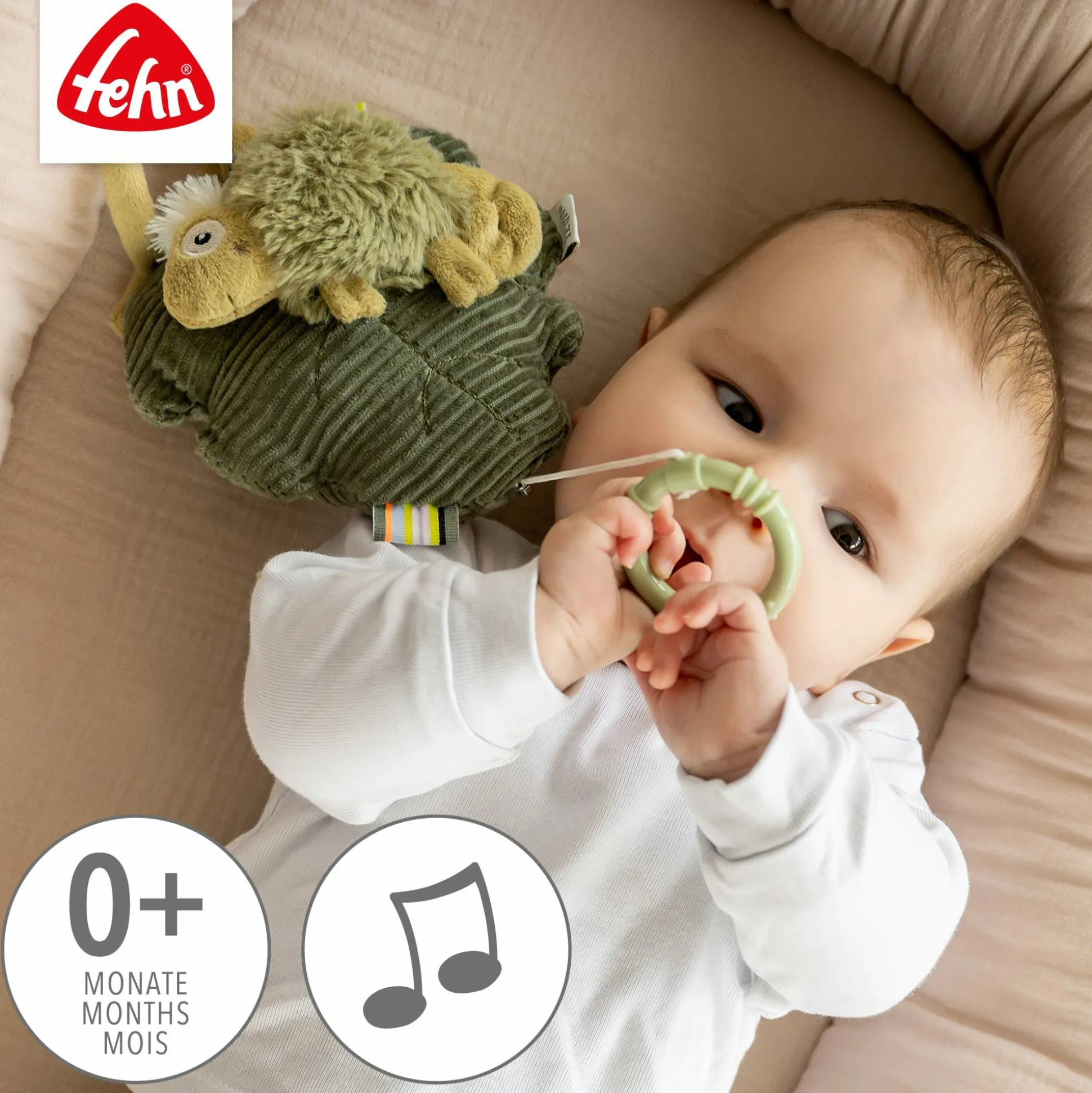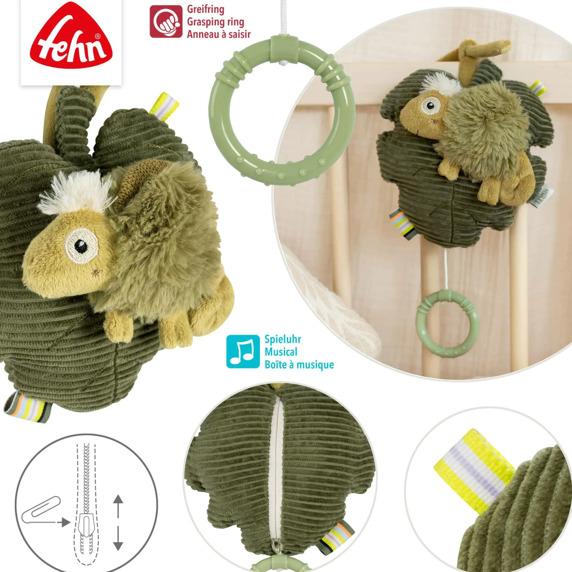 Das charmante Chamäleon in Oliv ist nicht nur ein hübscher Blickfang, sondern auch ein treuer Begleiter in den ersten Lebensmonaten. Durch das Lauschen der sanften Musik wird die auditive Wahrnehmung deines Babys spielerisch gefördert und die Sinne angeregt. So unterstützt die Spieluhr die Entwicklung wichtiger Fähigkeiten auf liebevolle Weise.