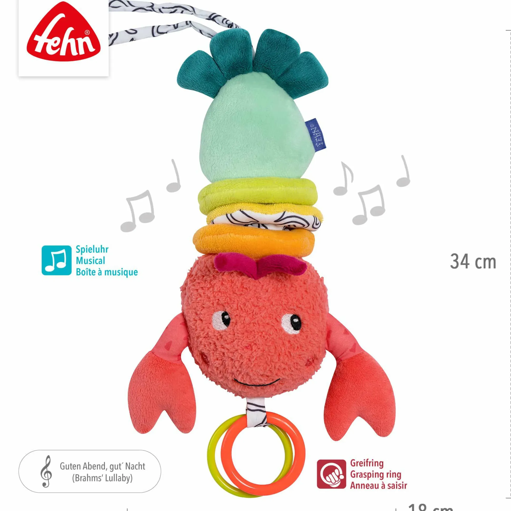 Die Spieluhr Hummer von fehn ist ein kuscheliger Begleiter, der deinen kleinen Nachwuchs ab der Geburt sanft beim Einschlafen unterstützt. Als Plüschtier und Einschlafhilfe vereint der Plüsch-Hummer Geborgenheit mit Funktionalität und spielt nach dem Aufziehen die beruhigende Melodie „Guten Abend, gut’ Nacht“ (Brahms Wiegenlied) für ca. zwei Minuten.