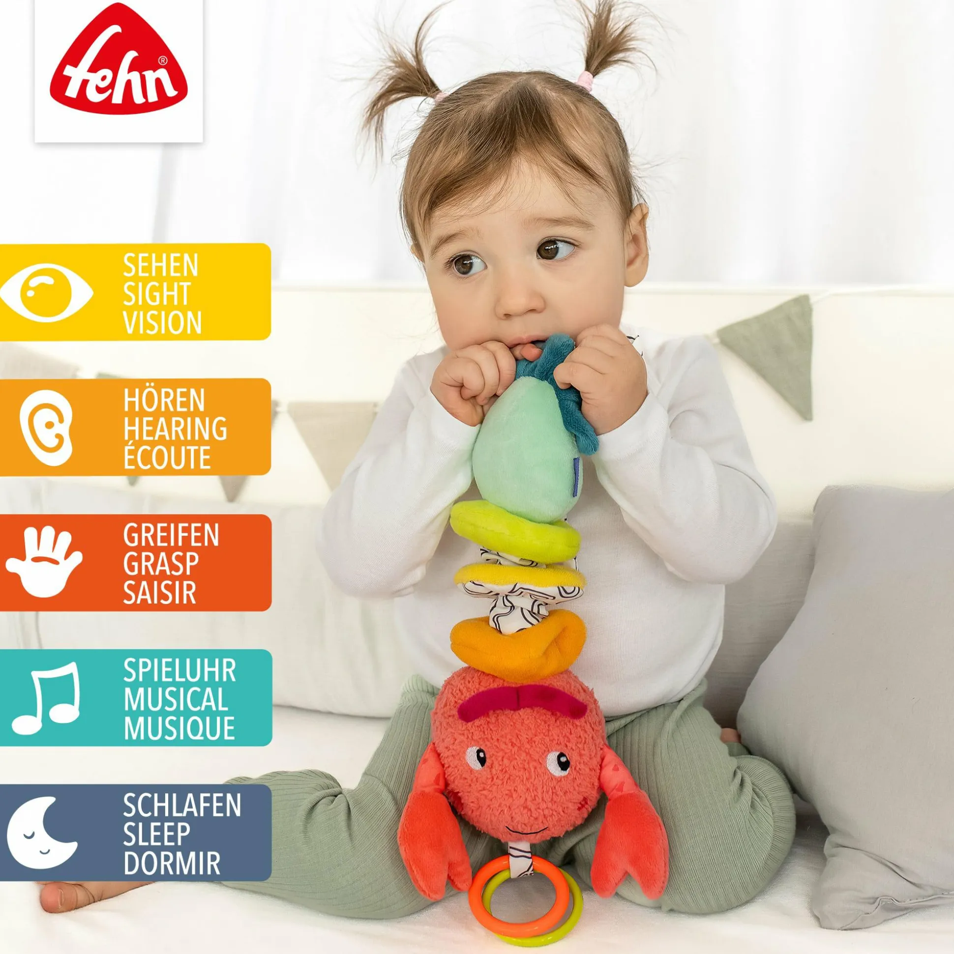 Dazu lässt sich der Hummer mit den praktischen Bändchen ganz einfach am Babybett, Kinderwagen oder an der Babyschale befestigen, während seine Scheren und Ringe zum Greifen, Knuddeln und Liebhaben einladen.