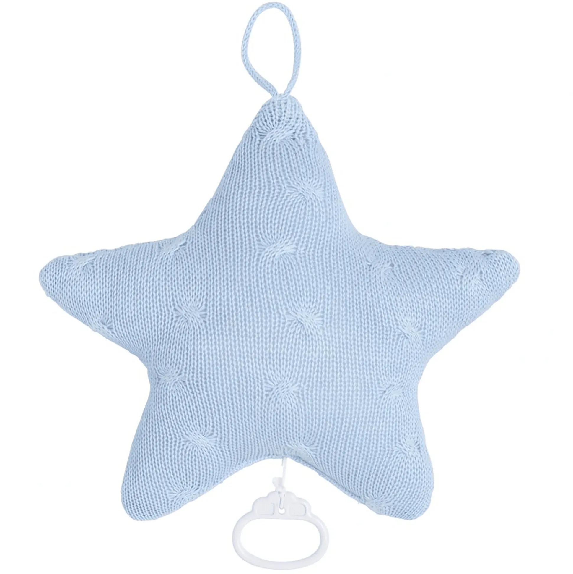 Mit dieser niedlichen, gestrickten Spieluhr schläft dein Baby direkt ein. Sie eignet sich als Dekorationsartikel fürs Kinderzimmer oder zur Befestigung am Bett oder Laufgitter. Mit dem Kordelzug aktivierst du die Spieluhr und sie spielt die Melodie ‚Funkel, Funkel, kleiner Stern‘. Das moderne Zopfmuster lässt sich wunderbar mit weiteren Artikeln der Serie kombinieren.
