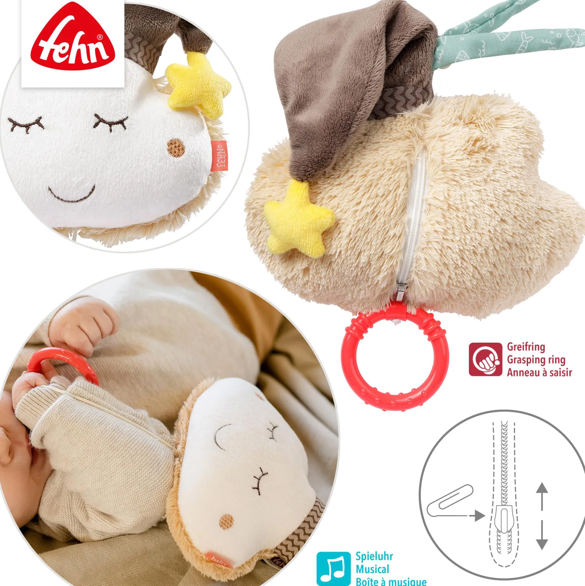 Die süße Spieluhr Wolke mit Mütze von fehn beruhigt dein Baby in jeder Situation. Die flauschige Wolke mit Ihrem freundlichen Gesicht wiegt dein Baby behutsam in den wohlverdienten Schlaf. Nach Aufziehen der Spieluhr erklingt ein beliebtes Einschlaflied. Das süße Wölkchen ist nicht nur die ideale Einschlafhilfe, sondern lässt sich dank der zwei Bändchen ganz einfach am Bettchen, Kinderwagen oder an der Babyschale befestigen – der perfekte Begleiter. Um das Plüschtier zu Reinigen, kann das Spielwerk nach Öffnen des Sicherheitsverschlusses einfach entnommen werden und bei 30°C gewaschen werden.
