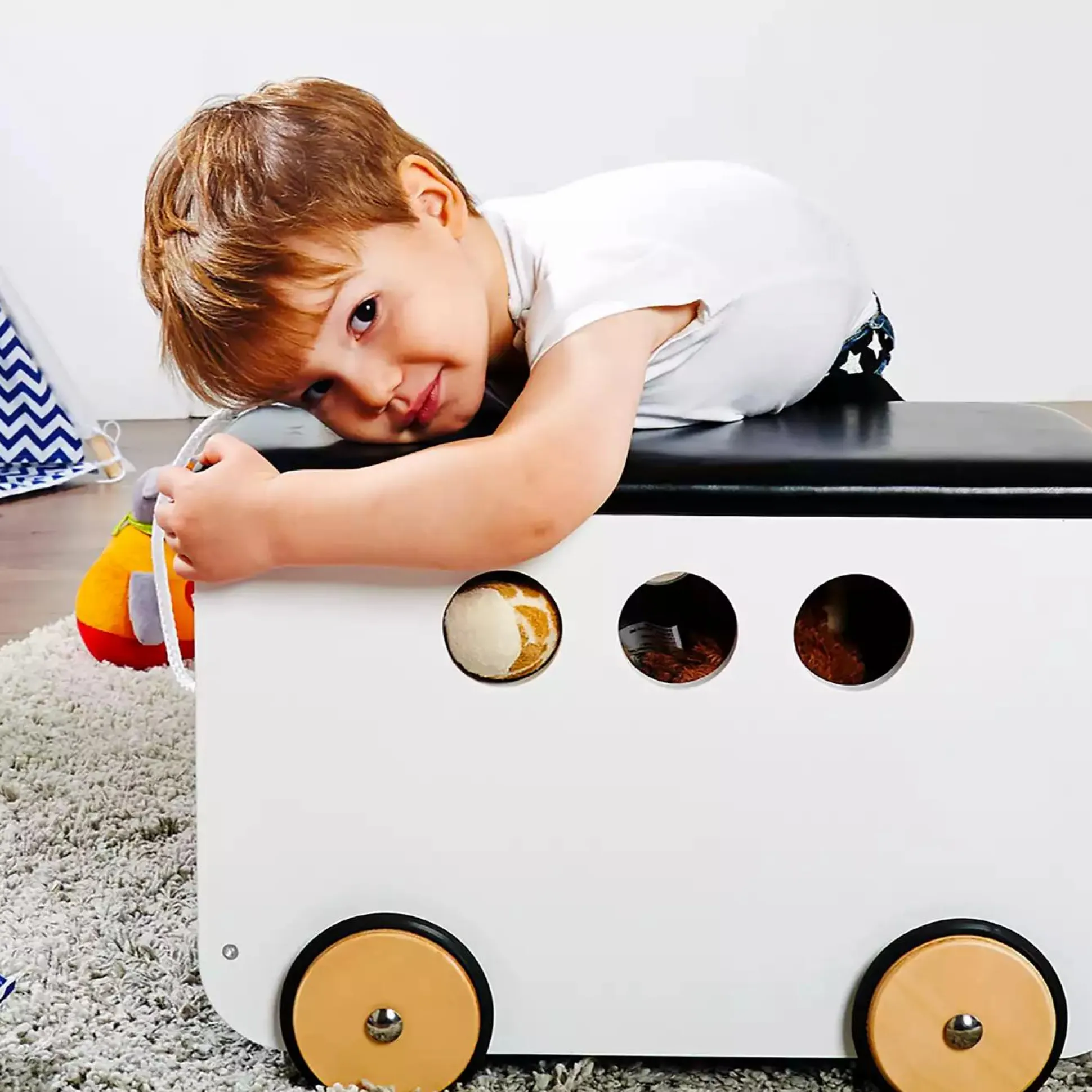 Die Spielzeugkiste Jim von Pinolino sorgt für Ordnung im Kinderzimmer. Durch den abnehmbaren Deckel bleiben die Spielsachen stets im Blick und griffbereit. Die gummierten Holzräder sowie eine Zugschnur erleichtern zudem das Schieben der Spielzeugkiste für dein Kind. Die hochwertige Verarbeitung der modernen Spielzeugkiste sorgt für langanhaltende Freude. Mit dem Mix aus Schwarz und Weiß liegt die Truhe absolut im Trend und wird zum echten Hingucker in jedem Kinderzimmer. Sie ist ein perfektes Geschenk für Mädchen und Jungs zum Geburtstag oder zu Weihnachten. Pinolino erfüllt seit 1997 Kinderträume und vertreibt Kindermöbel, Accessoires und Spielwaren. Das deutsche Unternehmen verwendet nur für Kinder geeignete Lacke, Lasuren und Öle, ist Mitglied im DVSI und gewährt 10 Jahre Pinolino-Plus-Garantie.