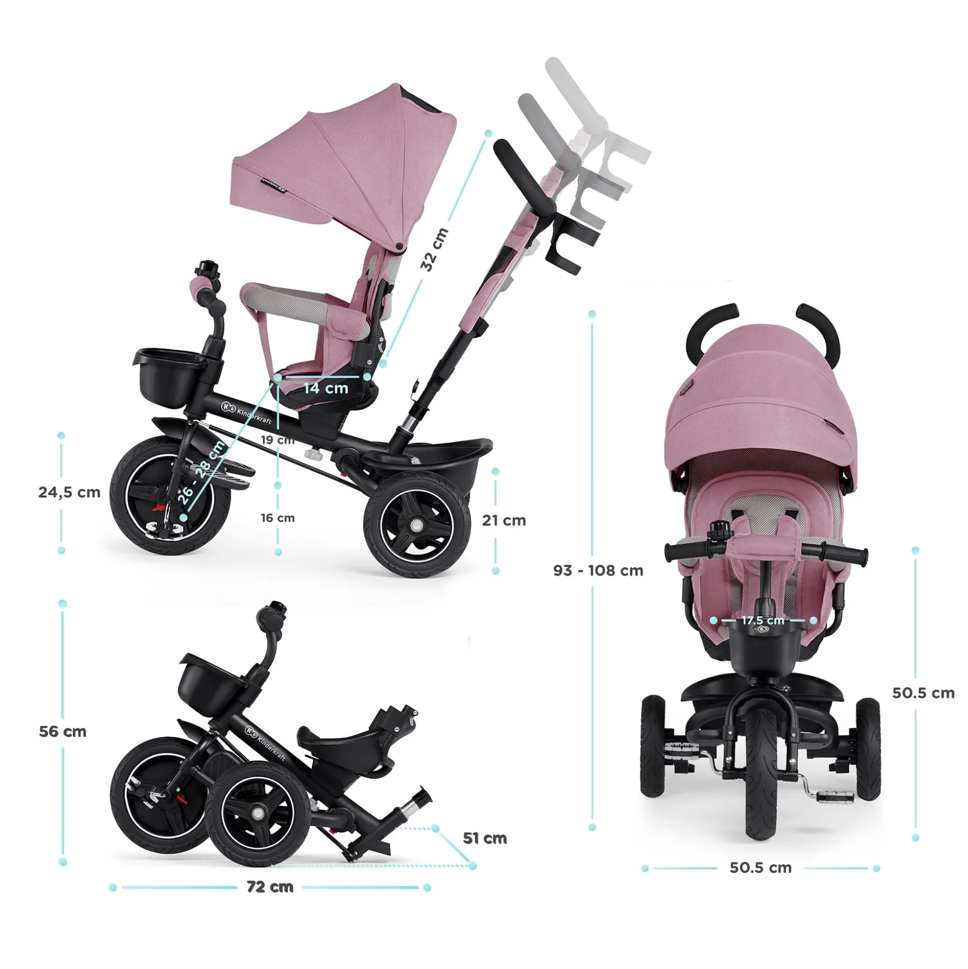 Der weiche Sitz ist mit einem verstellbaren 3-Punkt-Gurt mit Polstern ausgestattet. Das zusammenklappbare Dreirad hat zudem einen Schutzbügel, der einfach zu bedienen ist und sich zentral öffnen lässt. Du hast außerdem einen leichten Zugriff auf die beiden Bremsen, die sich an den Hinterreifen befinden. Das tiefe, wasserfeste Verdeck mit UPF50+ Filter sorgt zusätzlich dafür, dass auch ein Spaziergang im Nieselregen oder in der prallen Sonne kein Problem sein wird!