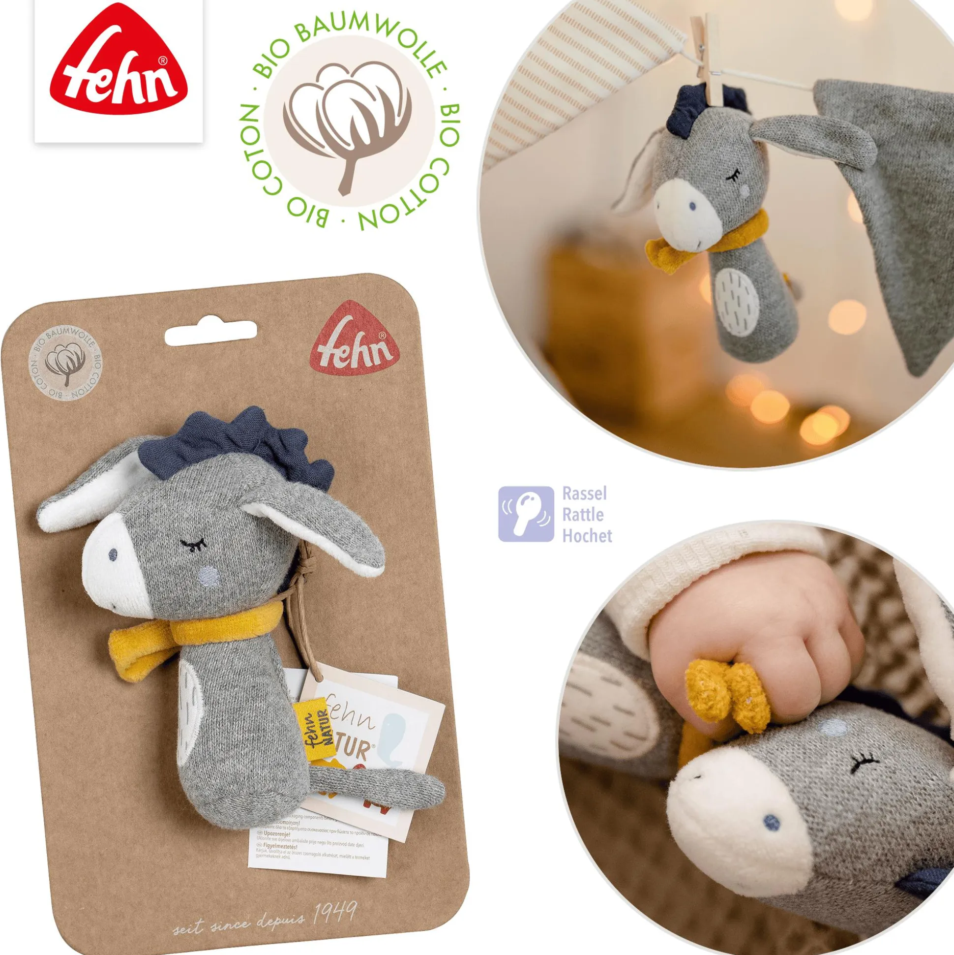 Der niedliche Stab-Greifling Esel von fehn ist ein wunderbares Spielzeug für dein kleines Wunder! Er ist ein treuer Gefährte, der dein Kind von Geburt an begleitet. Mit einer sanften Rassel und einem vielseitigen Materialmix aus Bio-Baumwolle (Strick, Jersey, Nicki, Musselin) bietet er nicht nur spielerischen Spaß, sondern fördert auch die Sinne deines Babys. Von unabhängigen Testinstituten auf Sicherheit geprüft, kannst du dich voll und ganz auf die Qualität und Sicherheit dieses Greiflings verlassen. Er ist perfekt für kleine und zarte Babyhände geeignet.