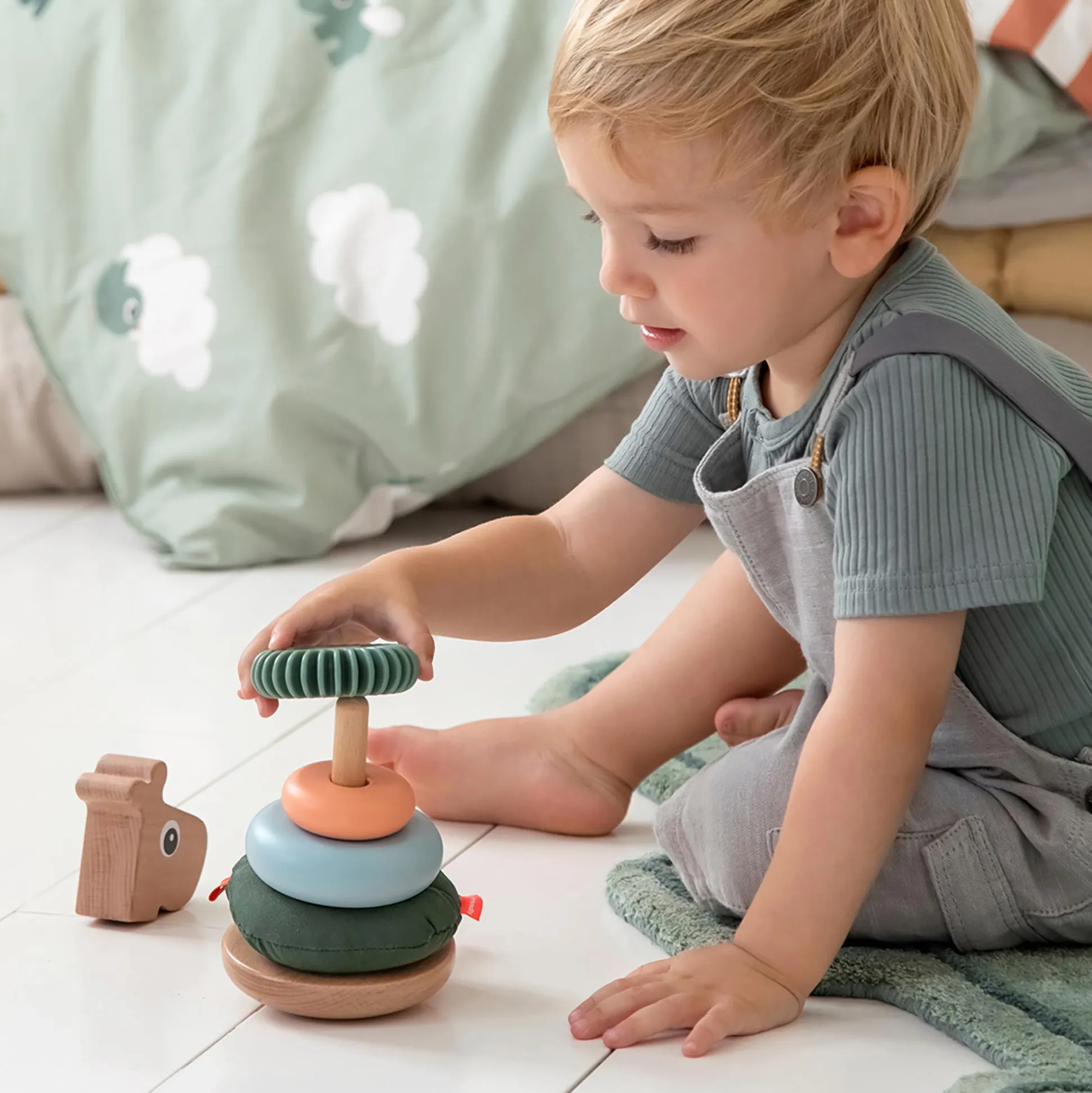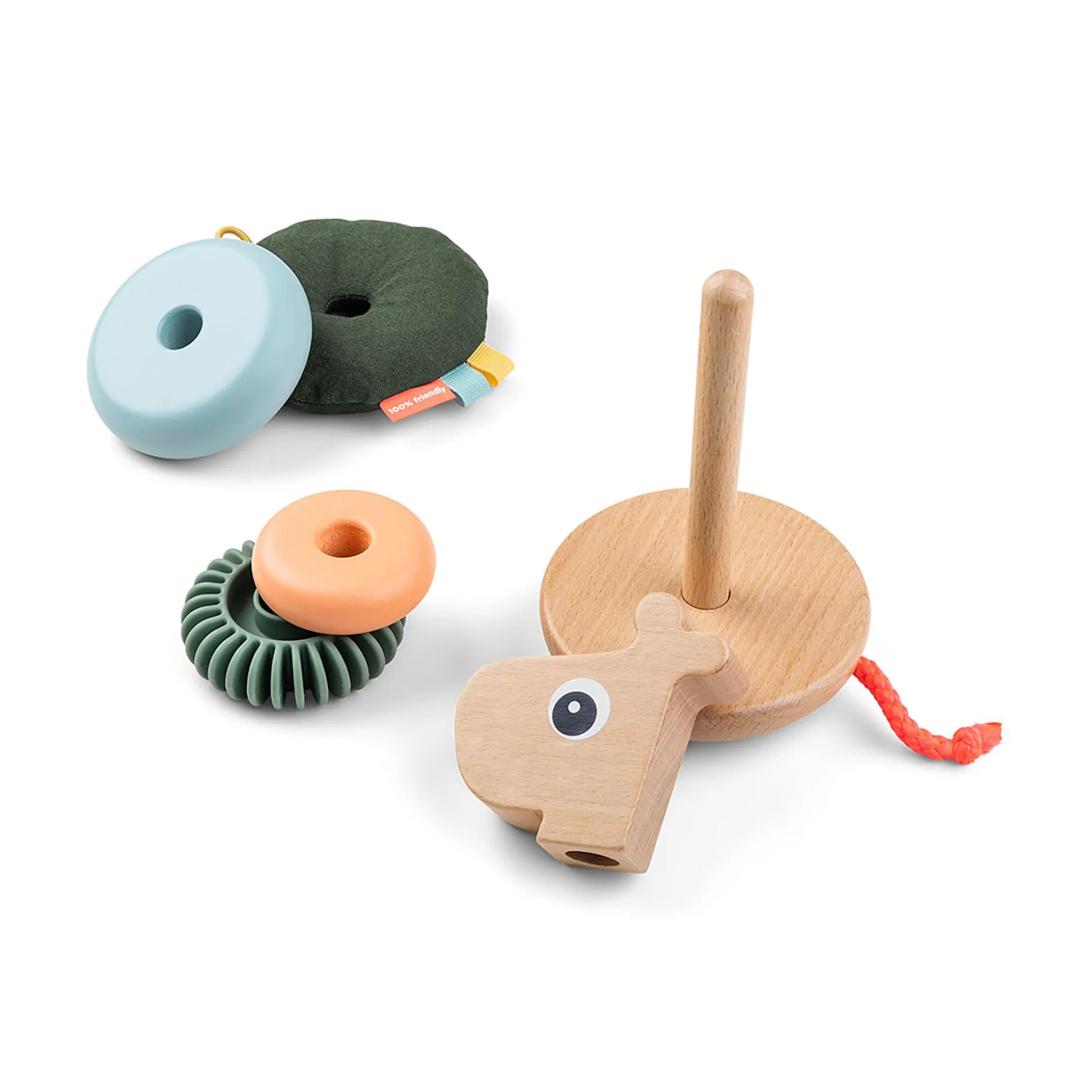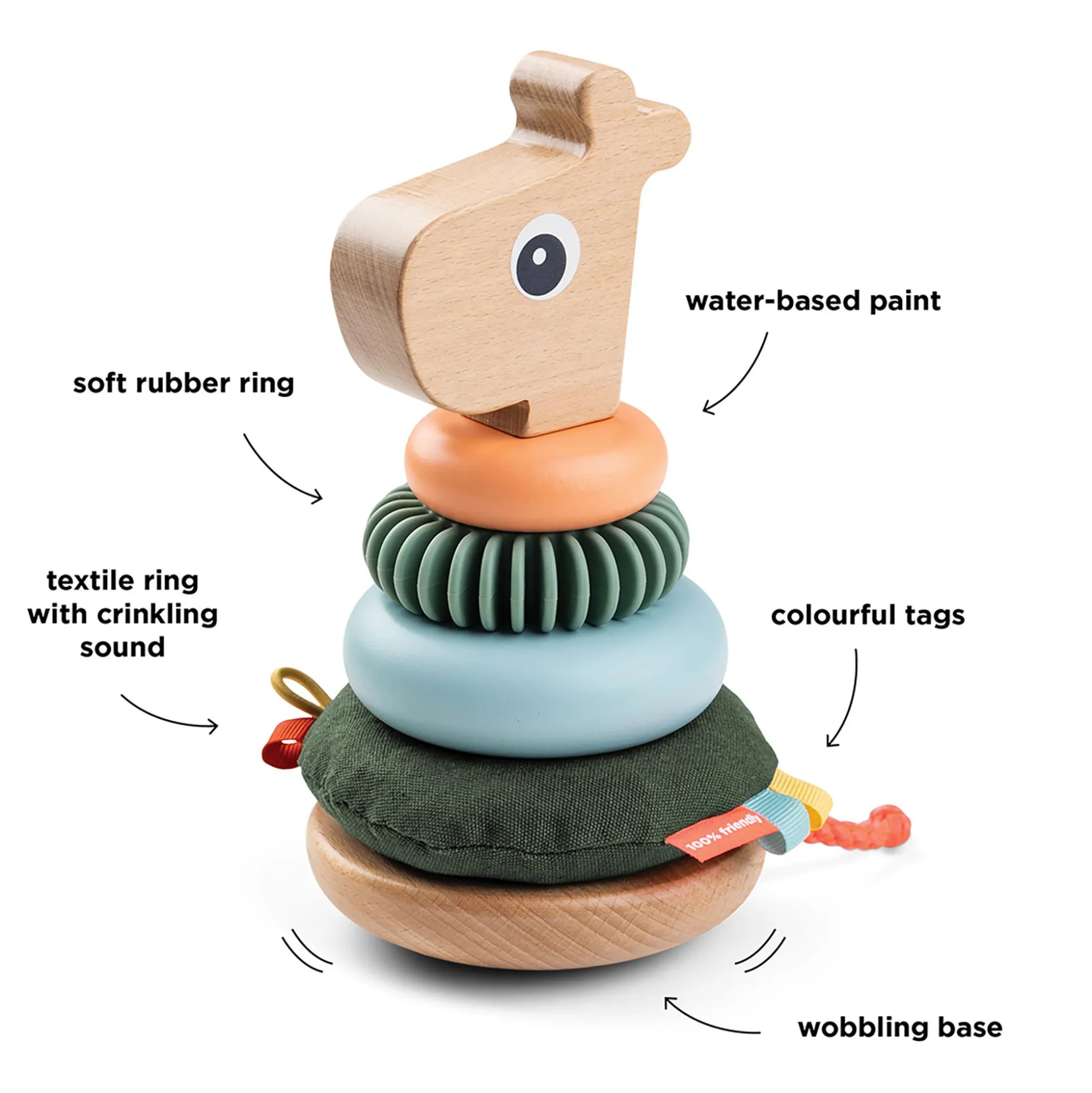 Die Ringe sind in verschiedenen Größen hergestellt – einige davon mit kleinen Anhängern, Textilien und Rillen. Der Stapelturm verfügt außerdem über eine Kippfunktion und einen kurzen Schwanz zum Ziehen – beides dient dazu, die Sinne deines Kindes spielerisch anzuregen.