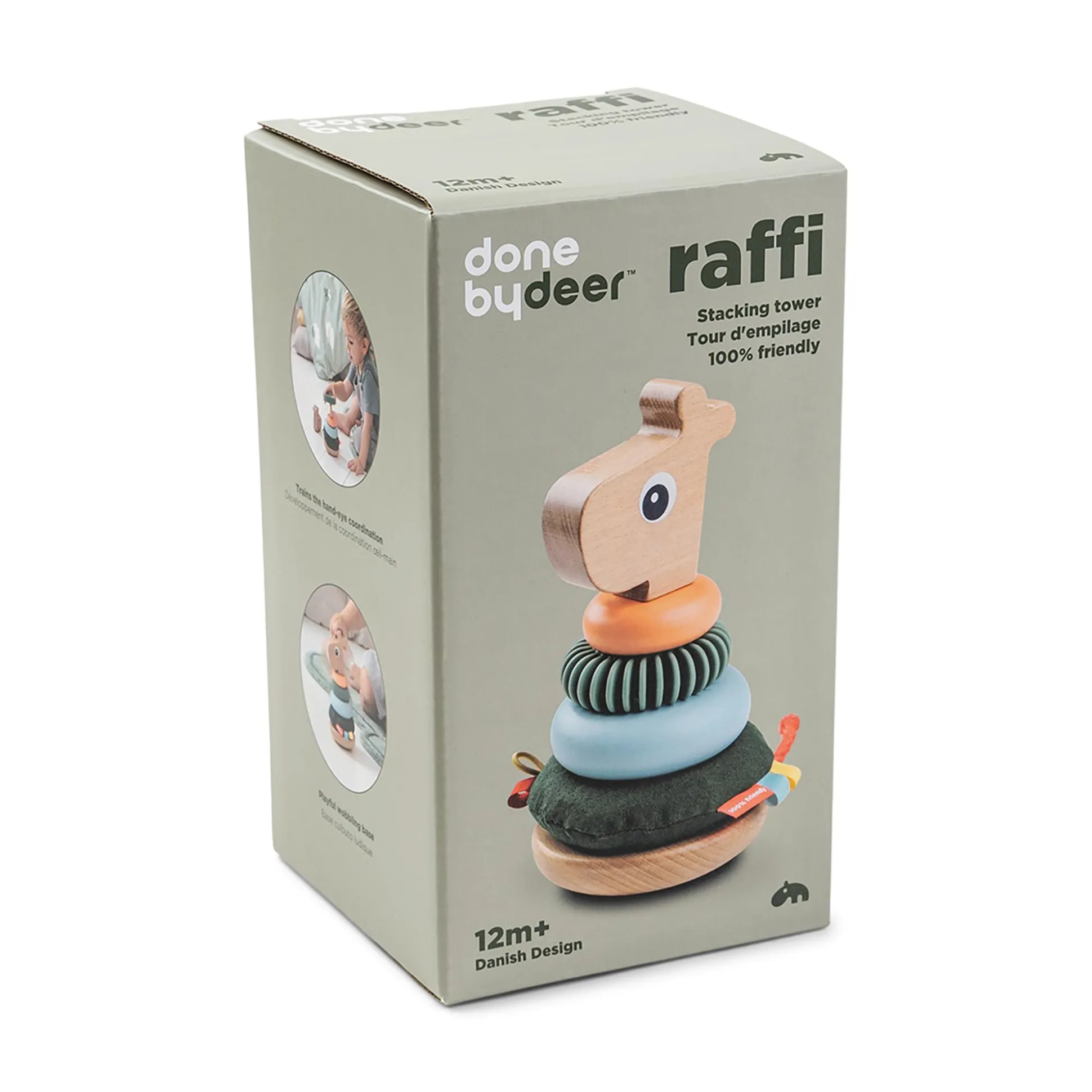 Der Raffi Stapelturm ist in fröhlich bunten Farben gehalten. Das Holzspielzeug wird aus Holz aus verantwortungsvoller Forstwirtschaft hergestellt und mit Farben auf Wasserbasis lackiert, die frei von schädlichen Stoffen sind – so kann dein Kind sicher damit spielen.