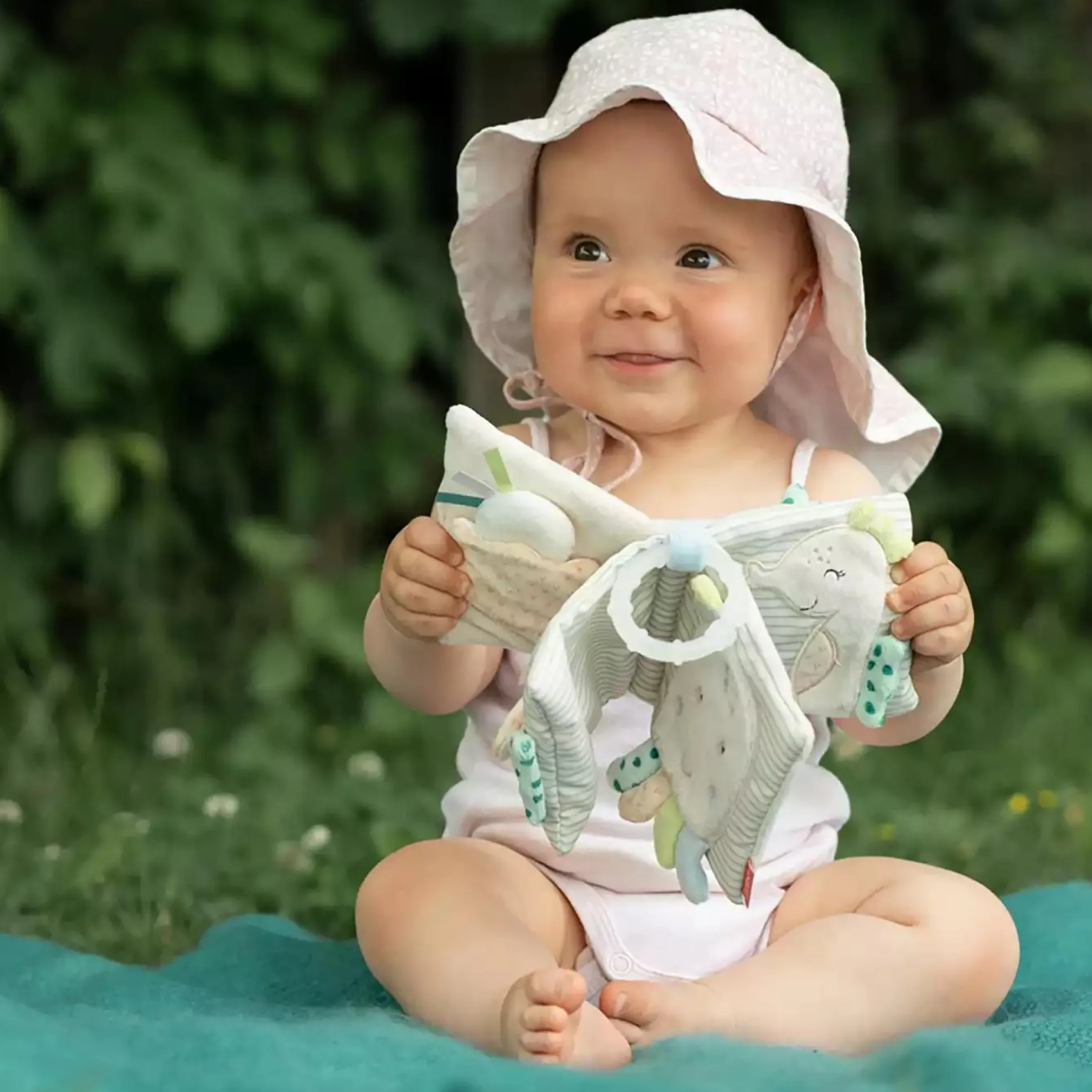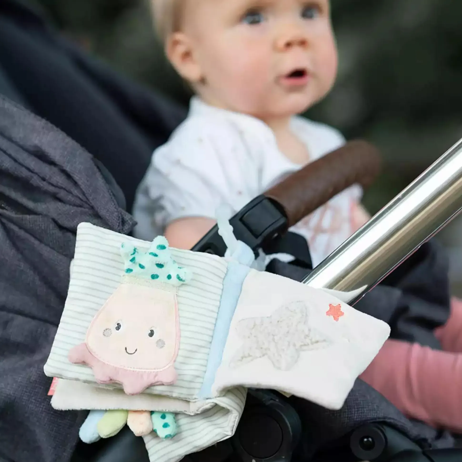 Die versteckte Quietsche, das Raschelpapier und der kleine Spiegel fördern gleichzeitig spielerisch den Greif- und Tastsinn, die Fantasie sowie die Selbsterkennung deines kleinen Lieblings. Dank des Befestigungsrings ist das Stoffbuch Oktopus von fehn ideal für zuhause und unterwegs geeignet – es kann ganz einfach am Kinderwagen, an der Babyschale oder am Babybett befestigt werden.
