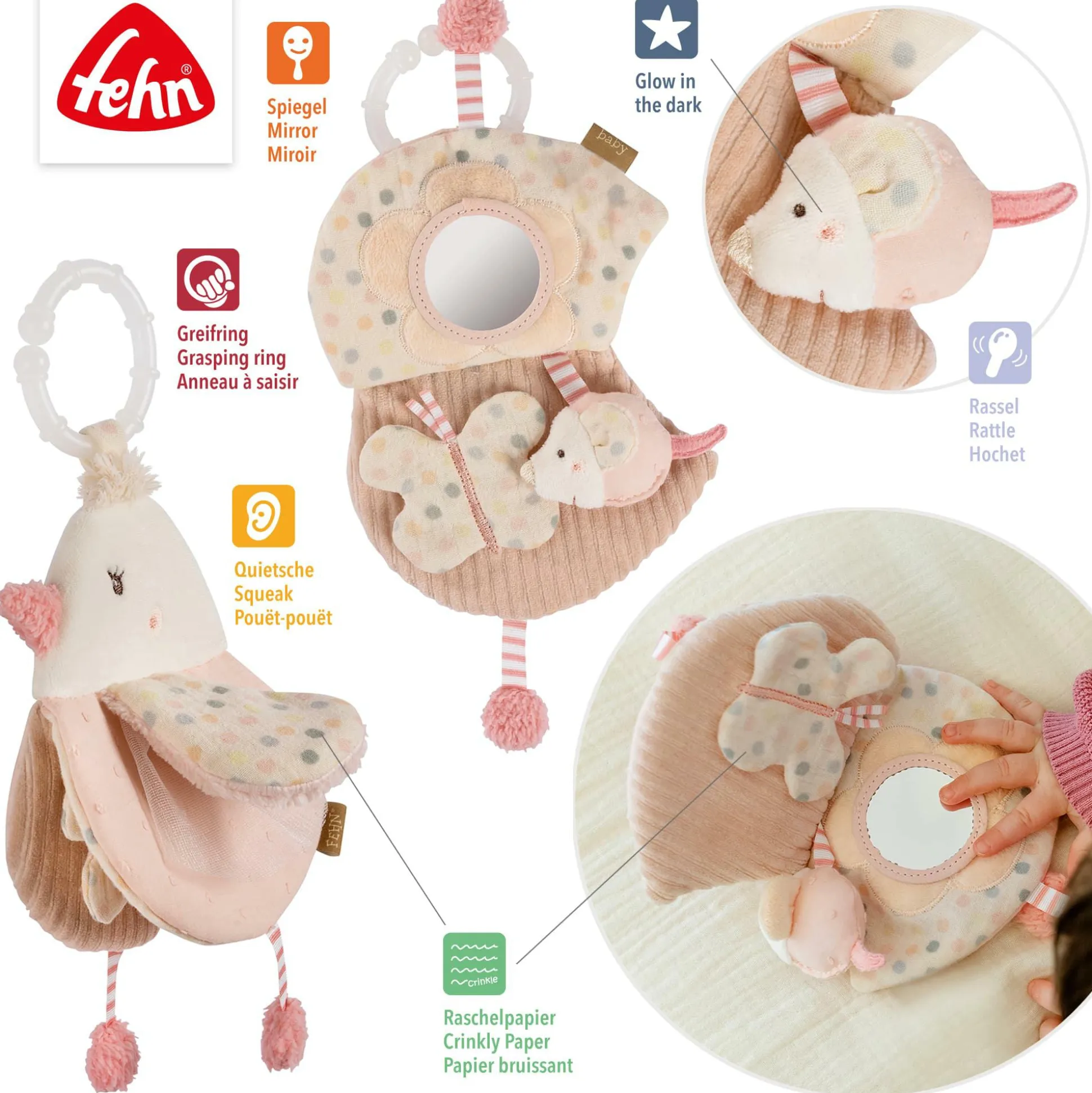 - mit Quietsche, Raschelpapier, Rassel und Spiegel