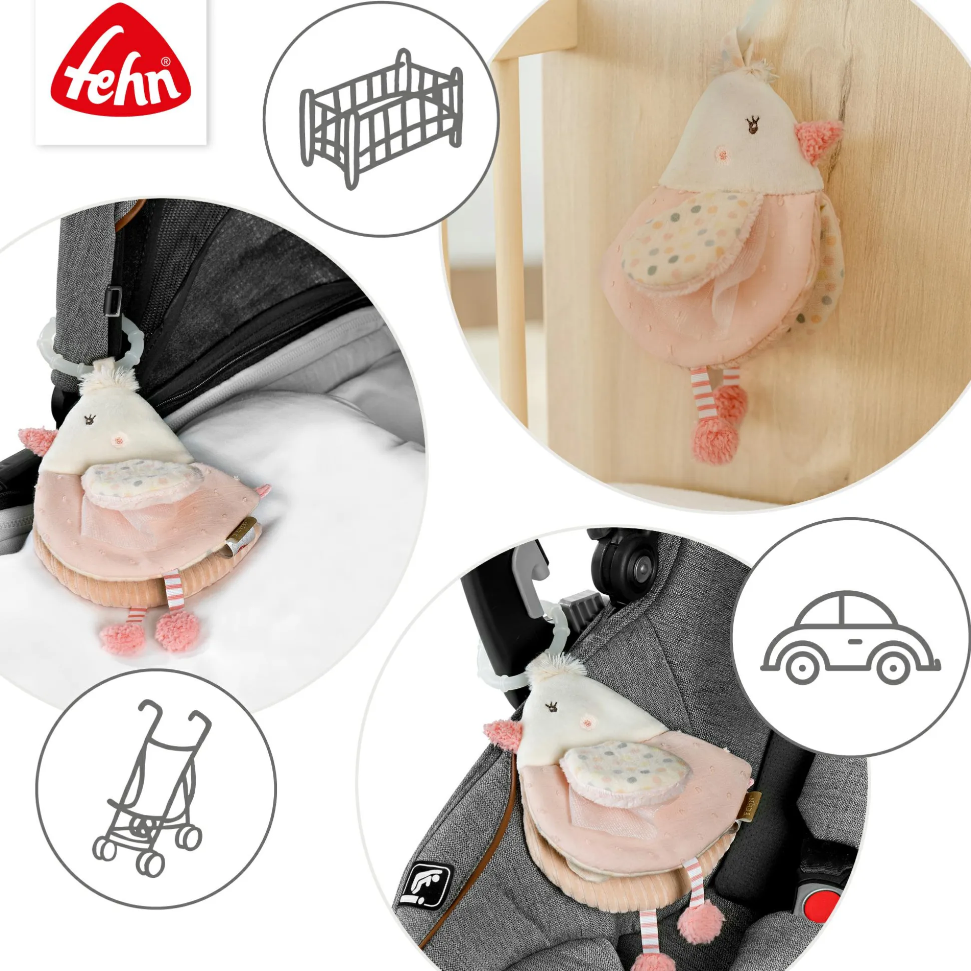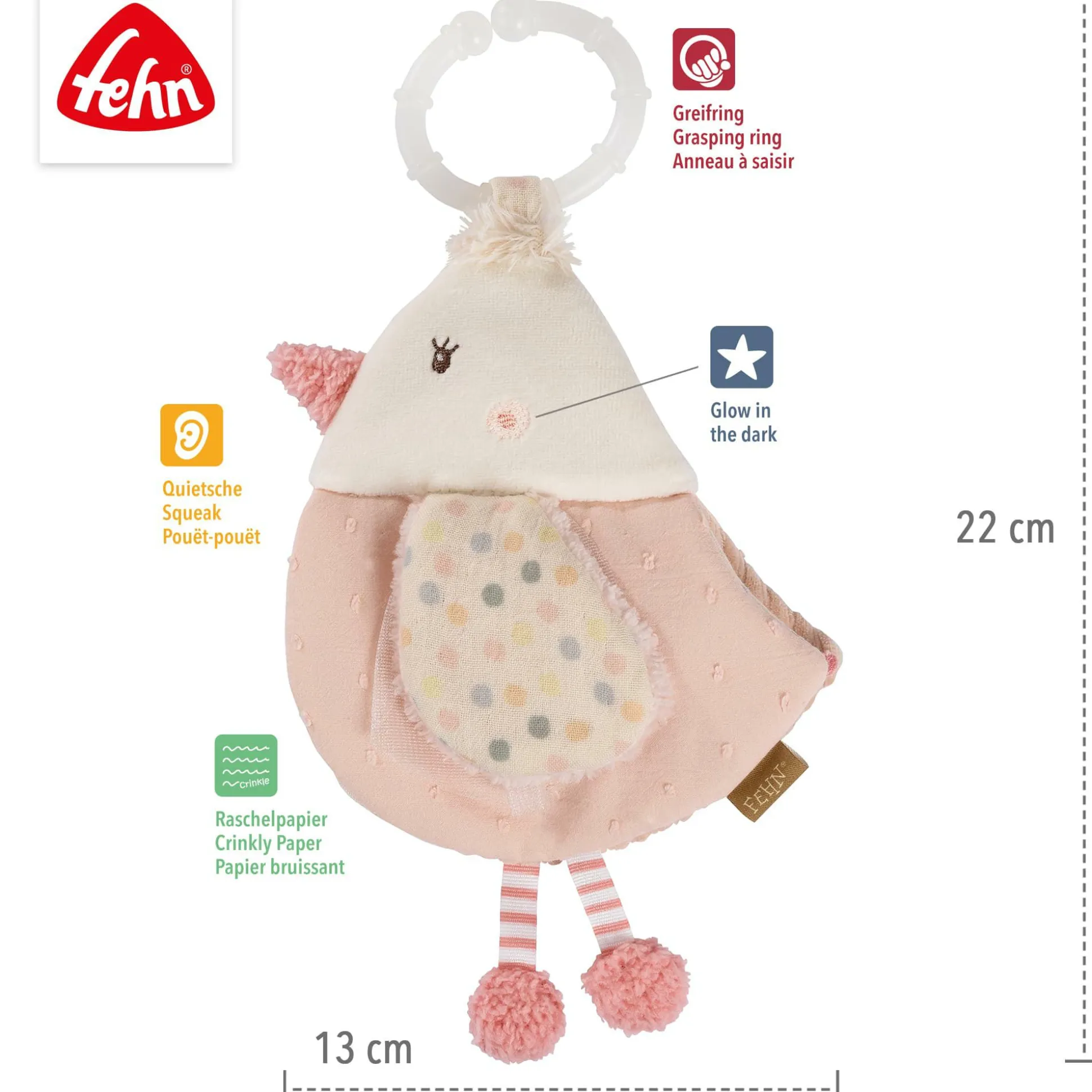 Das Stoffbuch Vogel von fehn ist ein interaktives Babybuch in Form eines süßen Vogels, das zum Fühlen, Greifen und Staunen einlädt. Es enthält eine Quietsche, etwas Raschelpapier, eine Rassel, einen Spiegel und „Glow-in-the-dark“-Elemente. All diese Komponenten fördern die ersten Greifübungen und die Entwicklung der Sinne. Und das Beste? Das Buch kann ganz leicht am Kinderwagen, im Auto oder am Babybett befestigt werden und wird so zu einem idealen Begleiter für zu Hause und unterwegs.