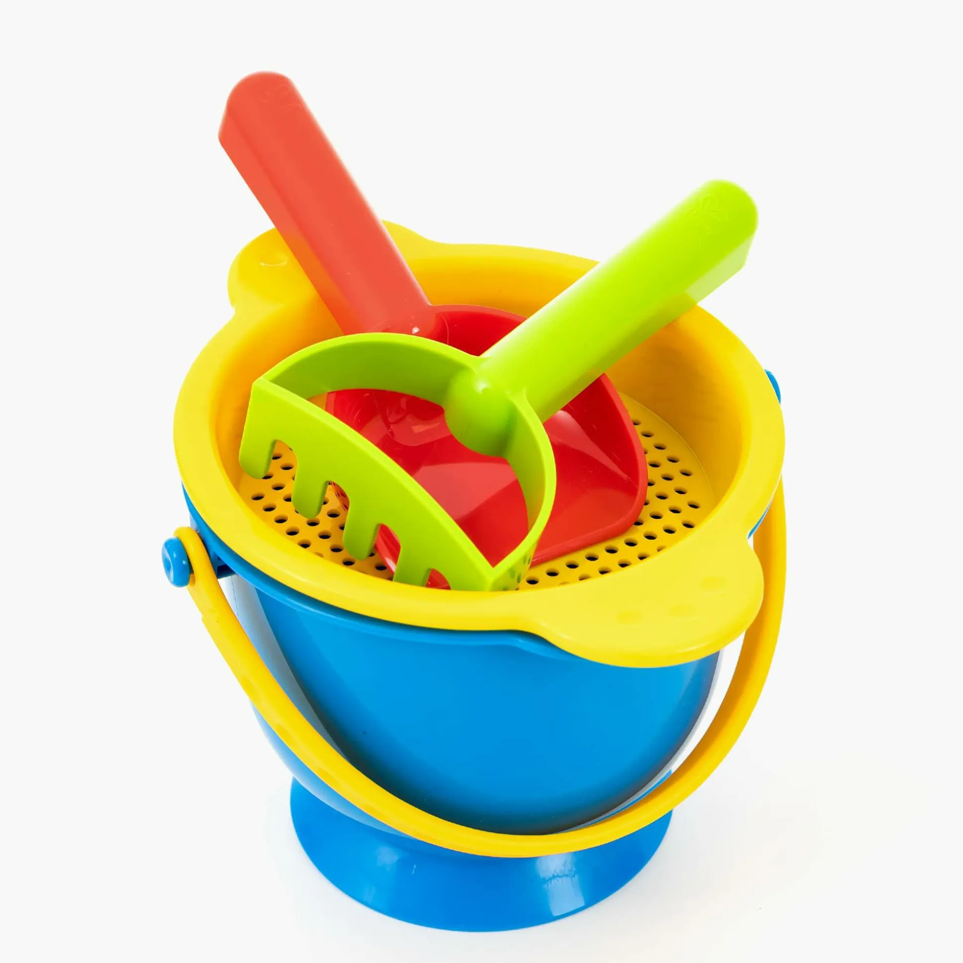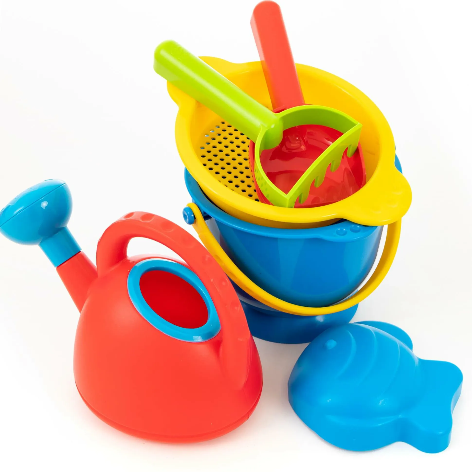 Farbenfroher Strandrucksack von Hape inklusive jeder Menge Sandspielzeug. Im Rucksack befinden sich ein Eimer, eine Schaufel, ein Rechen, ein Förmchen und eine leicht zu tragende Gießkanne. Das regt zum Nachahmungs- und Fantasiespiel an, fördert aber auch das Geschichtenausdenken, das Rollenspiel und die Kreativität. Alles findet seinen Platz im Rucksack – also ab ans Meer.