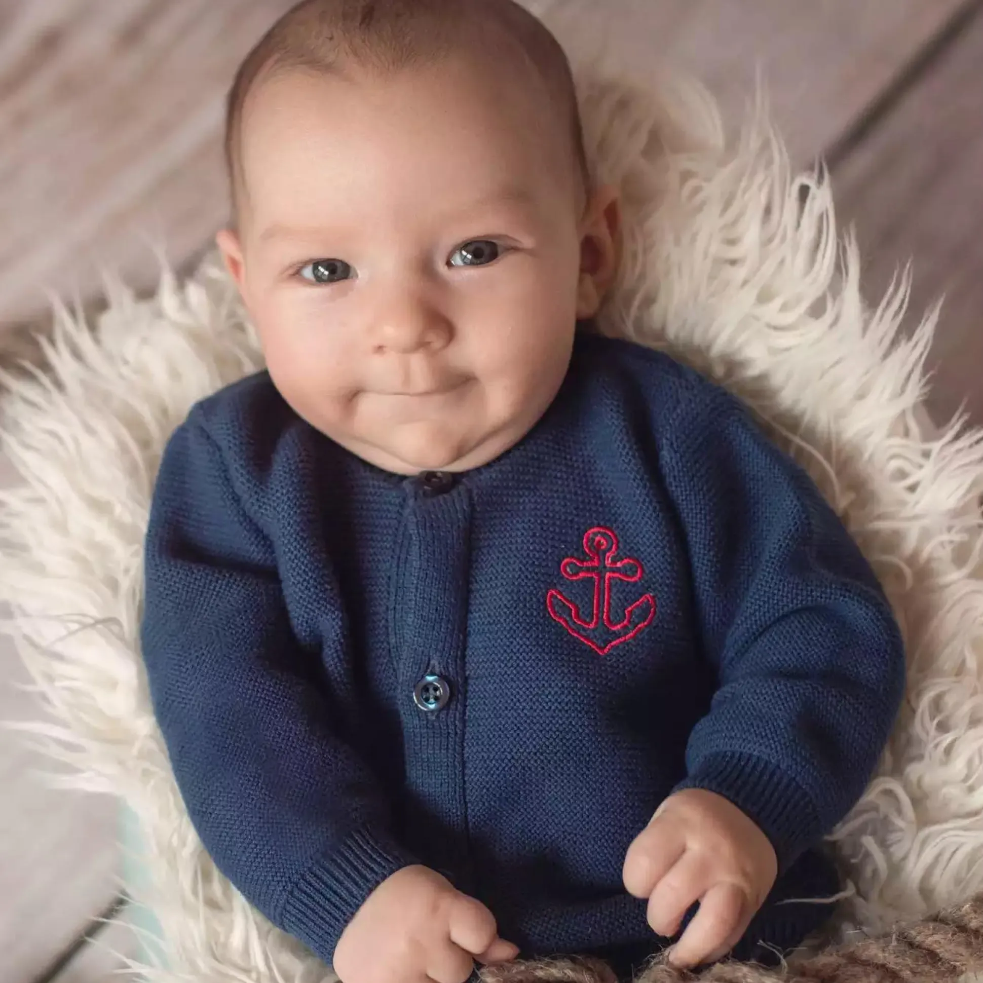 Strickjacke für kleine Matrosen! Diese tolle Jacke aus 100% Baumwolle wird zum Lieblingsstück in jedem Kleiderschrank. Einfach an kühlen Tagen über ein Hemd oder Shirt überziehen und schon kann es losgehen. Ihr klassisches Strickdesign in Kombination mit der hochwertigen Anker Stickerei, macht sie zu jedem Anlass tragbar.