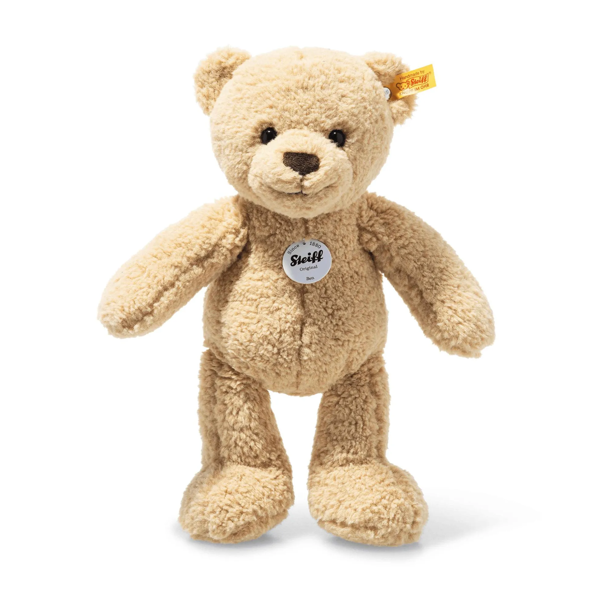 Der Teddybär Ben von Steiff aus der Soft Cuddly Friends Kollektion ist ein treuer Spielgefährte und ein stolzes Mitglied der Steiff Bärenbande. Mit einer Größe von 30 cm und aus kuschelweichem, beigefarbenem Teddyfleece gefertigt, bietet Ben optimalen Spiel- und Kuschelkomfort. Seine charakteristischen Mittelnähte, die gemütliche Form und die abgesetzten Tatzen verleihen ihm einen einzigartigen, liebevollen Look. Ben ist ein aktiver Teddybär, der immer in Bewegung ist und gerne mit seiner Teddybärenfamilie spielt. Mit seinem fröhlichen Lachen und dem typischen „Knopf im Ohr“ aus Edelstahl ist er ein echter Klassiker, der Kindern Freude bereitet und zu einem unverzichtbaren Begleiter wird.