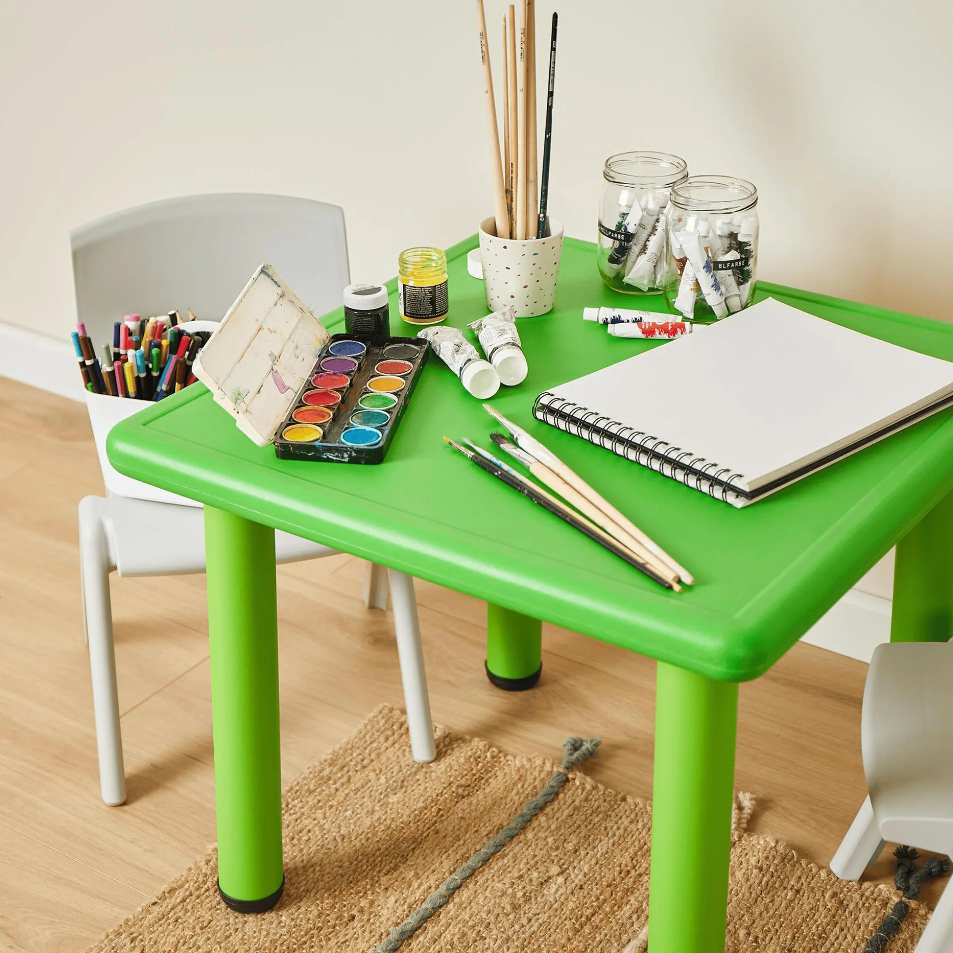 Die Ecken und Kanten des Tisches sind abgerundet, damit sich dein Nachwuchs nicht daran verletzen kann. Der Tisch ist aus hochwertigem Kunststoff hergestellt und enthält keine Schadstoffe. Das Material macht den kleinen Tisch zu einem absoluten Allrounder. Er ist leicht aber stabil und super leicht mit einem feuchten Tuch zu reinigen. Damit er extra lange verwendet werden kann, ist er in der Höhe verstellbar und wächst so mit deinem Liebling mit.