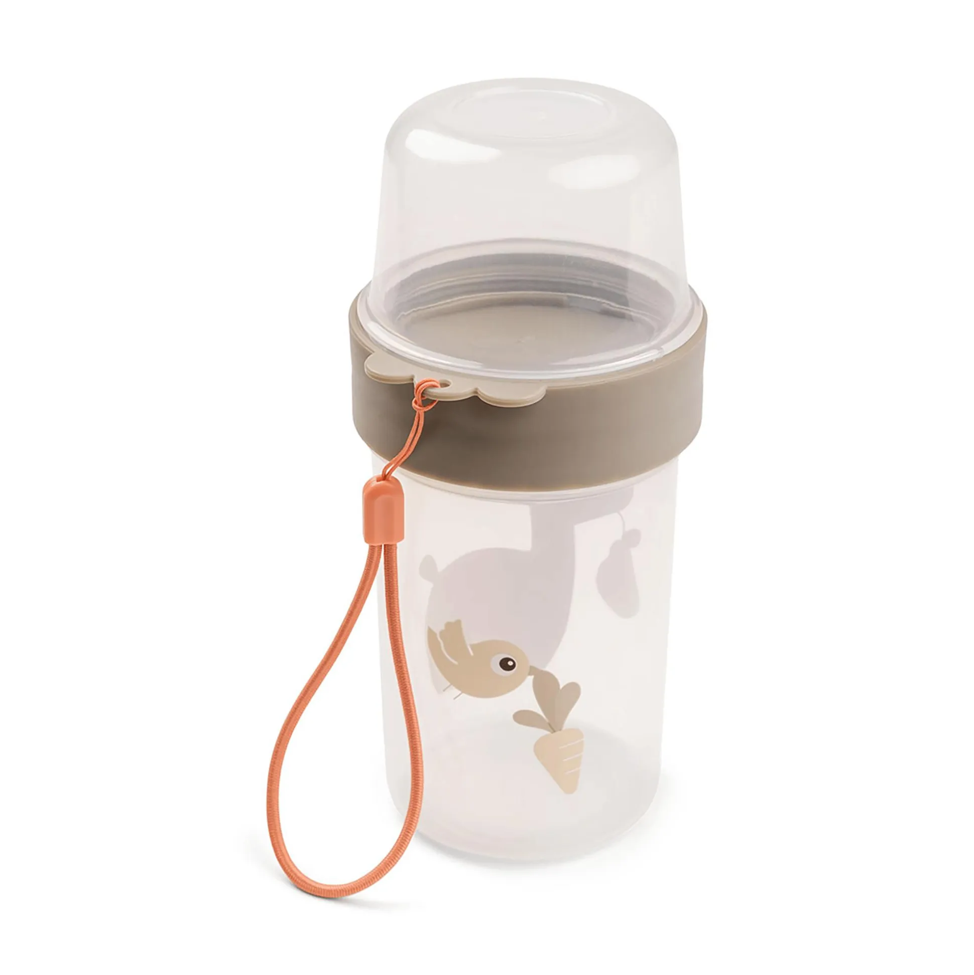Der große, auslaufsichere 2-Wege-Snackbehälter ist rundherum mit zuckersüßen Motiven versehen. Auf der Vorderseite genießt Lalee eine Birne und auf der Rückseite fliegt Birdee mit einer frisch gepflückten Karotte davon. Er besitzt zudem einen praktischen Tragegurt und ist für die Spülmaschine, die Mikrowelle und für den Gefrierschrank geeignet.