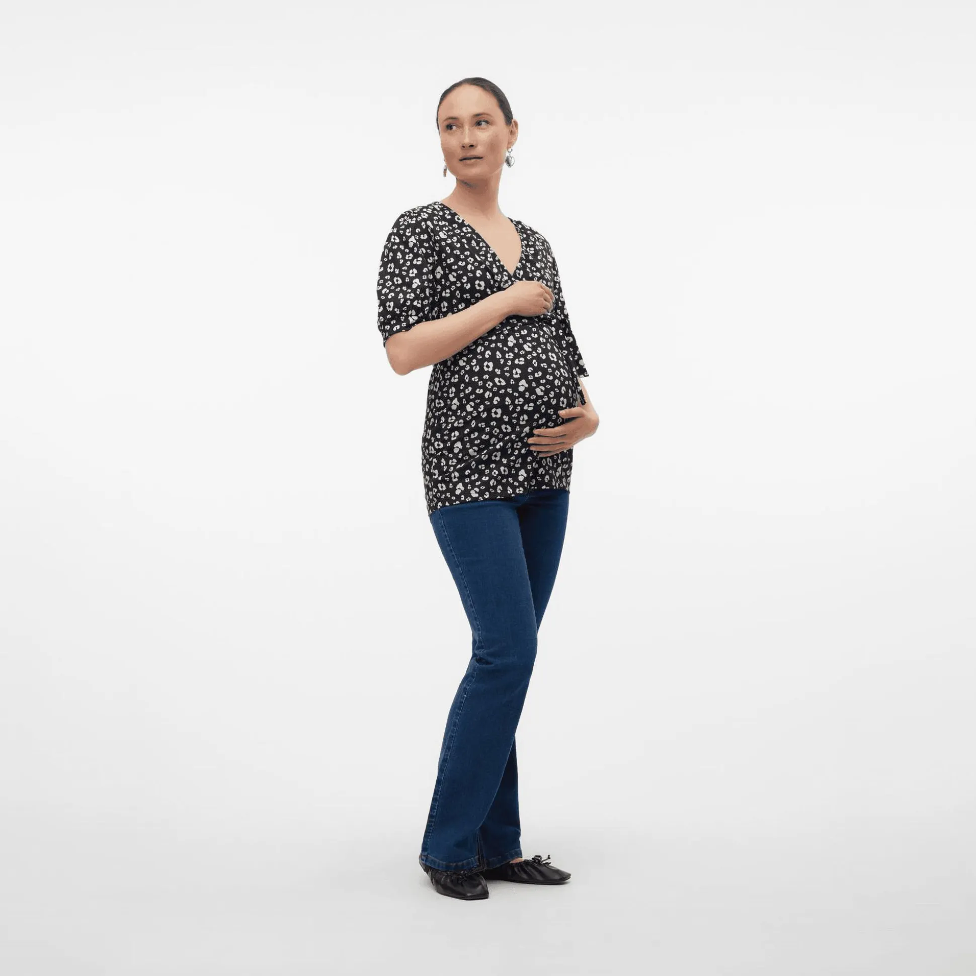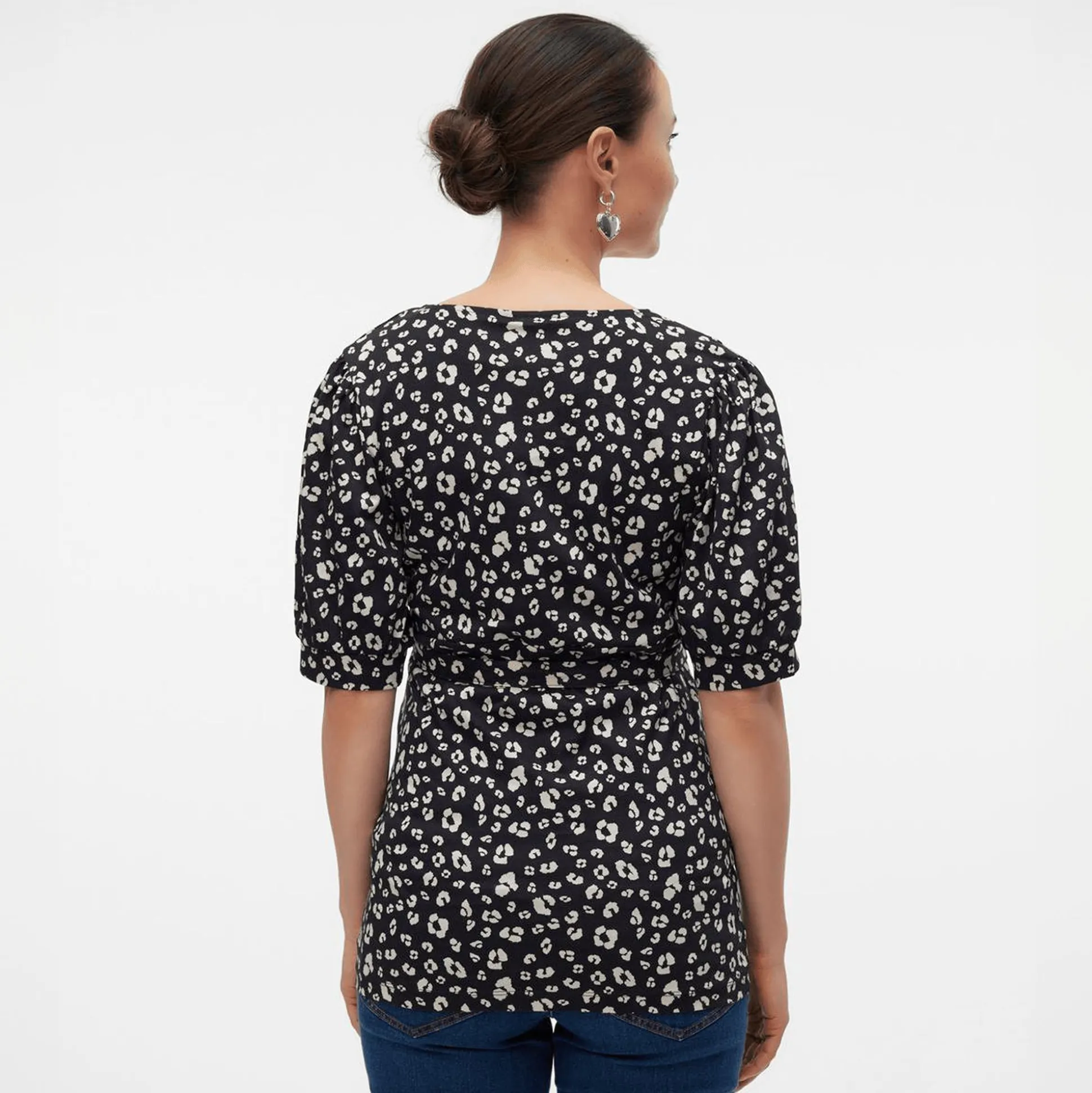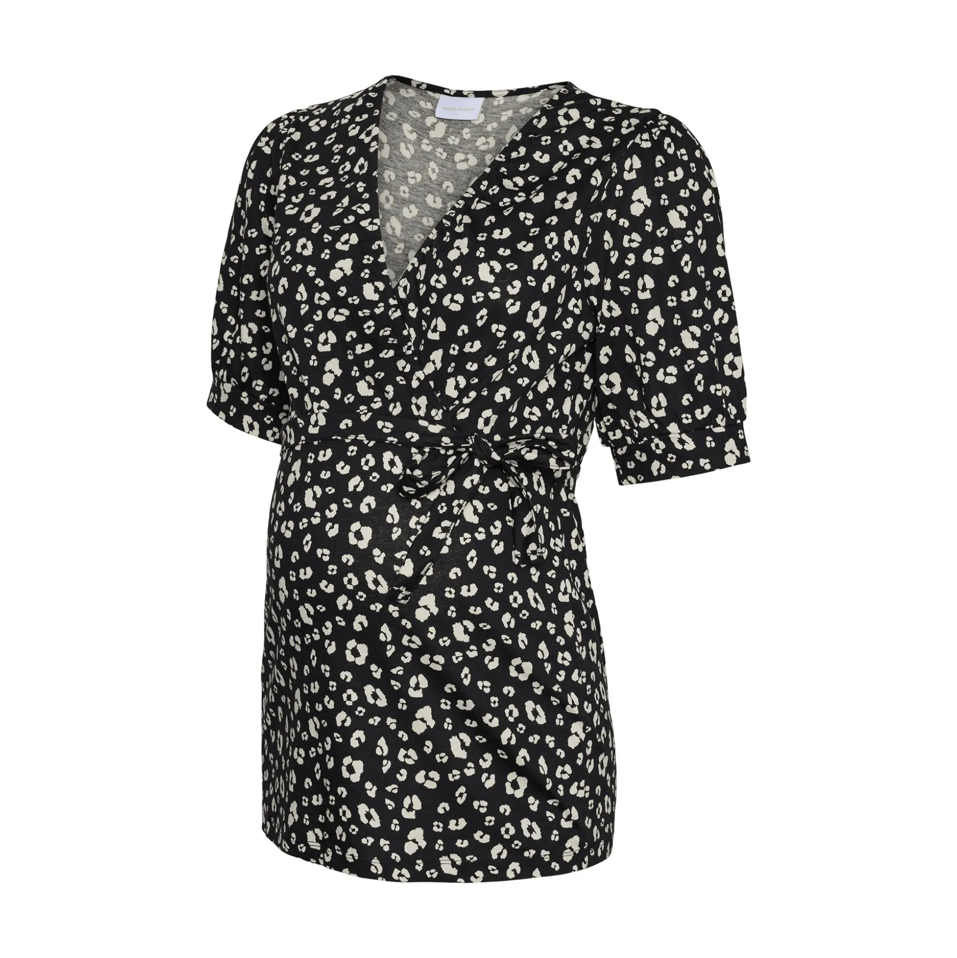 Frische deinen Kleiderschrank mit diesem schicken Mamalicious Umstands-Top auf. Der tolle Allover-Print sowie der V-Ausschnitt machen das kurzärmlige Oberteil aus 100% weicher Bio-Baumwolle zum echten Hingucker. Dank Stilllage unterm Wickeleffekt eignet sich das schwarze Mamalicious T-Shirt ideal für die Schwangerschaft sowie für die Stillzeit.
