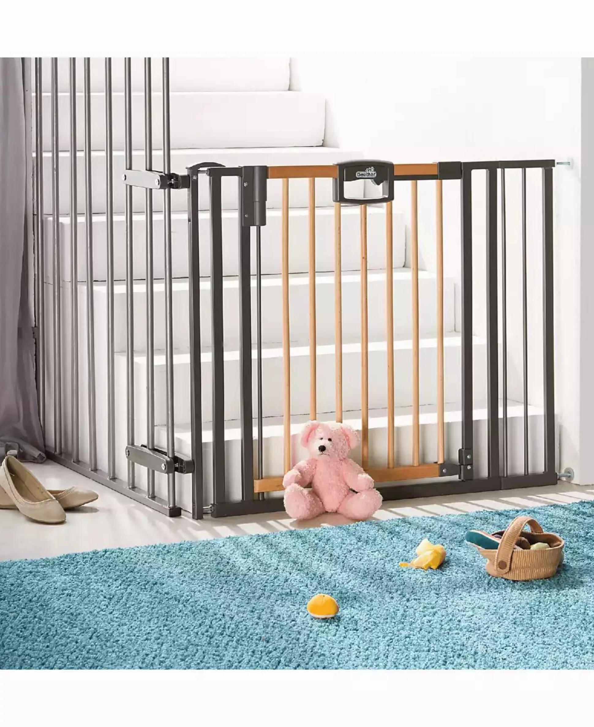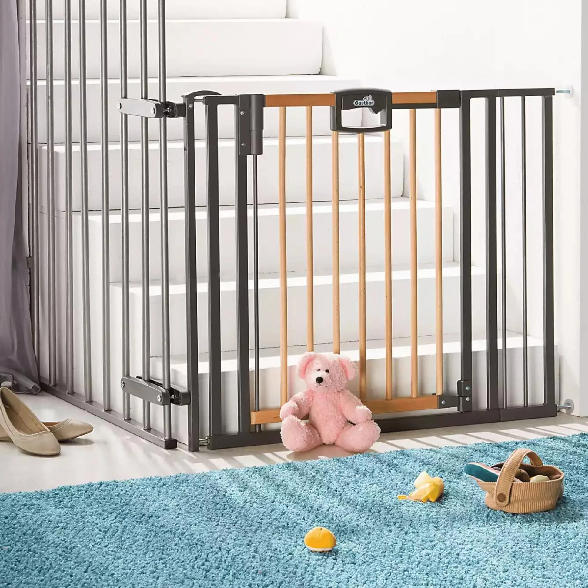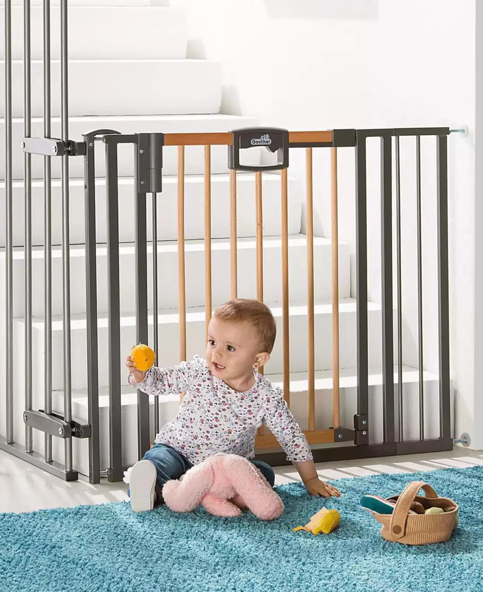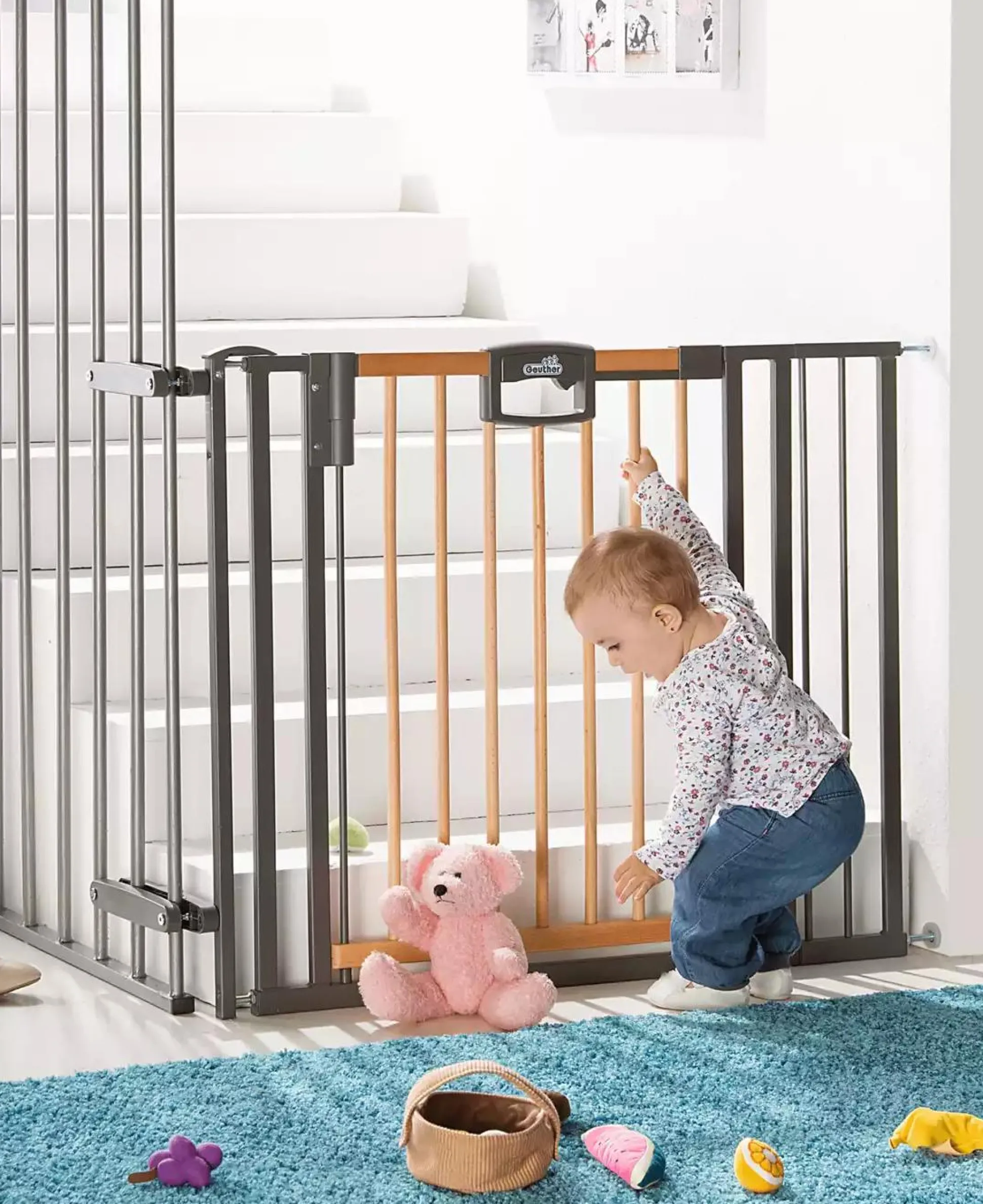 Das Geuther Treppenschutzgitter Easylock Wood Plus 2793 + sichert Treppen mit Geländer optimal ab. Ein extra hohes Gitter und ein Griff mit Doppelsicherung, die nur von Erwachsenen zu öffnen ist, erfüllen bereits heute künftige Sicherheitsnormen. Das Gitter hält ganz ohne Bohren. Dank der Verstellmöglichkeit des Schutzgitters von ca. 84,5 bis 92,5 cm Breite ist Easylock Wood Plus im ganzen Haus einsatzbereit und später ohne Spuren wieder verschwunden!