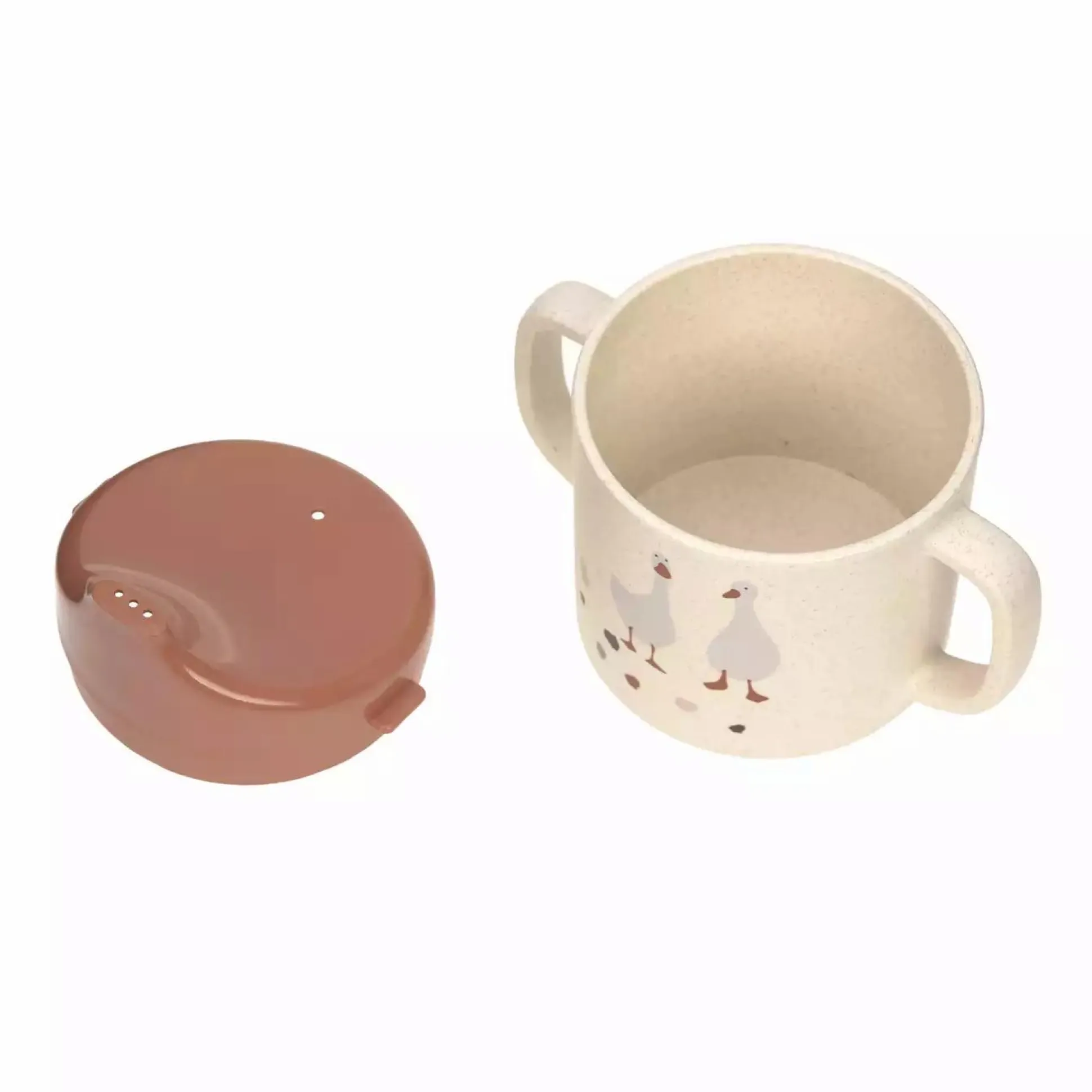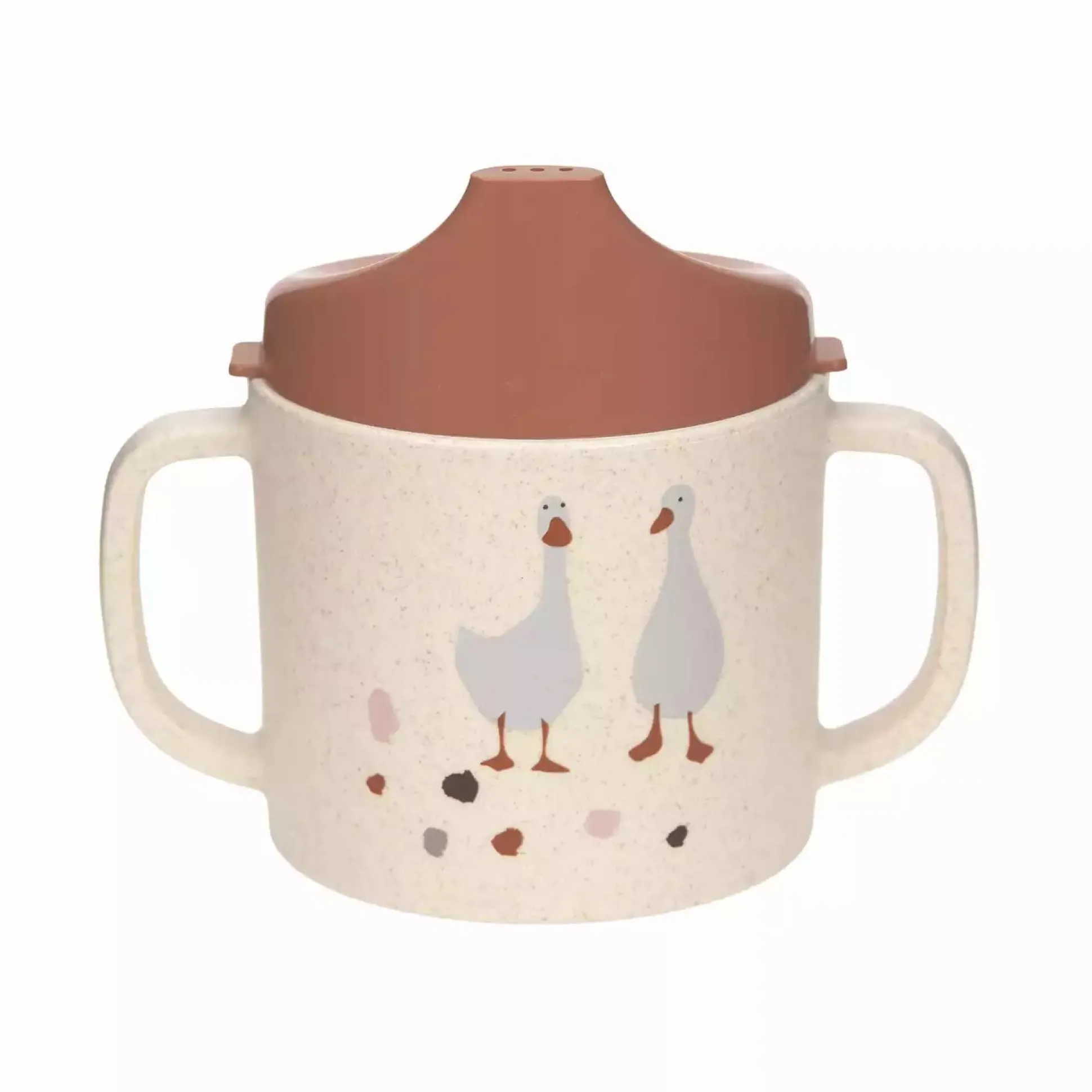 Dank dem praktischen Deckel mit Trinköffnung wird das Trinkenlernen erleichtert. Die zwei Griffe an den Seiten sorgen für einen festen und sicheren Halt in den kleinen Händen und der rutschfeste Ring auf der Unterseite sorgt für einen besseren Halt auf dem Tisch. Das Material besteht aus einer Mischung aus Polypropylen und Zellulose und ist somit nachhaltiger und ressourcenschonender als herkömmliches Polypropylen.