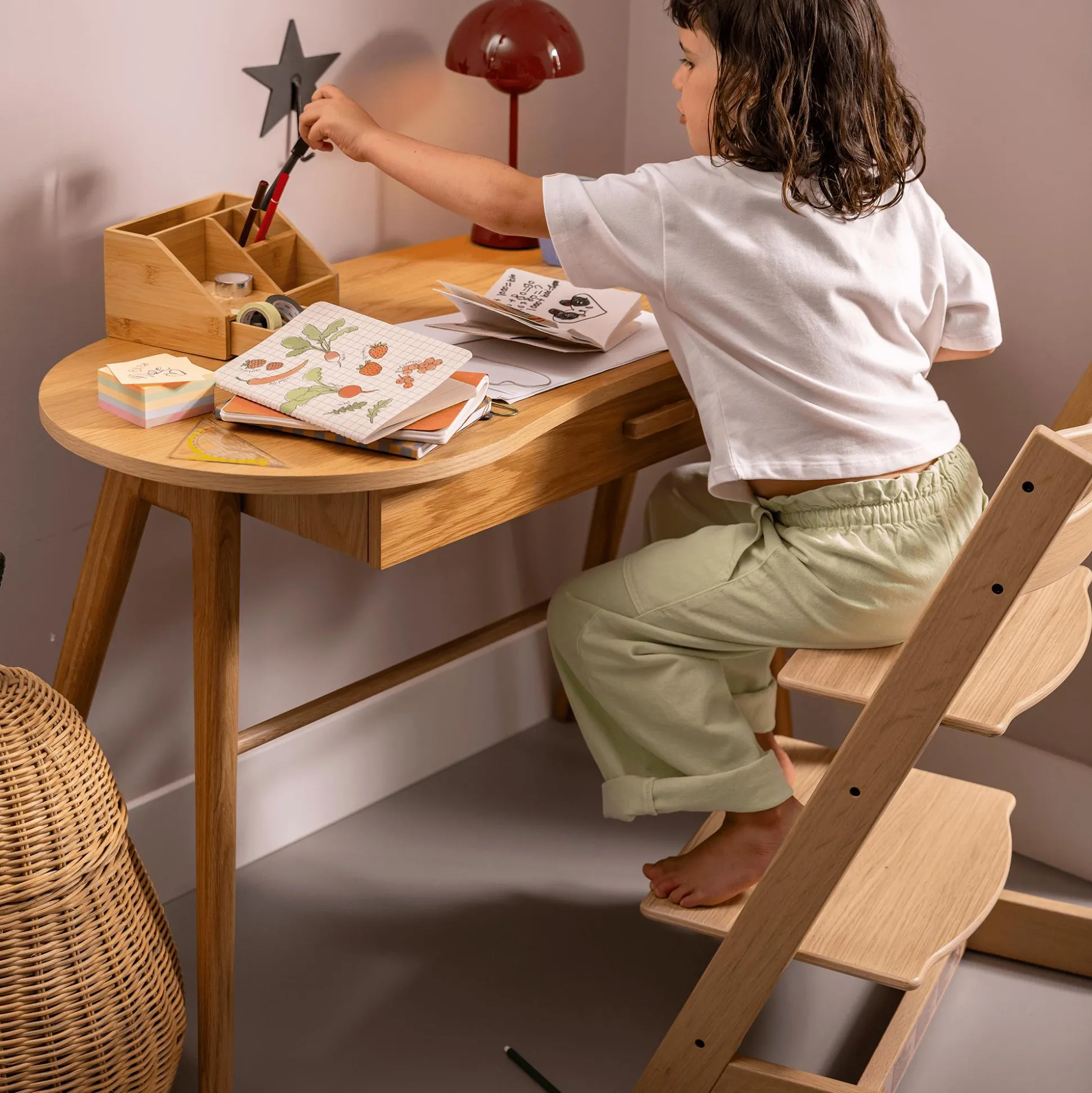 Den Tripp Trapp® in Eiche gibt es in mehreren eleganten Farben, so vielseitig, dass er zu den verschiedensten Interiors passt. Die Tripp Trapp® Eichen Kollektion wurde mit mattem Lack behandelt, der die Qualität und den Eichenholz Look noch hervorhebt. Die Optik verändert sich je nachdem, von welchem Teil des Baumes das Holz für den Hochstuhl stammt. So einzigartig und individuell wie das Baby, das auf dem Tripp Trapp® sitzt.