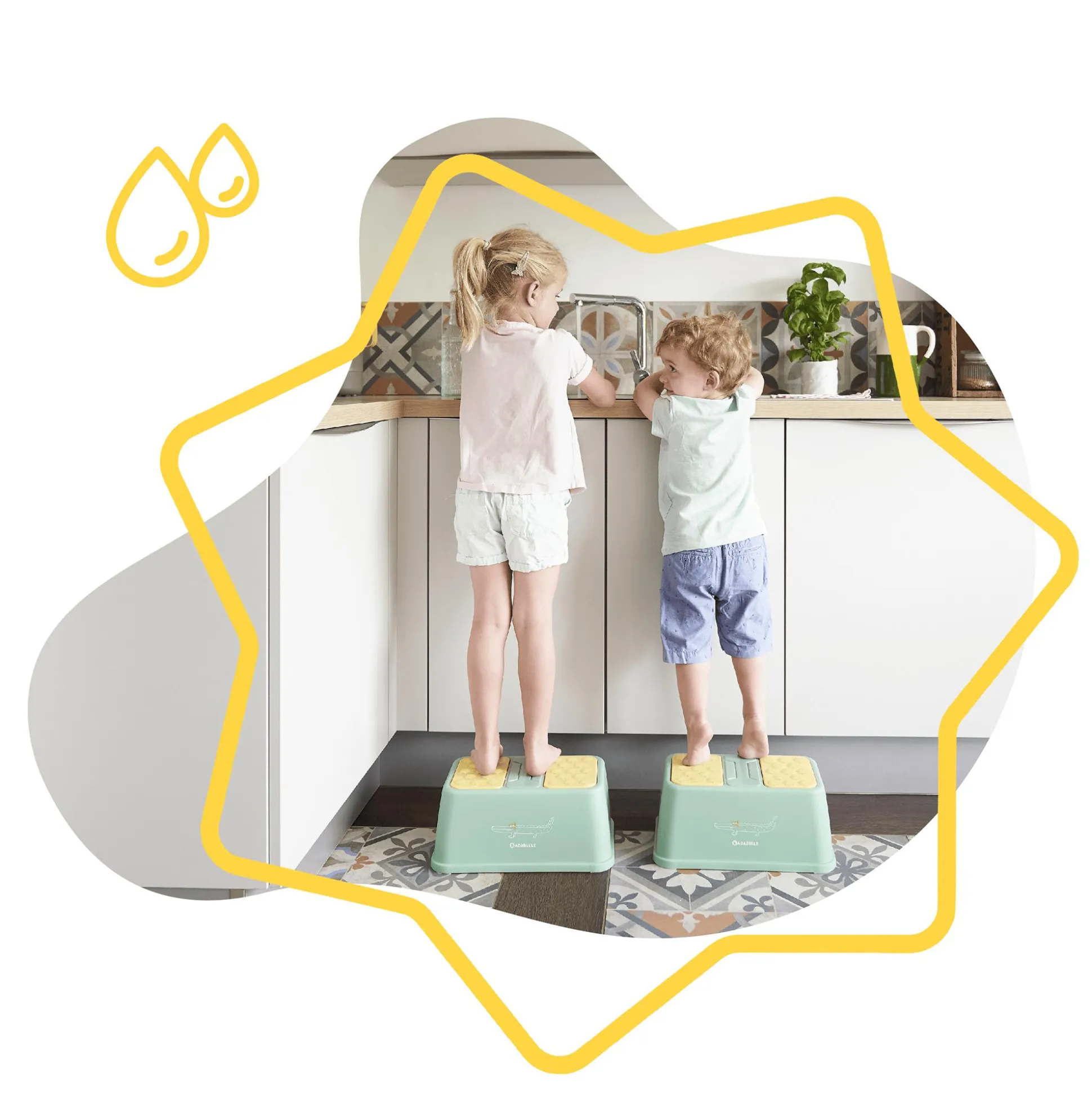 Der Tritthocker sorgt dank 2 großzügigen Antirutsch-Flächen auf der Oberseite und 4 Anti-Rutsch-Flächen auf der Unterseite für Stabilität und Halt in jeder Situation. Er lässt sich bis zu einem Körpergewicht von ca. 60 kg verwenden und ist zugleich so leicht, dass dein Kind ihn selbst tragen kann. Die Reinigung geht ganz unkompliziert mit Wasser und Seife.