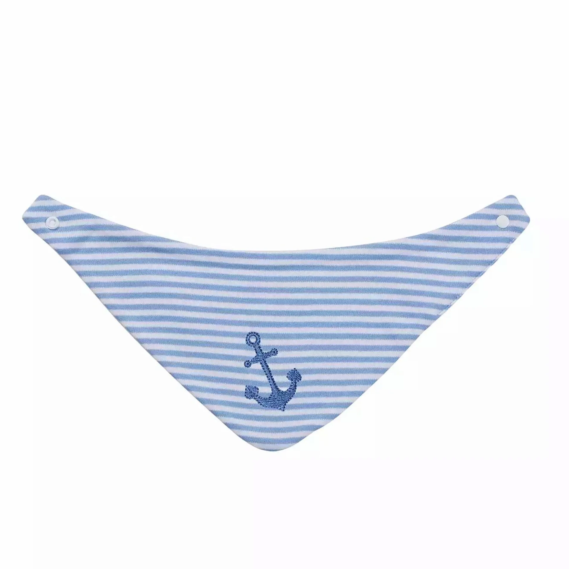 Das Halstuch in klassischem hellblau/weiß gestreift von Hansekind bietet dem kleinen Nachwuchs mit seinem doppellagig verarbeiteten Baumwollstoff hohen Komfort beim Tragen und lässt sich im Nacken durch einen Druckknopf schließen. Ob als Halstuch, als Spucktuch oder einfach als modische Ergänzung, das Tuch passt zu jedem Kleidungsstil. Beide Seiten sind maritim gestaltet. Für den klassischen Look sorgen die fröhlichen hellblauen Streifen mit der edlen Ankerstickerei auf der einen, und das schlichte Weiß mit Schiffchen auf der anderen Seite.