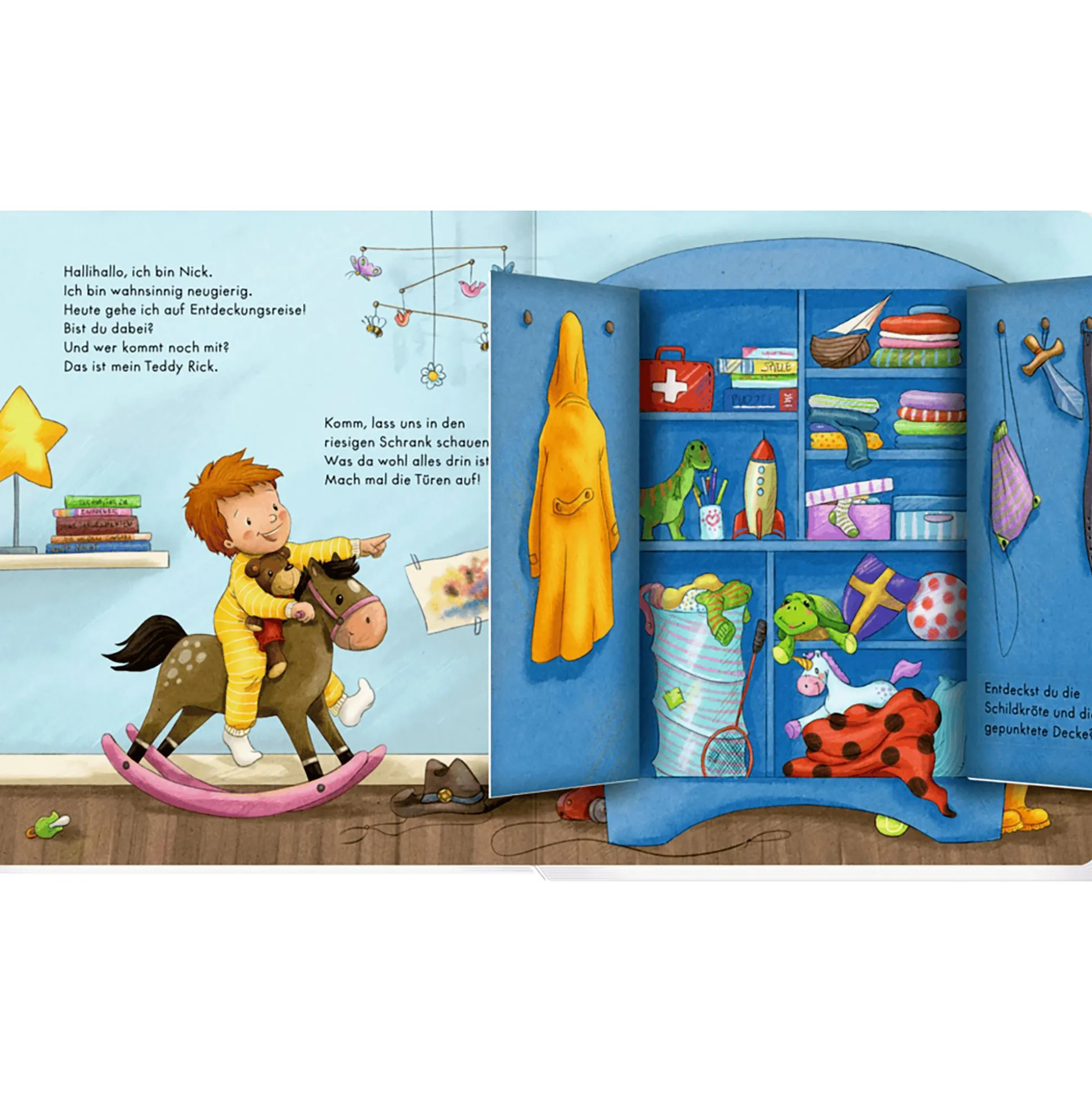 Kommst du mit? Nick geht zu Hause auf Entdeckungsreise. Hinter all den großen Türen gibt es so viel zu sehen! Auf jeder Seite lädt ein kleiner Suchauftrag zum genauen Betrachten ein. Und von Raum zu Raum nimmt Nick mehr Dinge mit. Daraus entsteht auf der letzten Seite eine tolle Überraschung! Wimmeliges Pappbilderbuch mit riesigen Klappen für Kinder ab ca. 1 Jahr.
