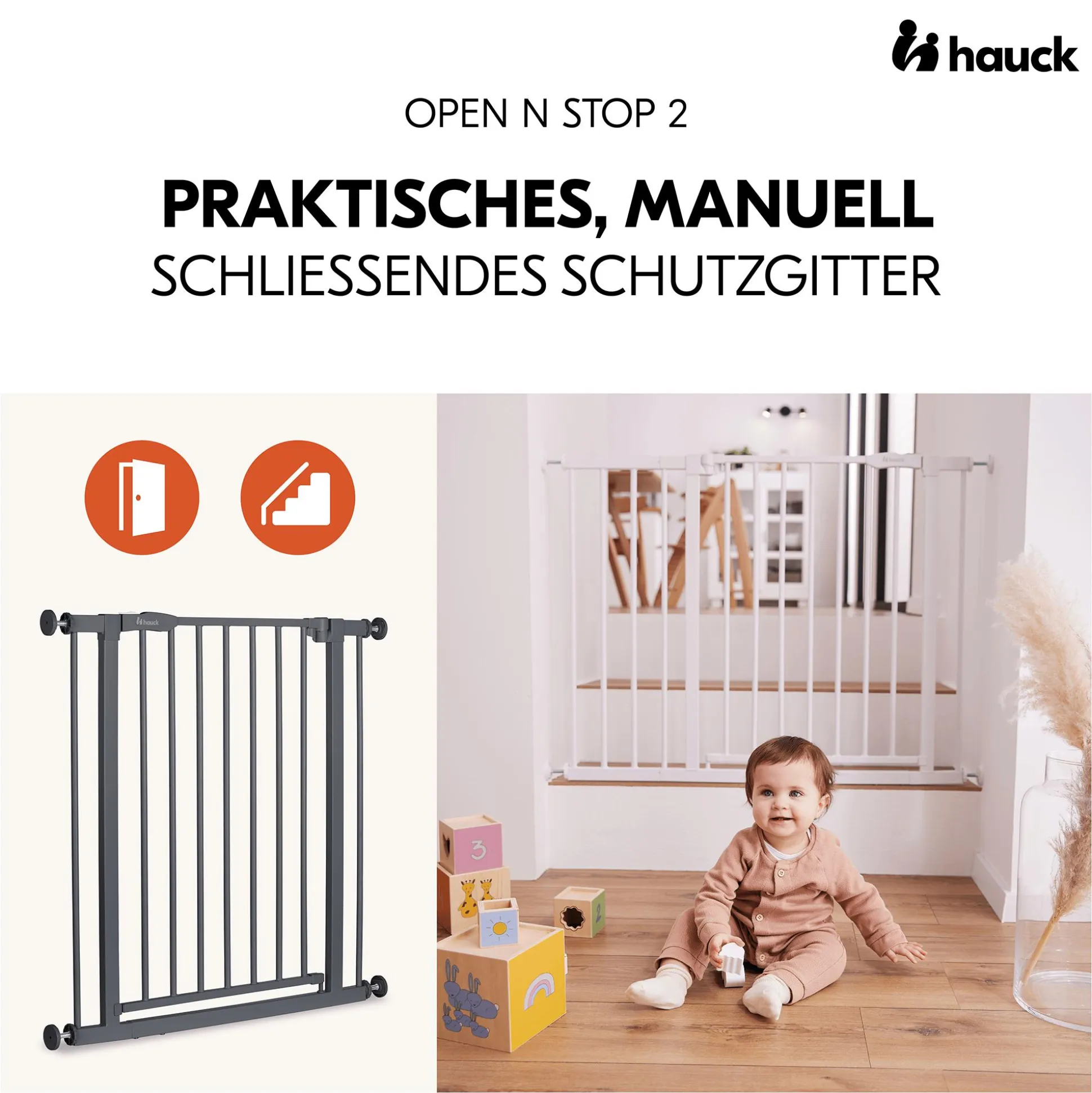 Das Kinderschutzgitter Open N Stop 2 Dark Grey von hauck bietet dir und deinem kleinen Liebling eine sichere und flexible Absicherung für Türen und Treppen. Dabei kannst du das stabile Metallgitter einhändig in beide Richtungen öffnen und sicher schließen.Dazu ist die Montage dank der praktischen Druckbefestigung mit Stellschrauben schnell erledigt – ganz ohne Bohren und rückstandslos entfernbar.