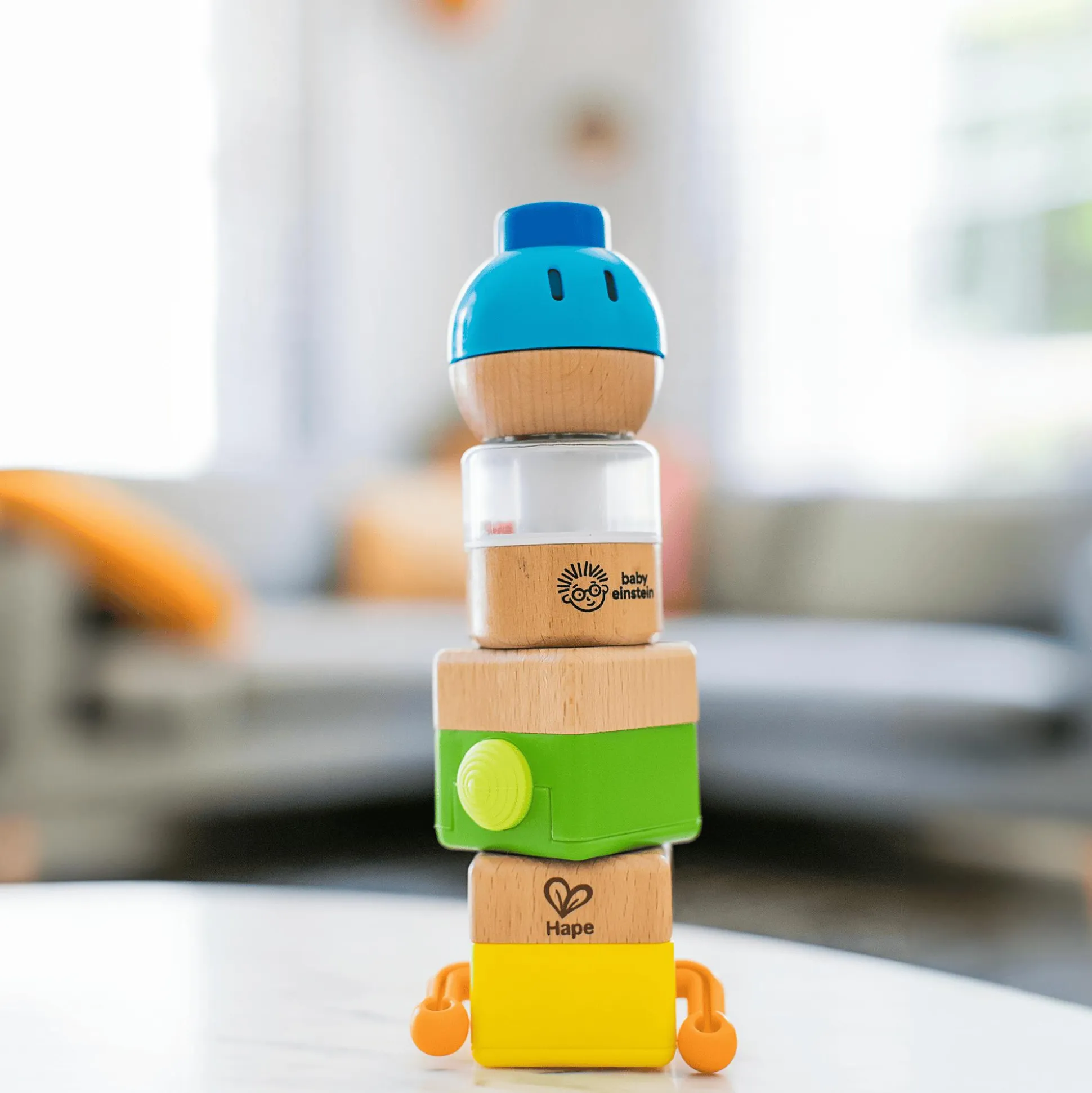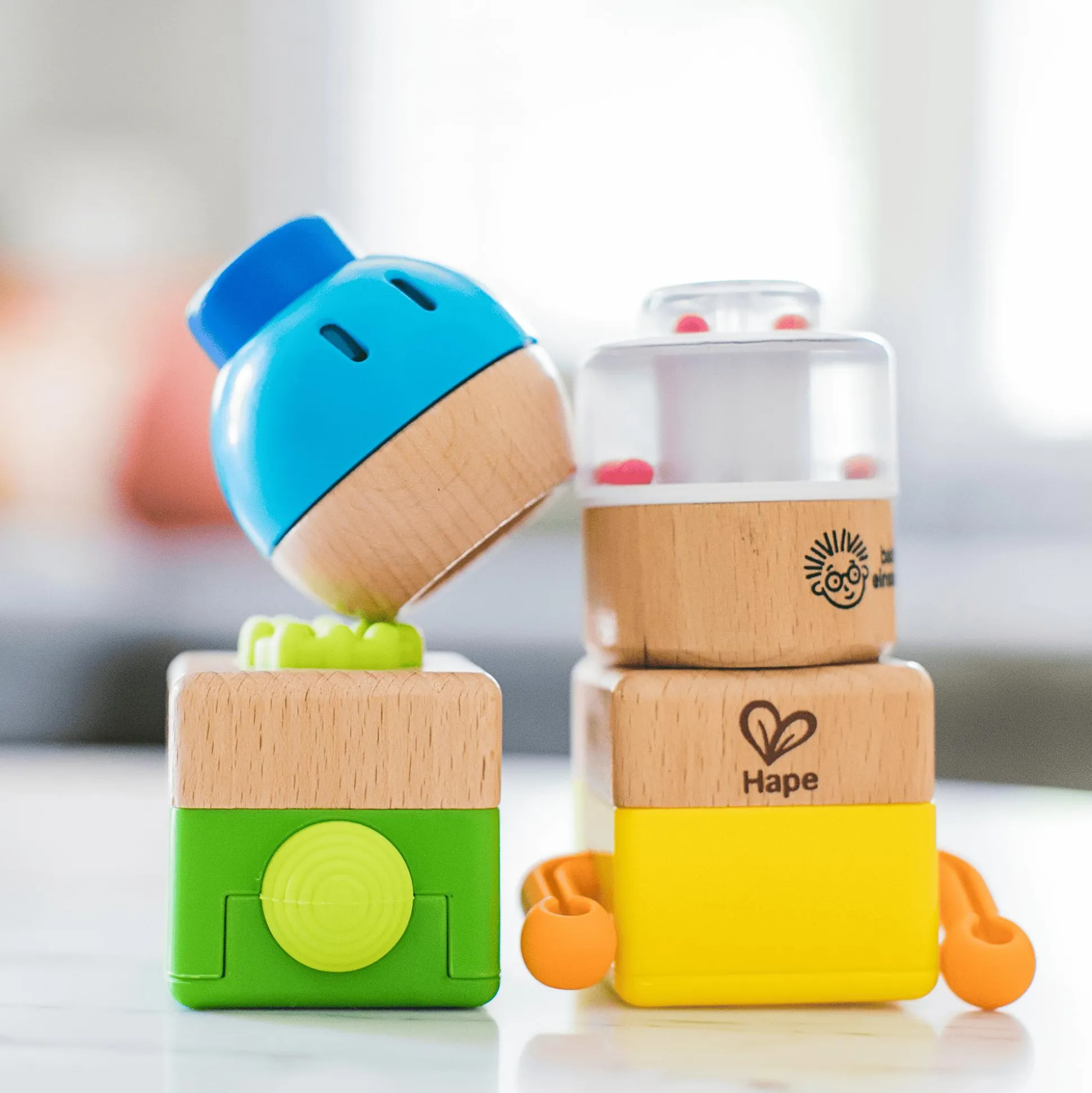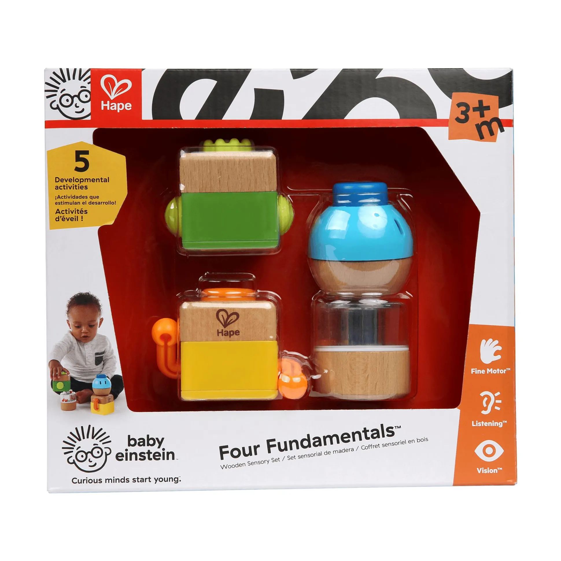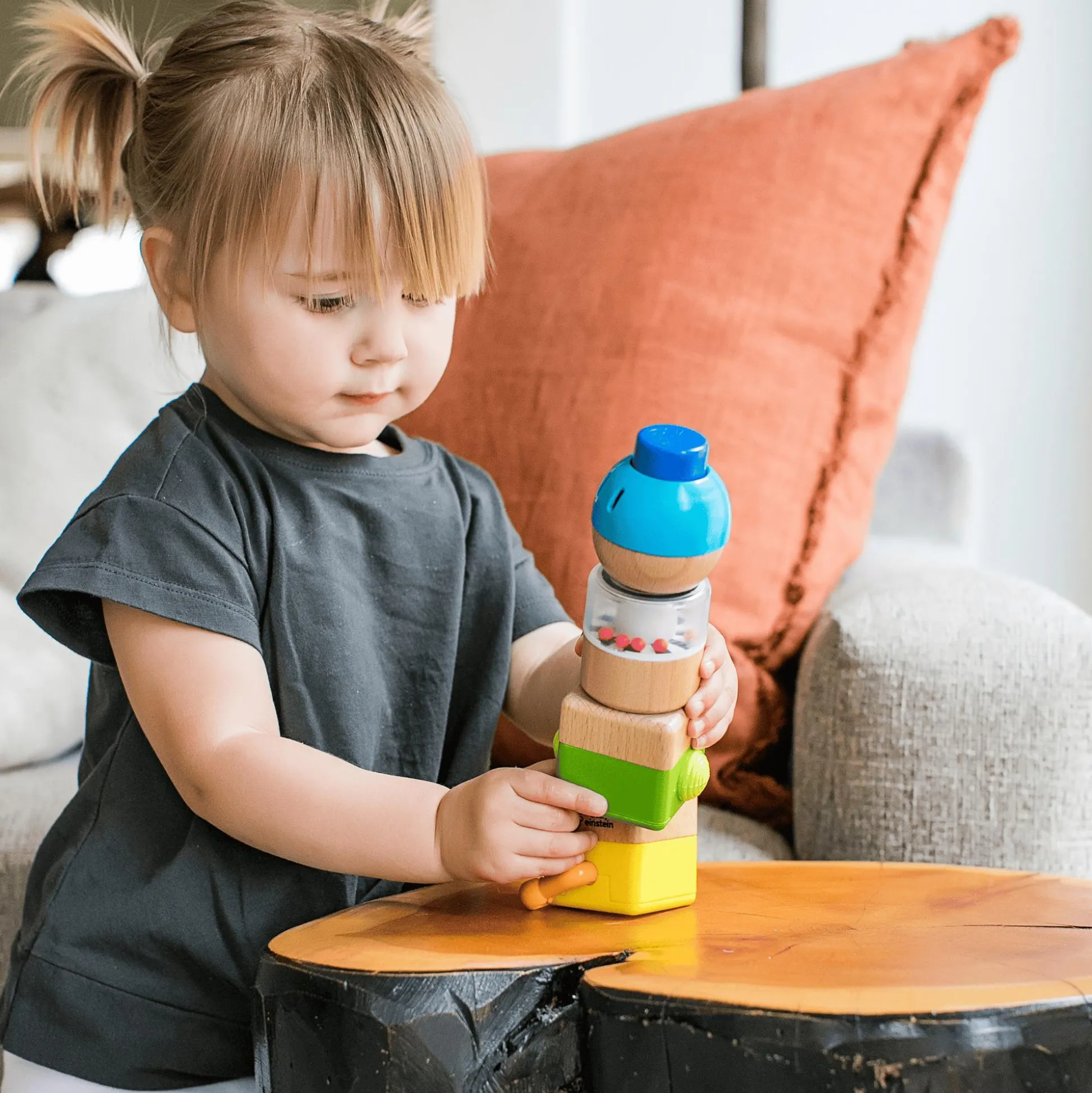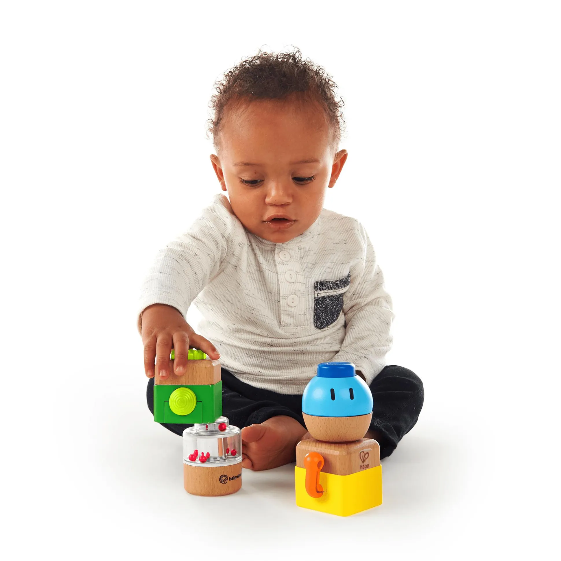 Vier verrückte Bausteine von Hape ist ein aufregendes Spielzeug für dein Baby ab ca. 3 Monaten, das Sinne und Motorik gleichermaßen fördert. Die innovativen Klötze bestehen aus einer Kombination von Holz und Kunststoff und bieten eine Vielfalt an Entdeckungsmöglichkeiten.Jeder Baustein überrascht mit spannenden Details, wie einer Rassel oder einem Quietscher, die dazu einladen, Farben, Geräusche, Materialien und Bewegungen spielerisch zu erforschen.