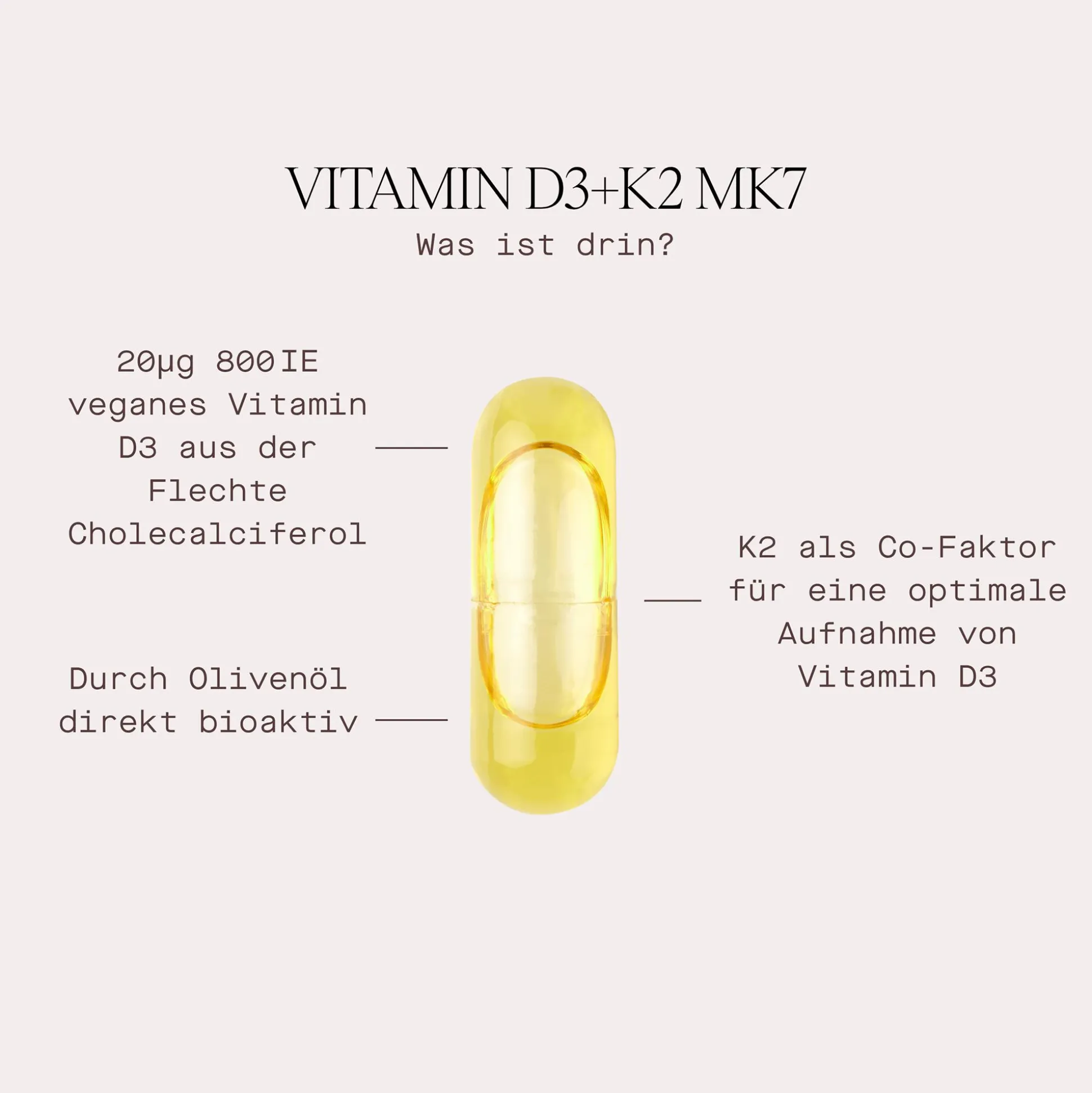 - hochwertige Kombination aus bioverfügbarem Vitamin D3 und K2